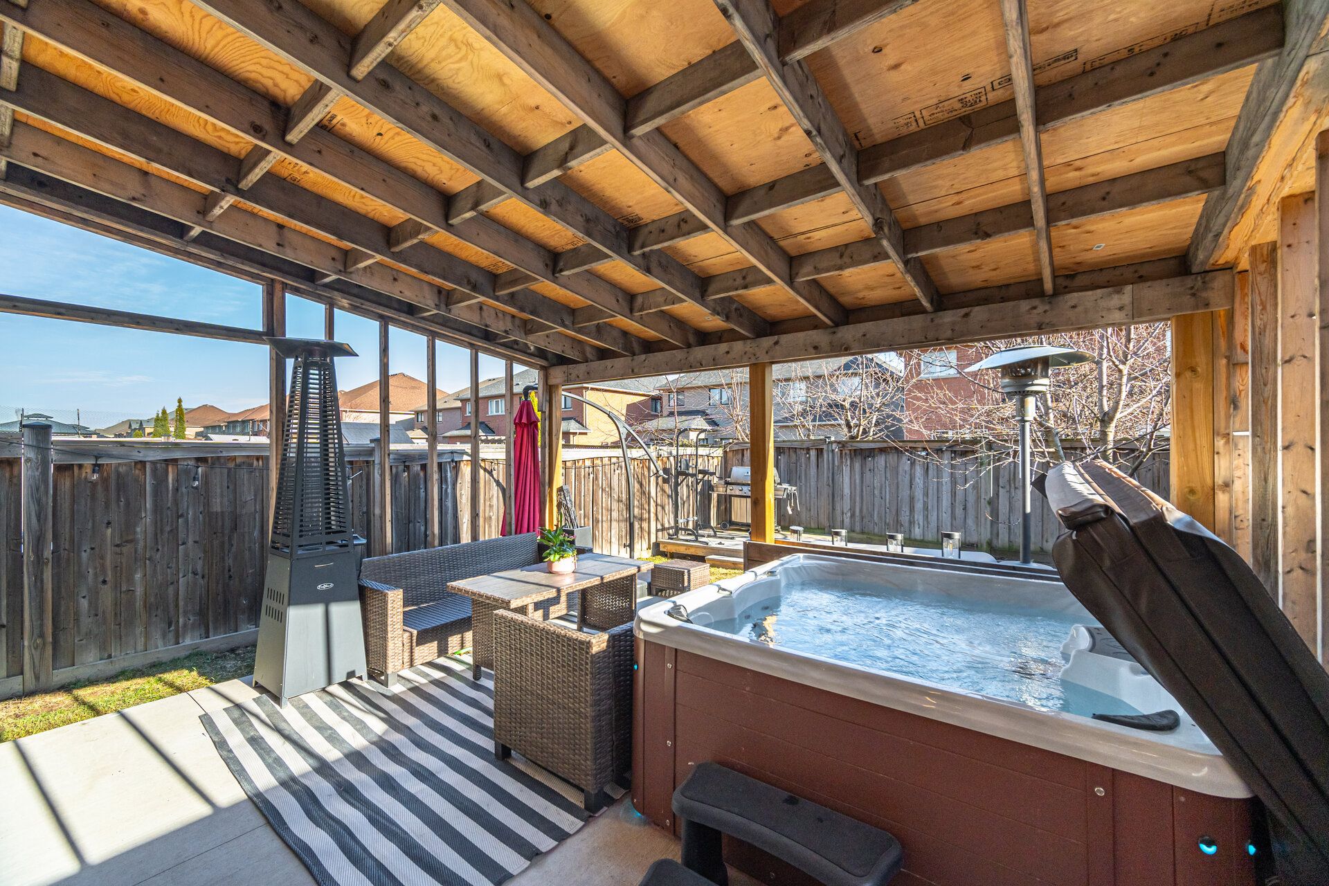 • Private backyard with a covered patio, jacuzzi, and BBQ area.