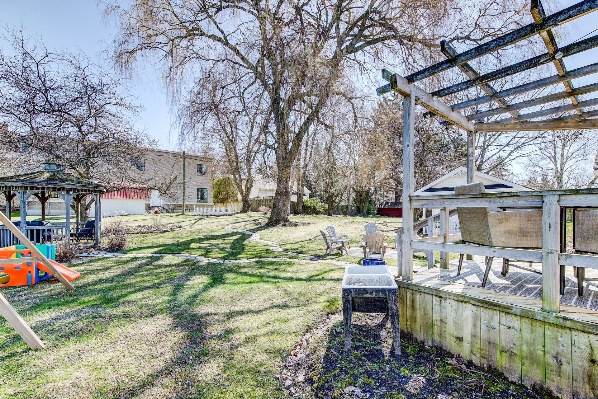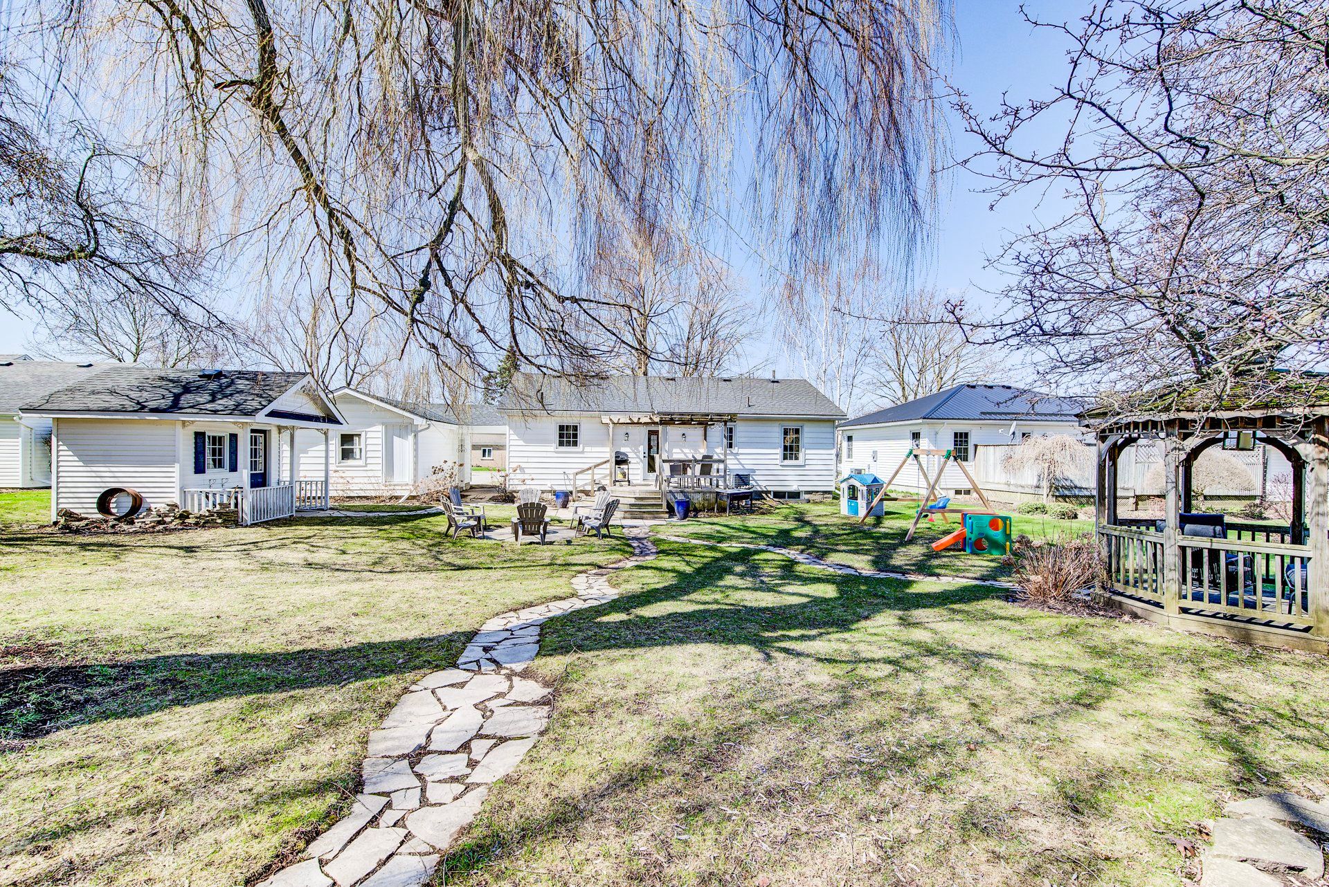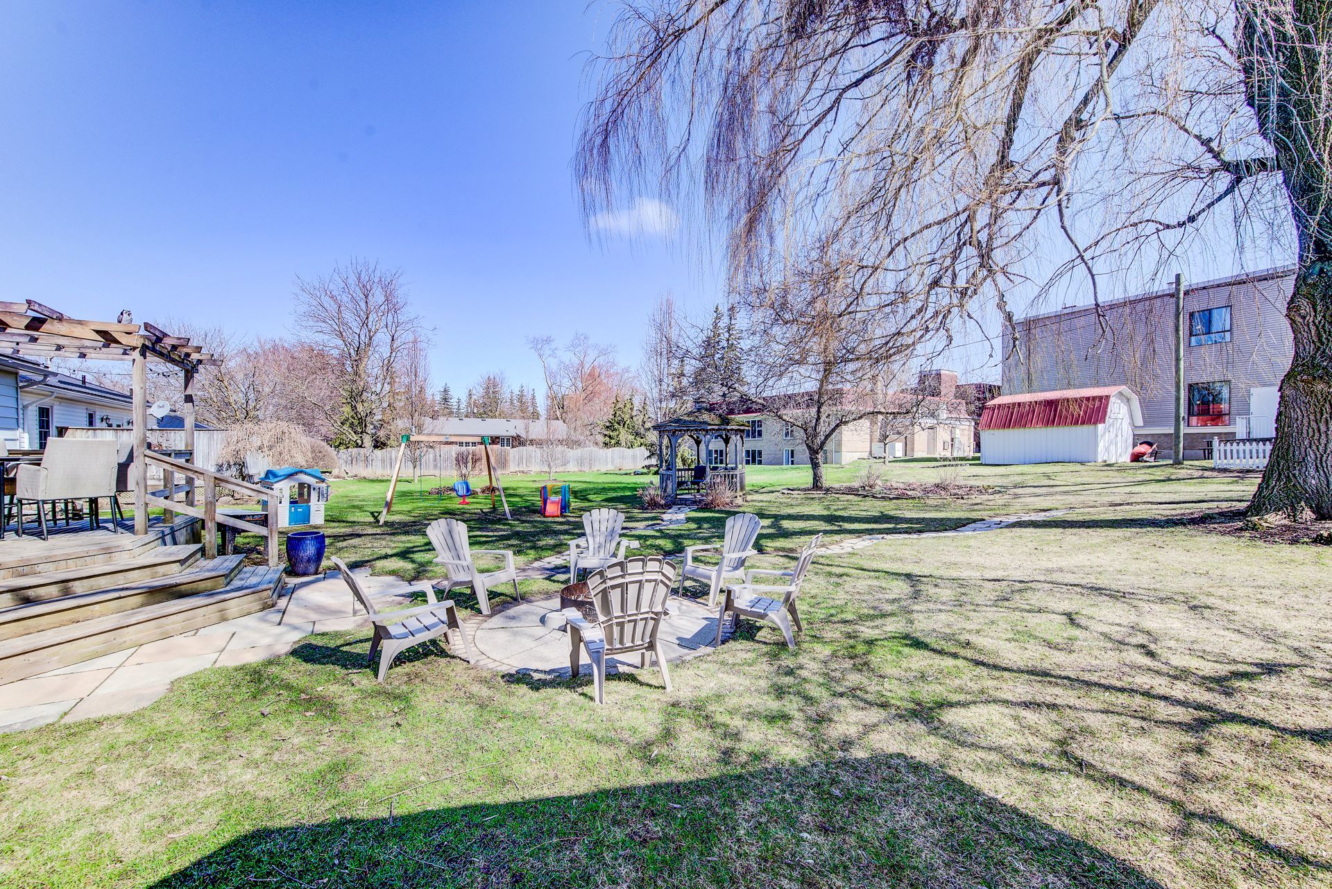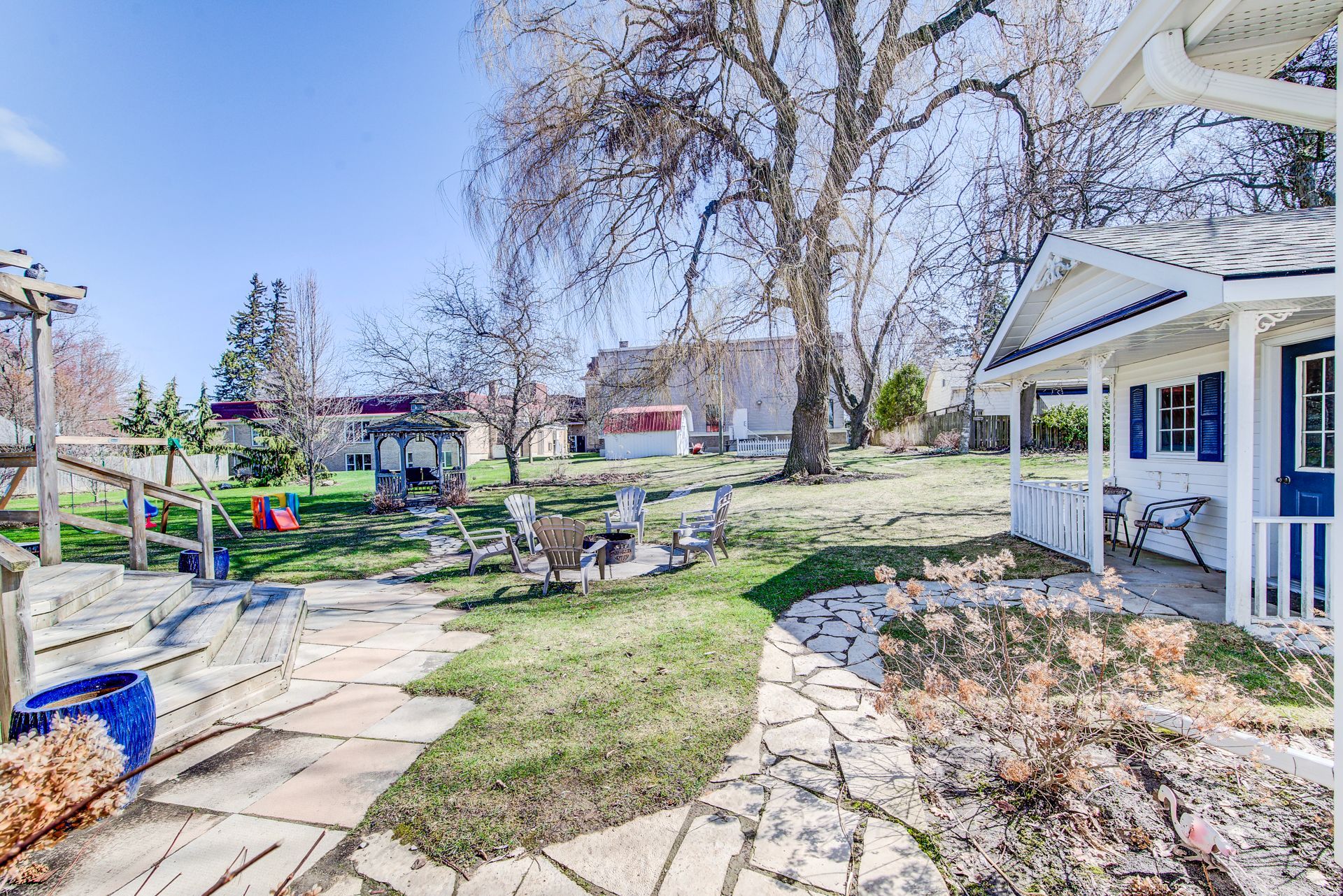 • Large park-like lot with gazebo, fire pit, and deck for outdoor gatherings.