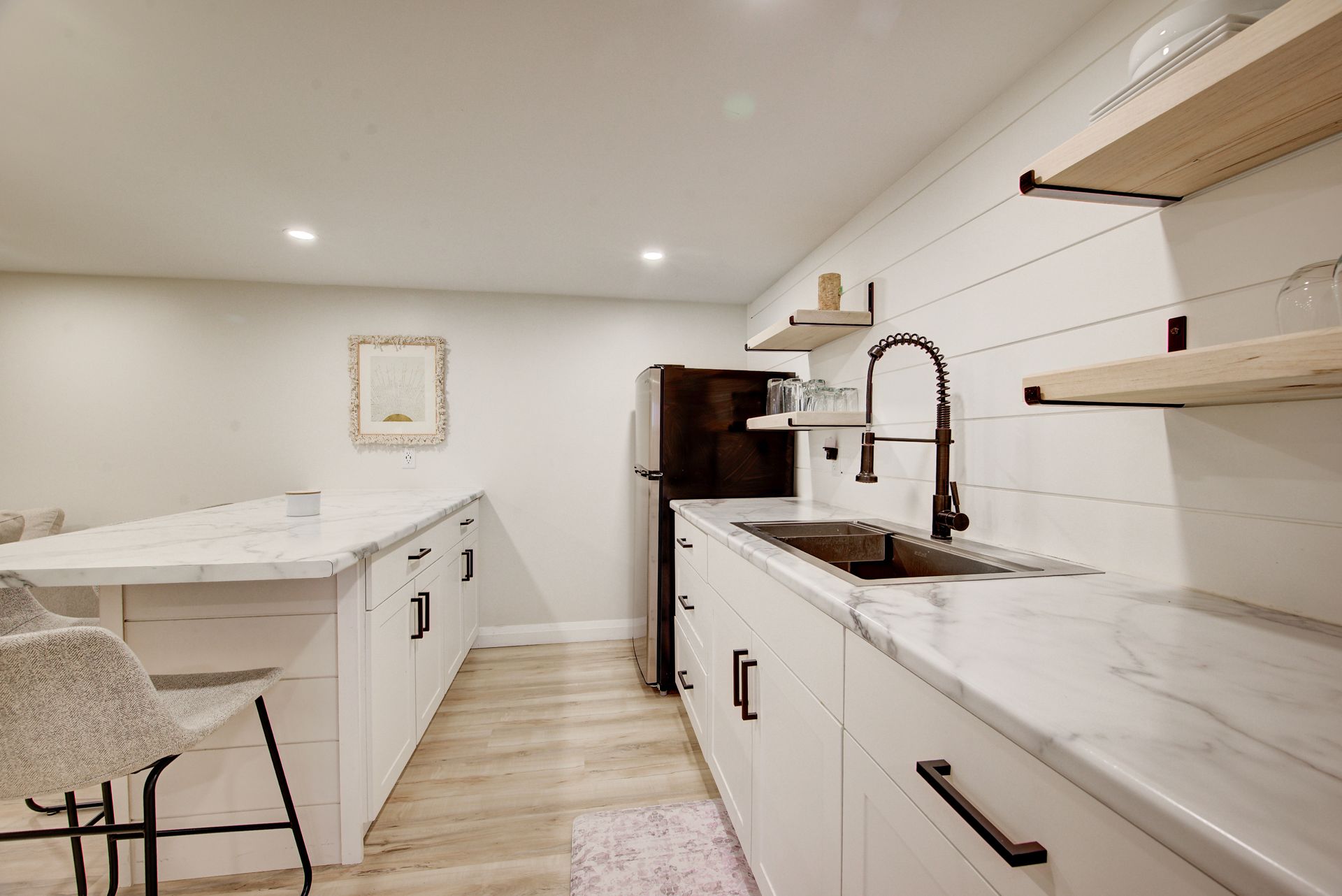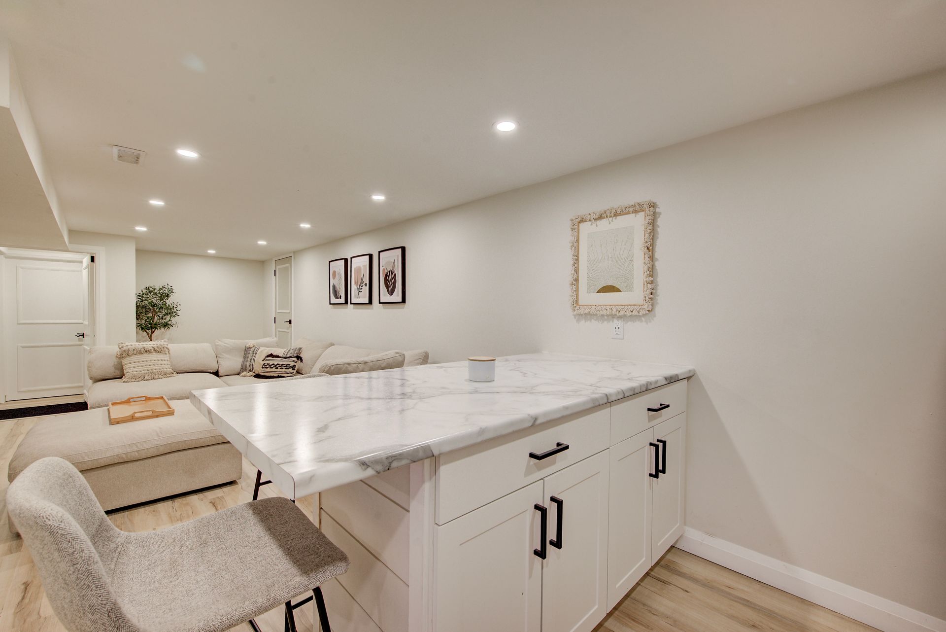 • Kitchen features an 8 ft island, upgraded cabinetry, and a stunning bar area.