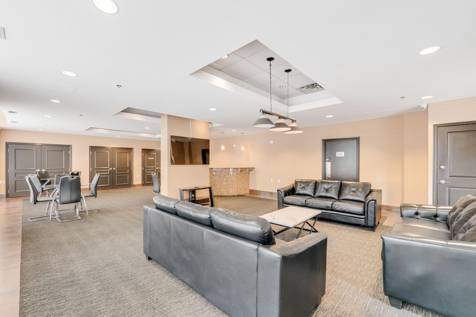 • Building amenities include a gym, sauna, and rooftop BBQ terrace.