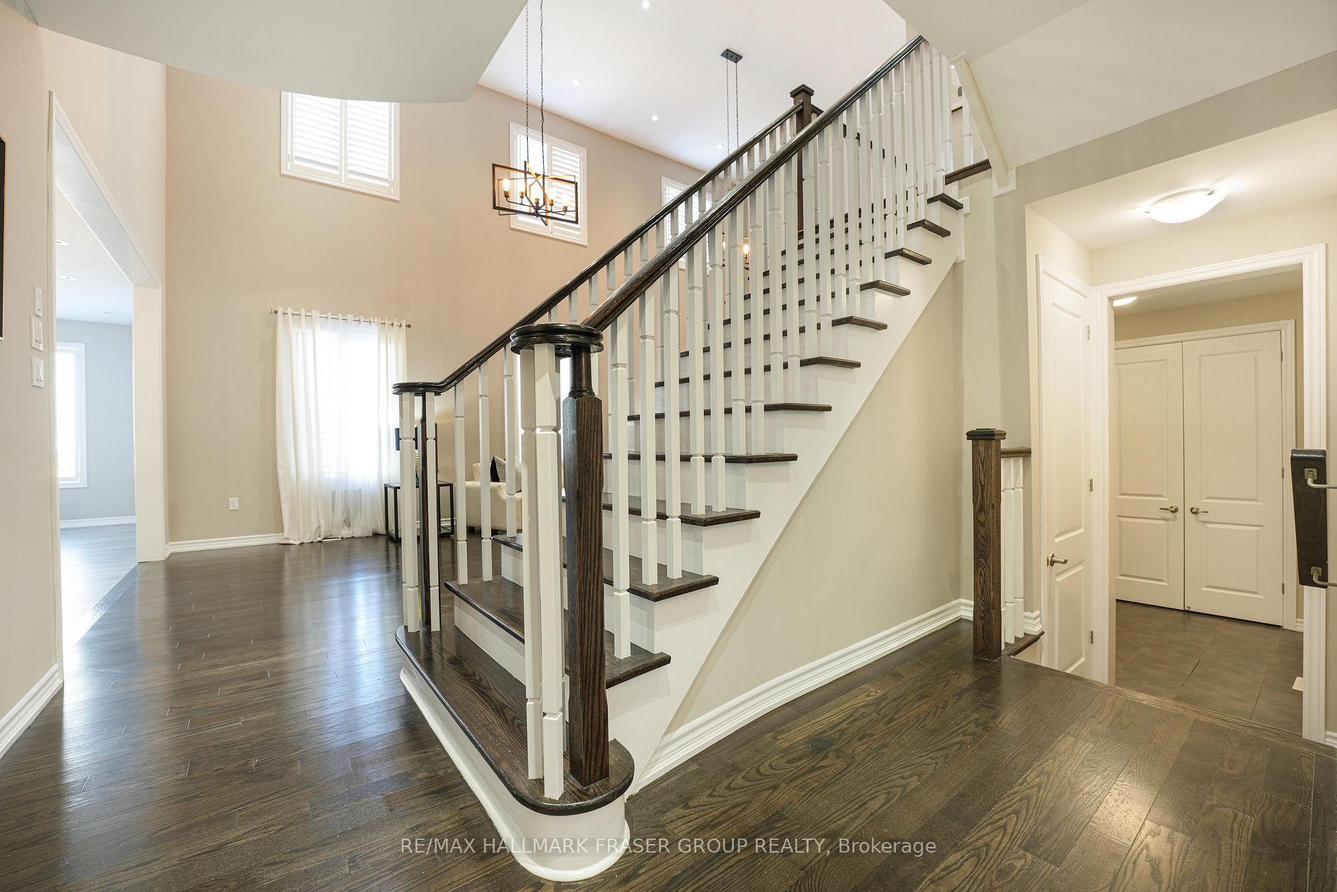 Welcome to 875 riverside dr, where timeless elegance meets modern luxury. From the moment you arrive, the striking stone and brick exterior makes a lasting impression. Inside, this home is designed to impress, featuring custom illuminated tray ceilings and designer light fixtures that elevate its sophistication and style throughout. At the heart of the home, the kitchen is nothing short of spectacular. A stunning island takes center stage, surrounded by stainless steel appliances, ample cabinetry, custom countertops, and a bright breakfast area. The sunlit living room welcomes you with a large window, flowing seamlessly through elegant archways into a dining room graced with a statement chandelier. The grand family room can be viewed from the second-floor balcony, offering a breathtaking perspective of its soaring double-height ceilings, abundant natural light, and cozy modern fireplace. This open-concept overlook enhances the home's spacious feel, creating a seamless connection between levels while adding to its architectural elegance. The primary bedroom is a true sanctuary, featuring a spa-like 5-piece ensuite the pinnacle of indulgence complete with a grand soaker tub, jack and jill sinks, a sleek glass shower, a private water closet, and an elegant chandelier that adds a touch of opulence. Three additional spacious bedrooms, each with double-door closets, offer both comfort and convenience. Outside, the expansive backyard provides endless opportunities for relaxation and entertainment. Nestled in a prime ajax location, 875 riverside drive offers the perfect balance of tranquility and convenience. Just minutes from highway 401 and the ajax go station, commuting is effortless, while the surrounding conservation areas, scenic trails, and lush green spaces provide a serene escape right at your doorstep.