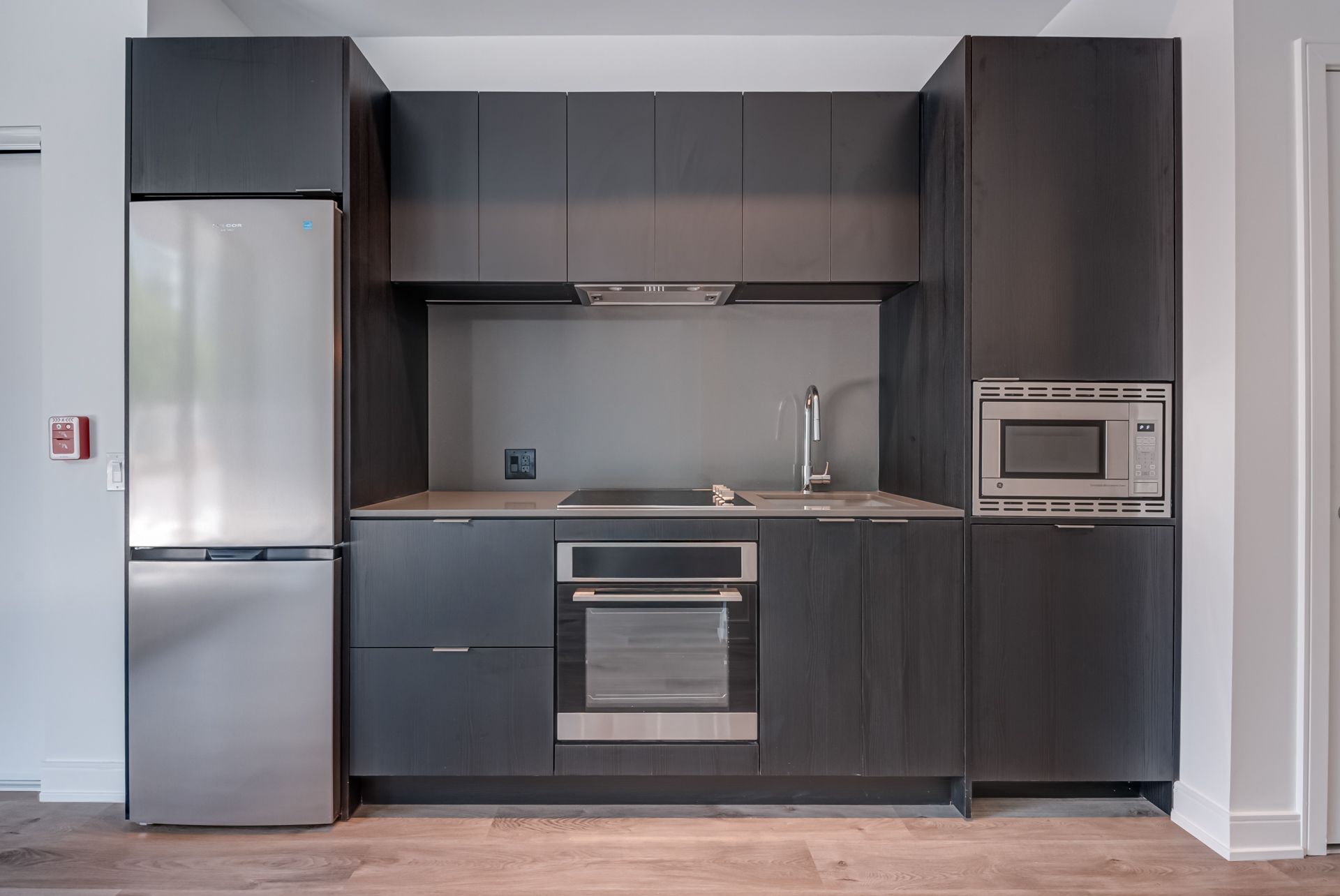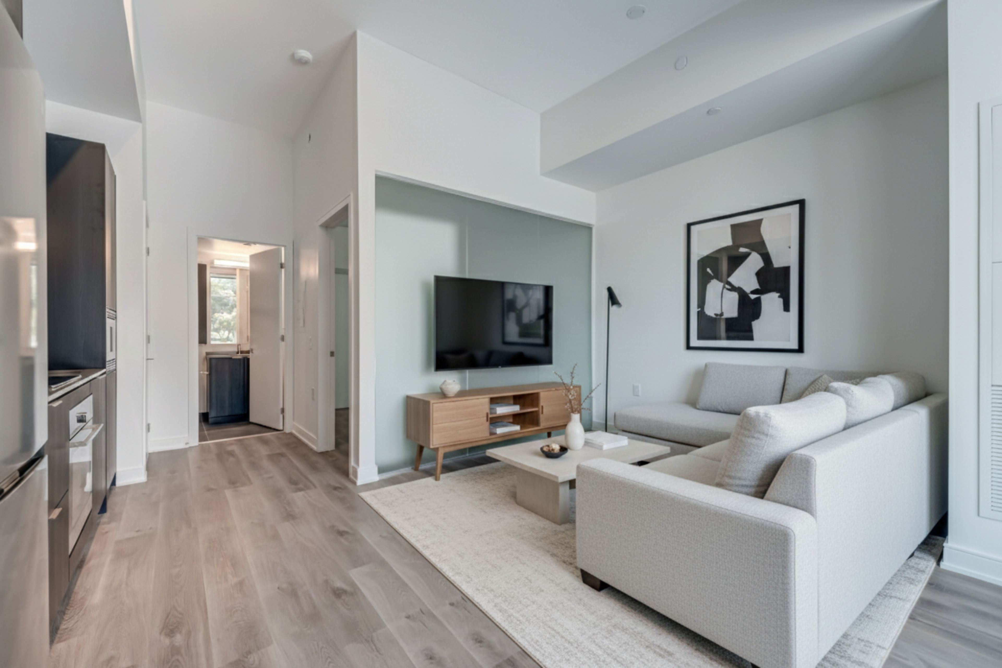 • Modern kitchen equipped with stainless steel appliances and in-suite laundry.