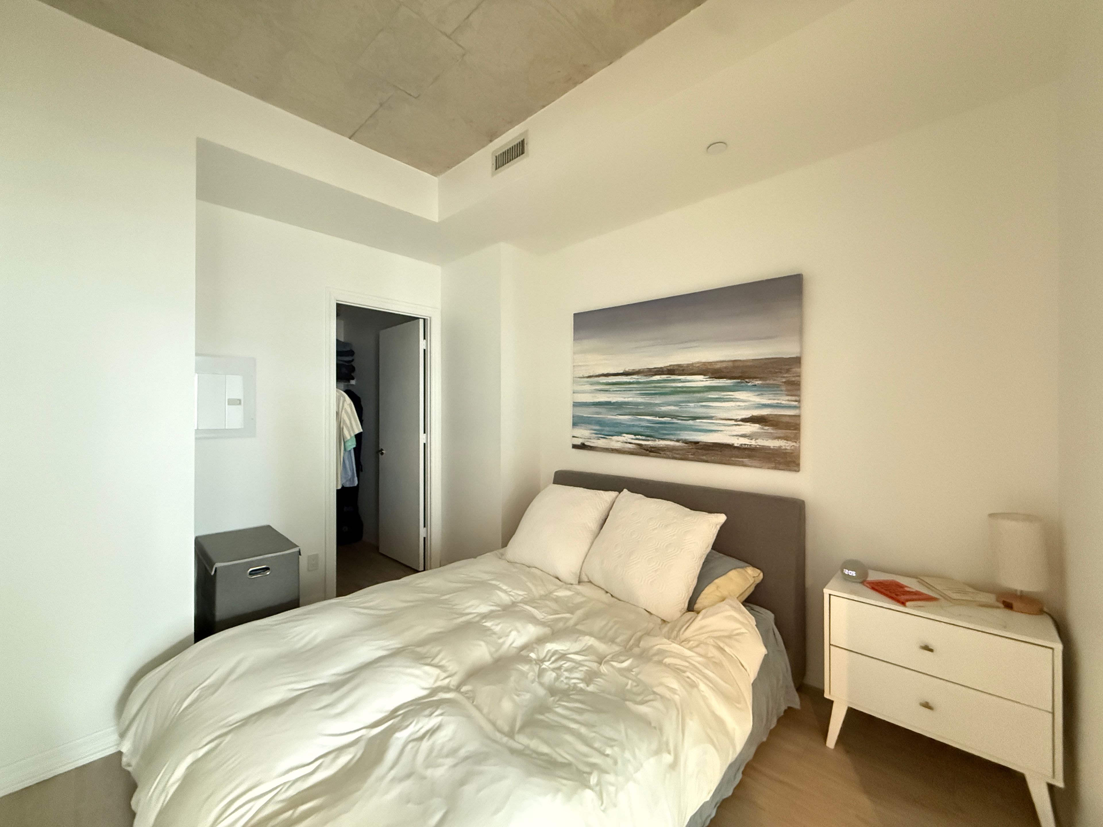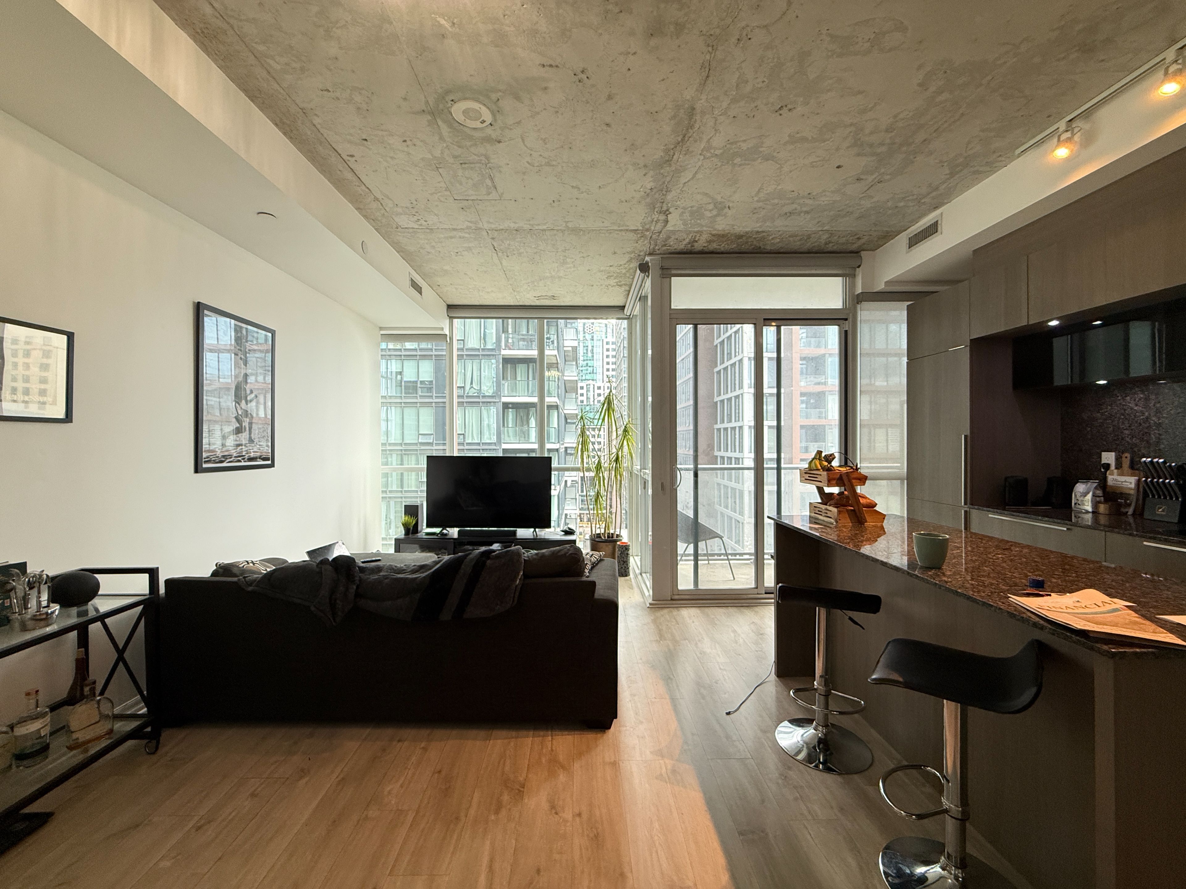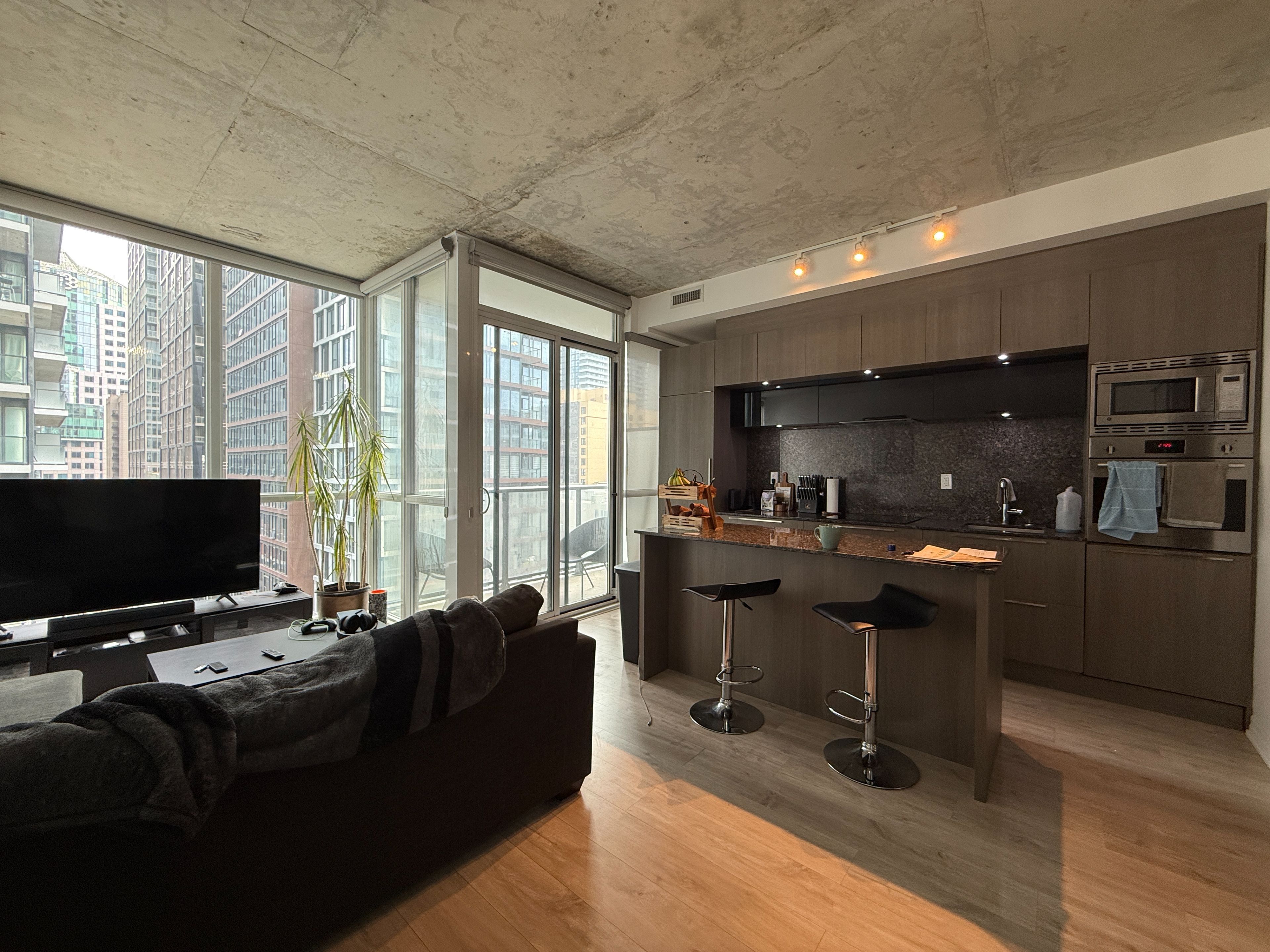 Prestigious bisha hotel & residences in the heart of the entertainment district. Walking distance to countless city attractions, restaurants, theatres, bistros and shops. Spacious 1br + den has been freshly painted and cleaned. Ready to move in and enjoy the contemporary finishes and unique design. The floor to ceiling windows allow maximum sunlight. East facing with open balcony and 9ft exposed concrete ceiling make this a sought after unit.
