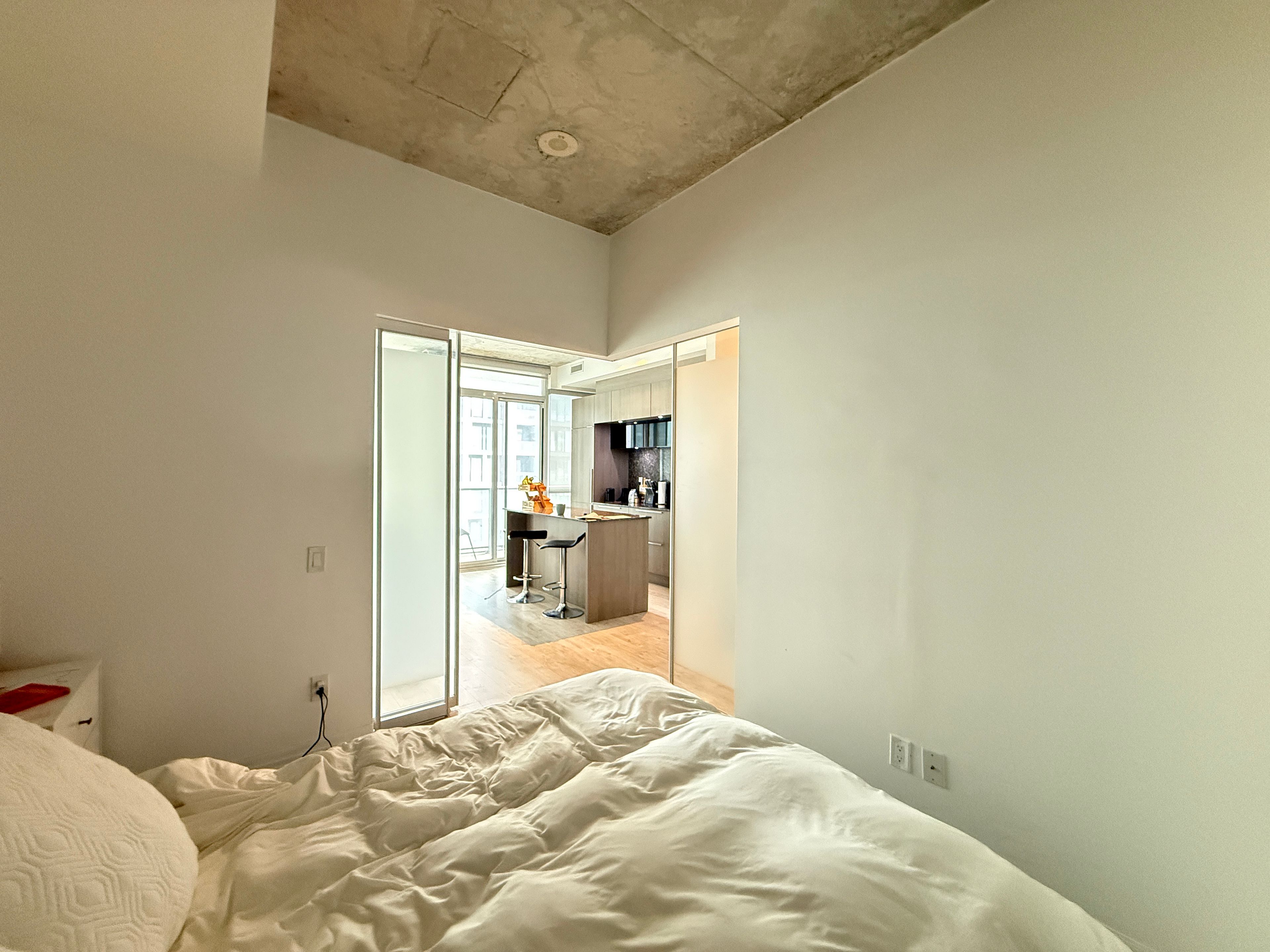 • East-facing unit with open balcony and 9ft exposed concrete ceiling.