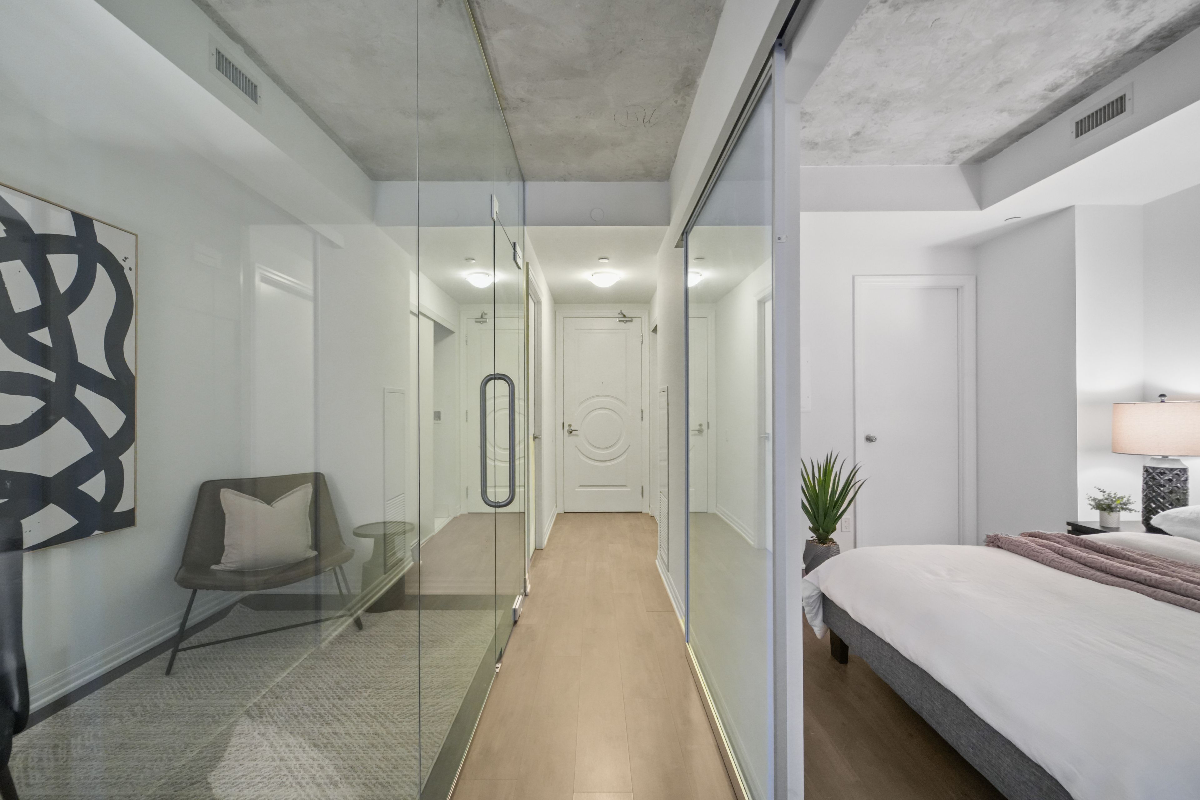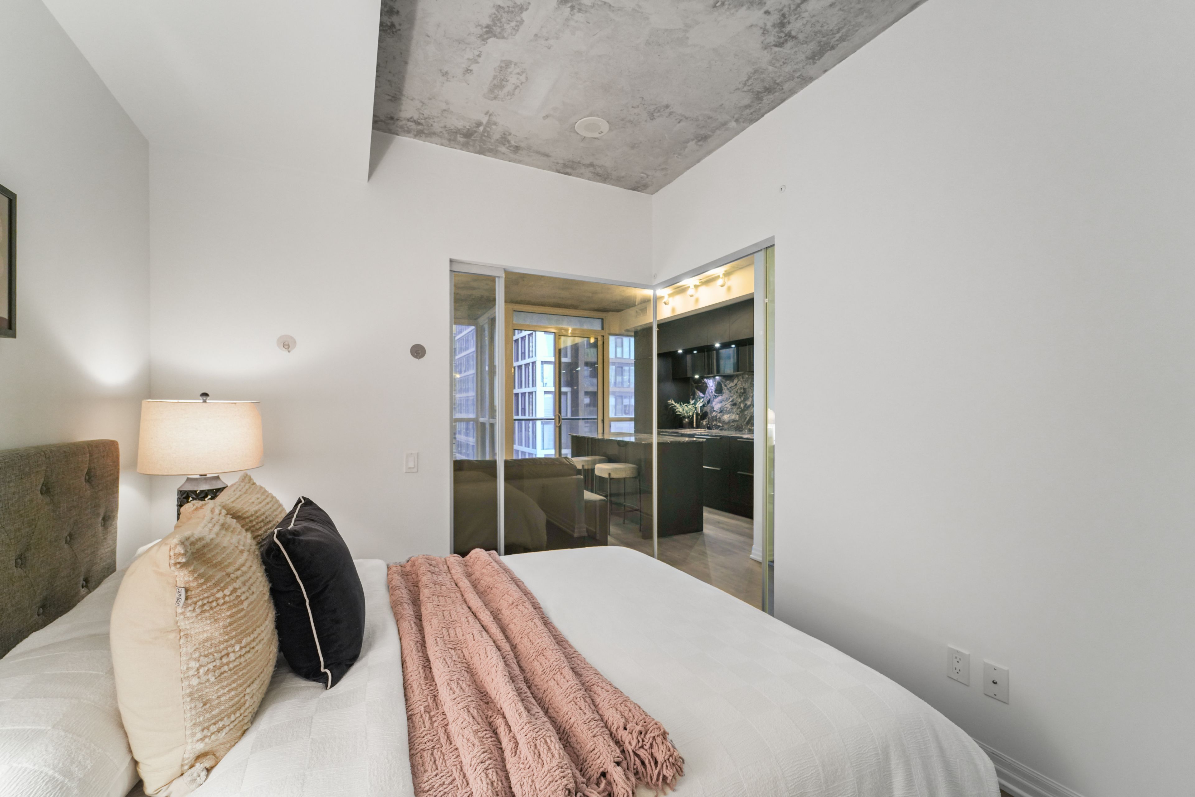 At the iconic bisha hotel & residences, this beautifully designed 662 sf suite offers a rare convergence of world-class design and hotel-grade luxury, right in the heart of toronto's entertainment district. Step inside to a welcoming space that opens to a striking glass-enclosed den, an ideal home office or creative workspace. The hallway leads into an open-concept living space where exposed concrete ceilings, hardwood floors, and floor-to-ceiling windows create a modern, loft-inspired aesthetic. The sleek designer kitchen, crafted with interiors by studio munge and kravitz design inc., features bold quartz countertops, a centre island, a custom marble backsplash, integrated stainless steel appliances, and generous prep space that flows naturally into the living and dining area, making it perfect for entertaining or casual dining. Beyond the living space, sliding doors lead to a private balcony overlooking the vibrant downtown skyline and the cn tower. The thoughtfully separated bedroom provides a quiet retreat with ample storage, and convenient access to an updated 4 piece bath. Residents enjoy access to full-service amenities including a rooftop infinity pool, a state-of-the-art fitness centre, a billiards room, a party lounge, and 24-hour concierge service and more. Enjoy on-site fine dining option, including the acclaimed akira back and kost, one of the city's most coveted rooftop destinations. Located steps from rogers centre, scotiabank arena, the underground path, and tiff bell lightbox, this residence places the very best of downtown toronto at your doorstep.
