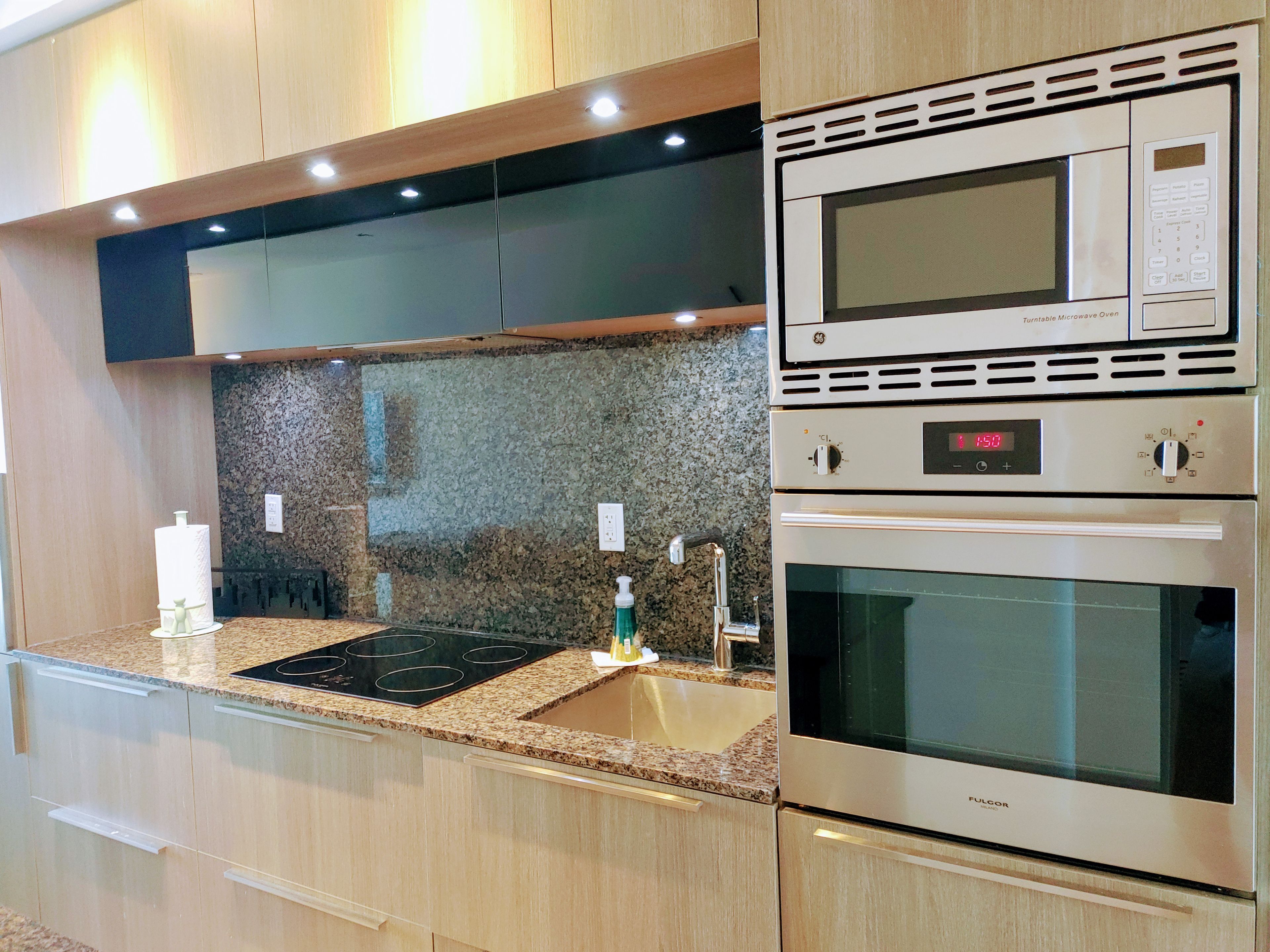 • Luxurious marble bathroom and modern kitchen with quartz countertops.