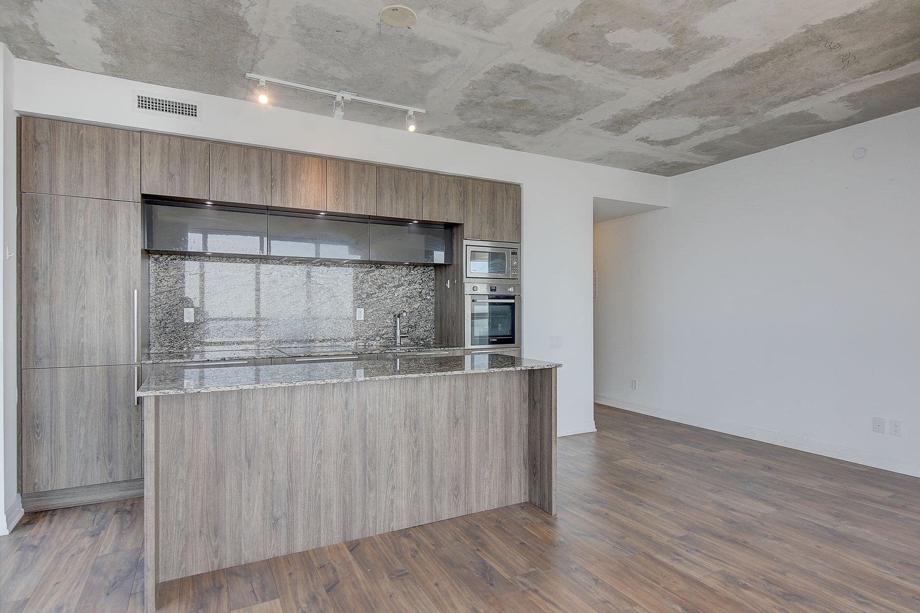 • Modern kitchen features an island and granite countertops for convenience.