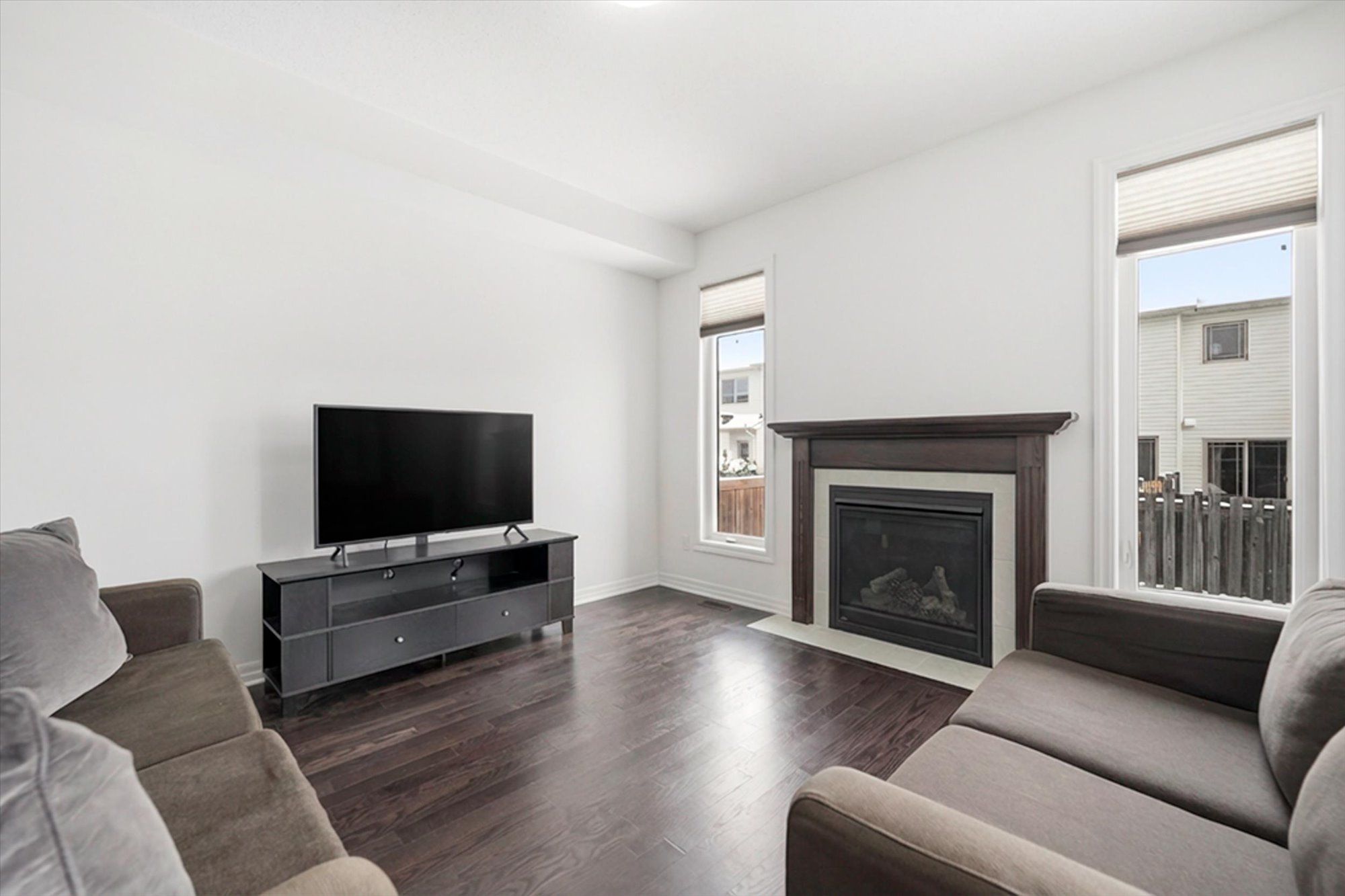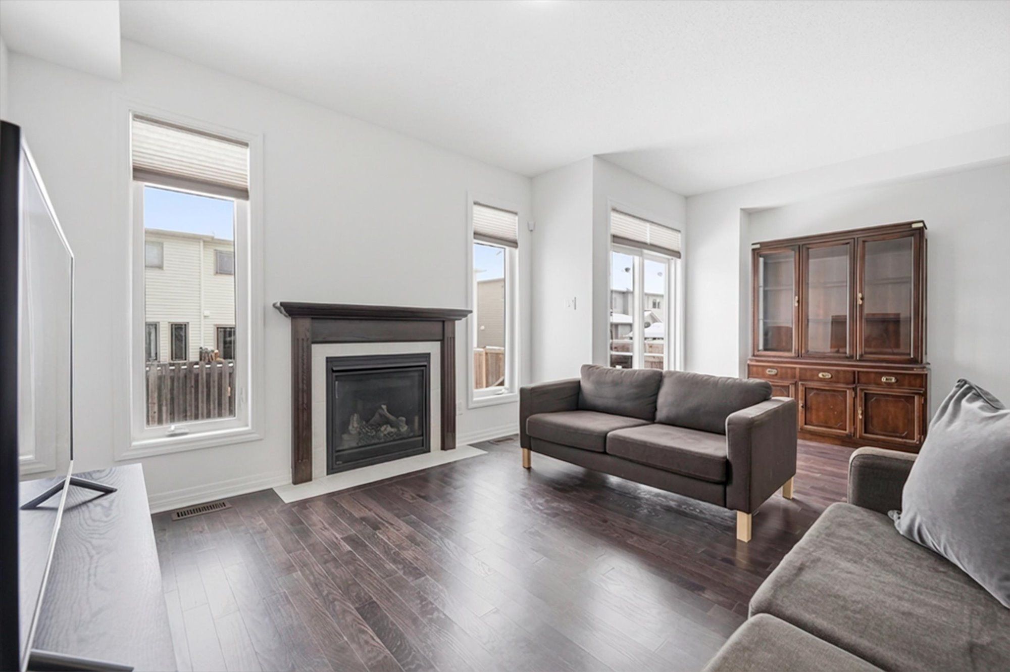 • Open-concept main floor with hardwood flooring and cozy gas fireplace.