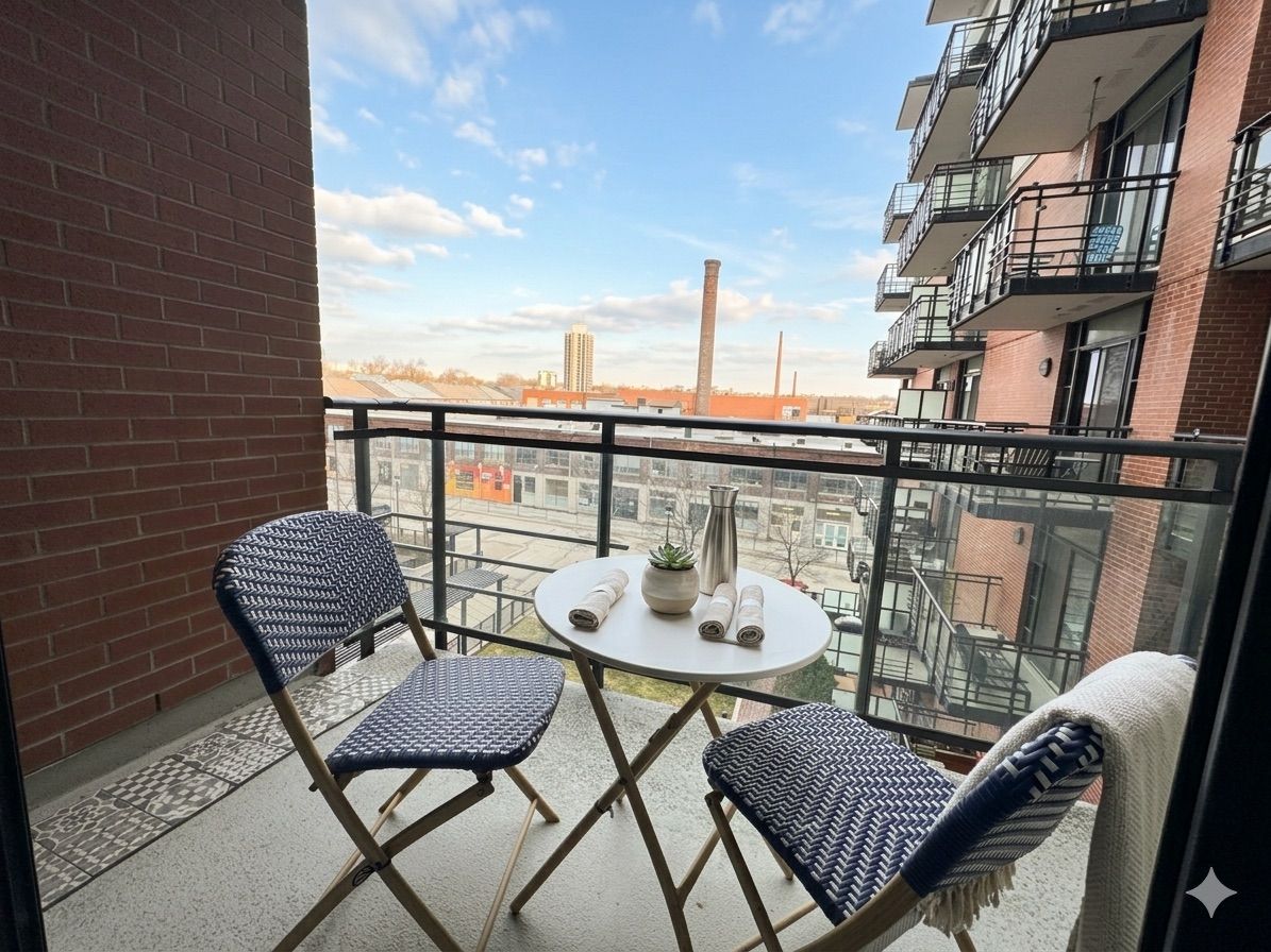 Not your typical 1-bedroom. Prime leslieville location. This standout unit at showcase lofts delivers a rare combination of features, starting with a wider-than-average layout that offers a more functional, comfortable living space-ideal for entertaining, dining, or working from home. Modern finishes blend seamlessly with authentic loft character, including 9-ft smooth ceilings, engineered hardwood flooring, and a reclaimed brick feature wall that adds warmth and texture. The kitchen is both stylish and practical, featuring quartz countertops, stainless steel appliances, under-cabinet lighting, built-in wine rack, oversized under-mount sink, breakfast bar, and a gas stove-a true rarity. The bedroom is equally impressive with a walk-in closet, floor-to-ceiling windows, custom blinds, and a double walk-out to a large northwest-facing balcony overlooking the landscaped courtyard-quiet, private, and highly usable. Includes parking and locker. Well-managed building with full amenities: concierge, gym, party room, theatre/media room, guest suites, bbq area, and visitor parking. Steps to queen east's cafés, restaurants, and boutiques, with easy access to transit and the dvp. A rare opportunity for buyers seeking more than the standard layout.