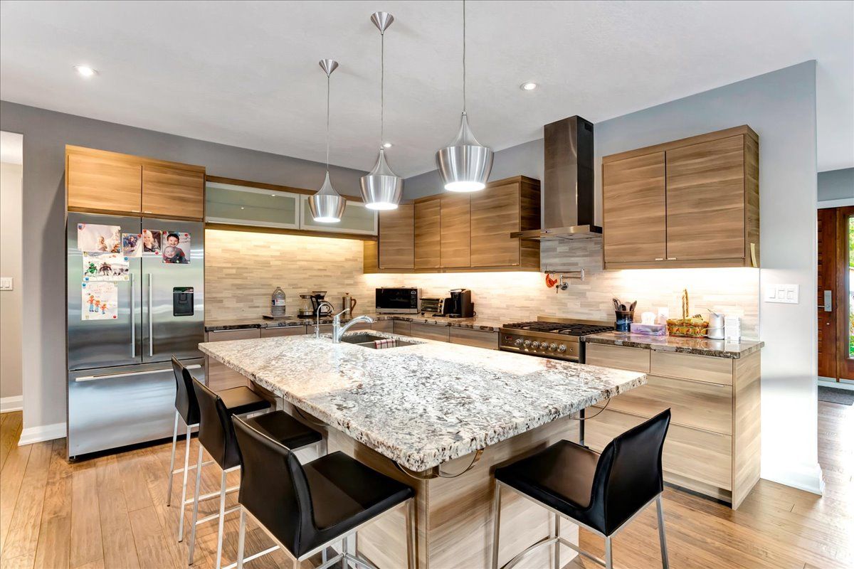 Unique custom sprawling modern bungalow with "inground pool", and triple car garage - ideally located in barrie's east ends exclusive area of fine homes situated on a 110ft x 185ft lot. This home exudes curb appeal, and interior beams with sophisticated architectural beauty and designer custom finishes. Features5 bedrooms, 3 bathrooms, and 10ft ceilings. The very bright open concept layout offers over 3000sqft of living space on one level no stairs and is wheelchair accessible. The kitchen is a chefs dream, complete with a large island, quartz counters, pot filler tap, stainless steel appliances & gorgeous tile backsplash and large pantry. The formal oversize dining area looks amazing with a round table. Removal of the two bedrooms behind the garage will present a large family room of 20'4" x 20'10". The spacious primary bedroom has an ex-large walk-in closet & 5-piece ensuite with double sinks, glass shower & soaker tub. Enjoy outdoor activities on the canopied patio which allows for all year around barbecuing. The massive beautiful landscaped fenced yard has a (19' x38) gas heated inground pool- with a 5ft deep end and a slide, installed 2 years ago. The double garage has an additional side by side single garage with inside entry to the home. Walking distance to nature trails, downtown, shops and restaurants; close proximity to rvh, kempenfelt bay, makes this is a perfect family home.