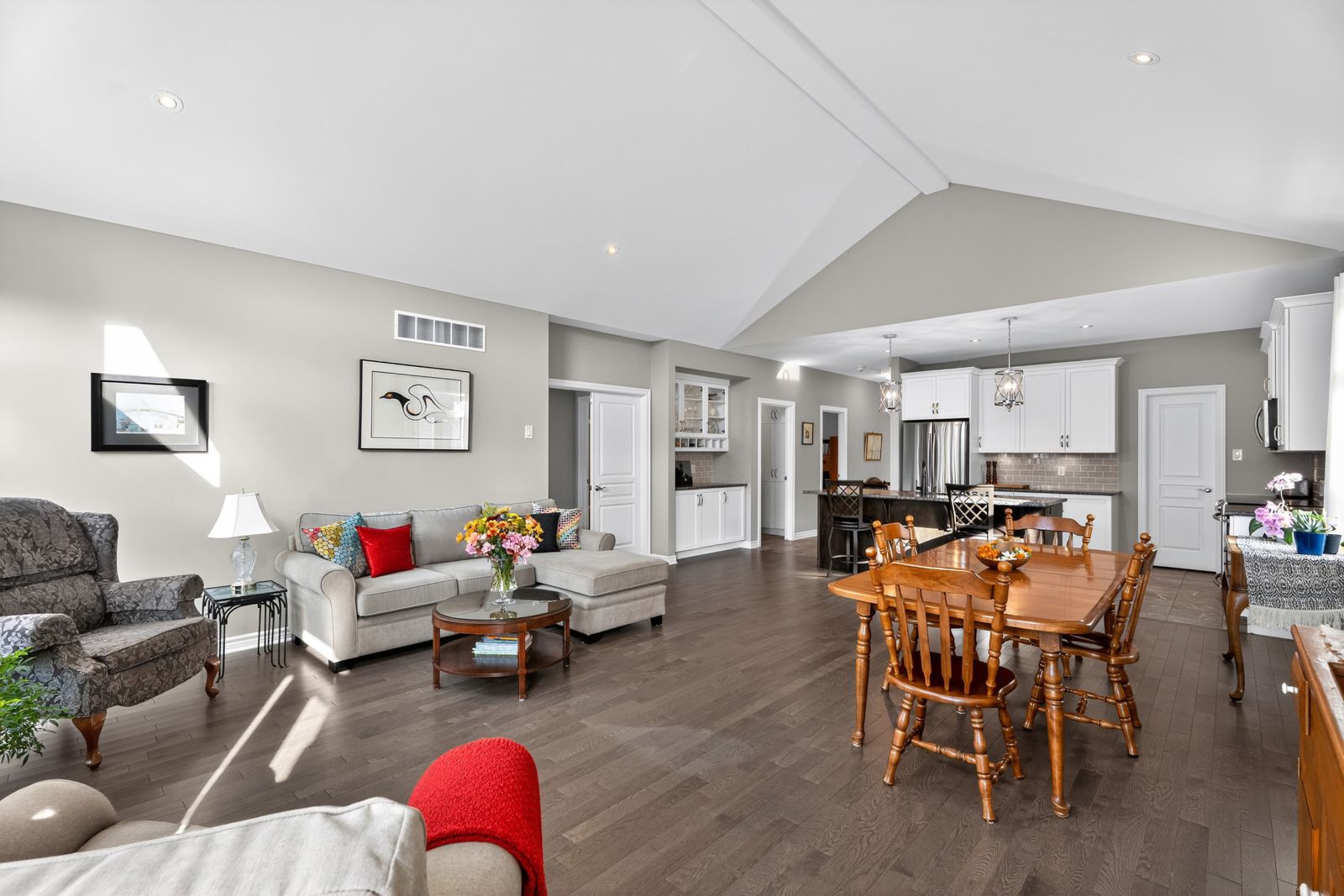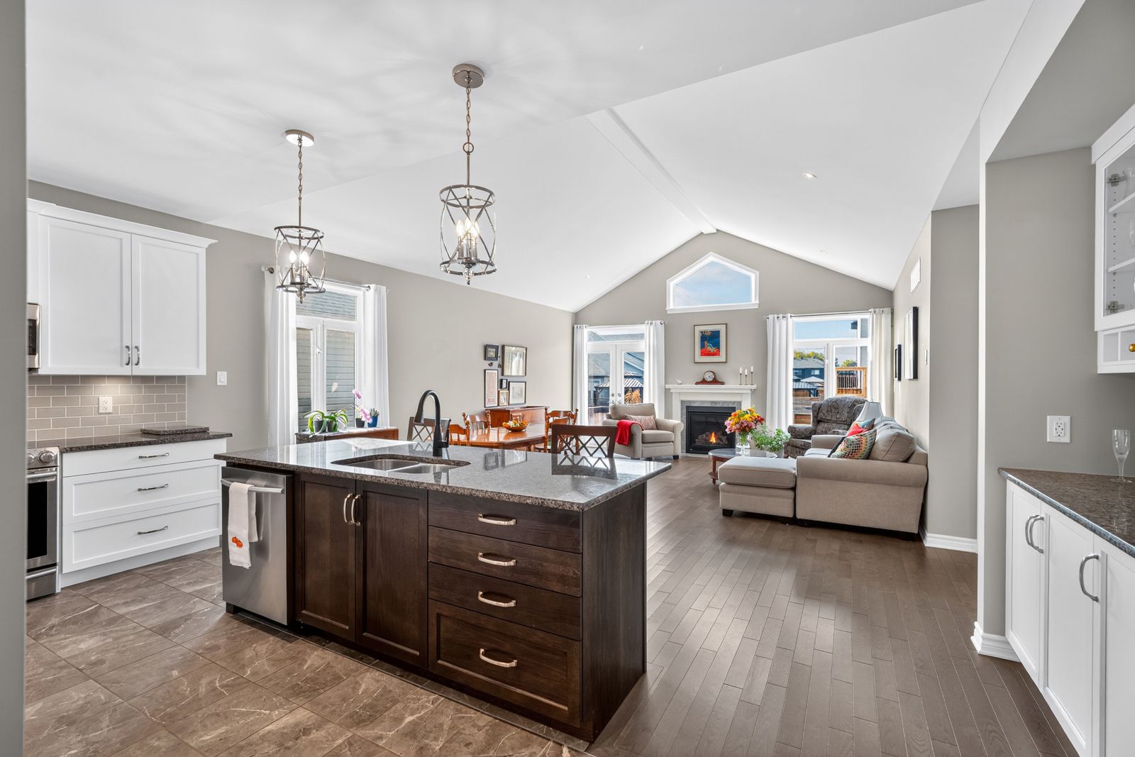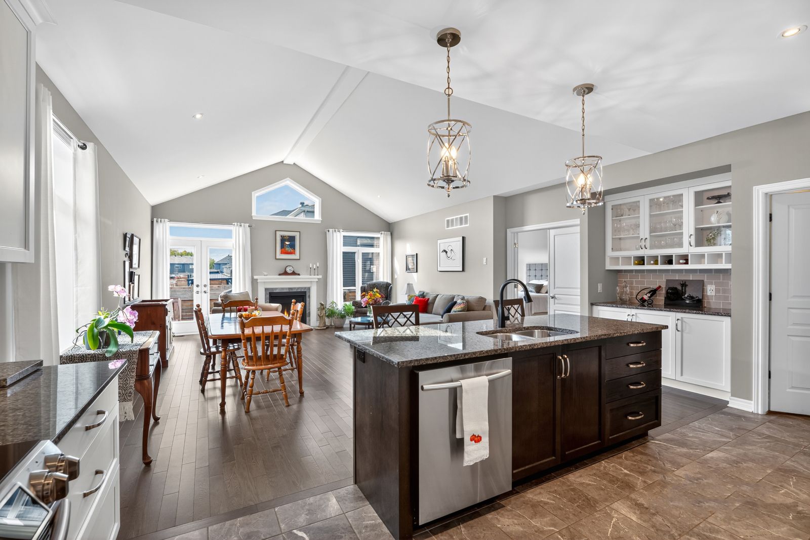 • Open-concept design with vaulted ceilings and rich hardwood flooring.