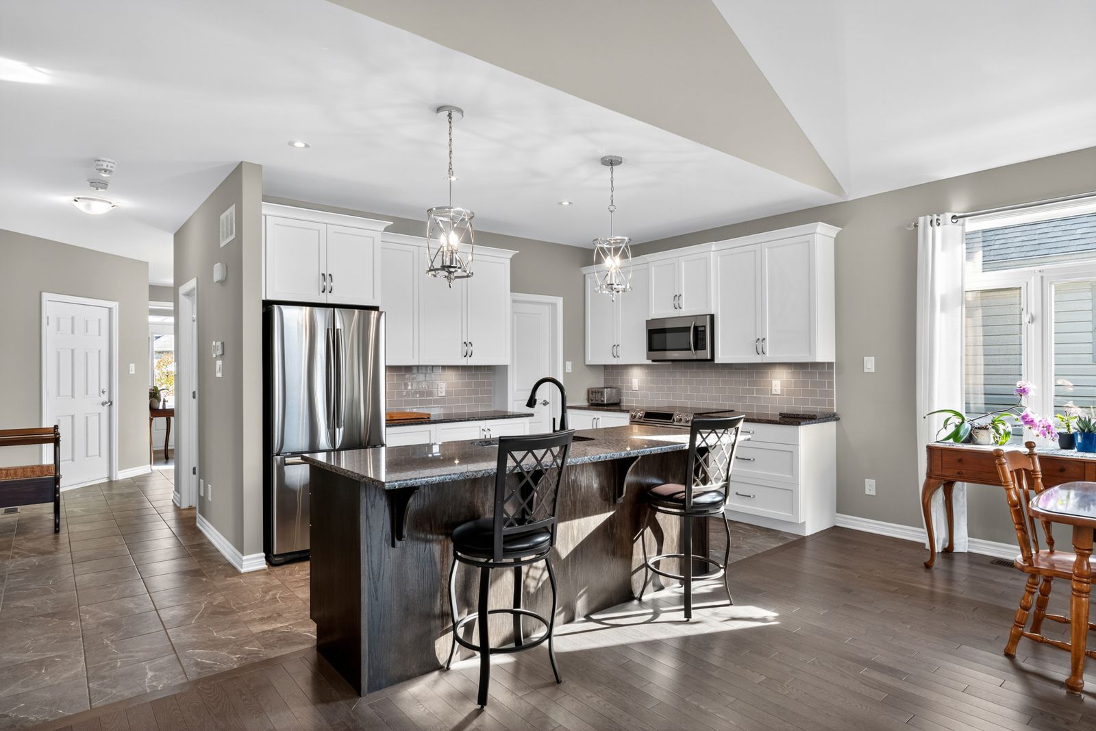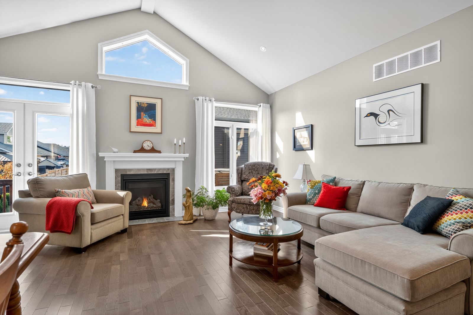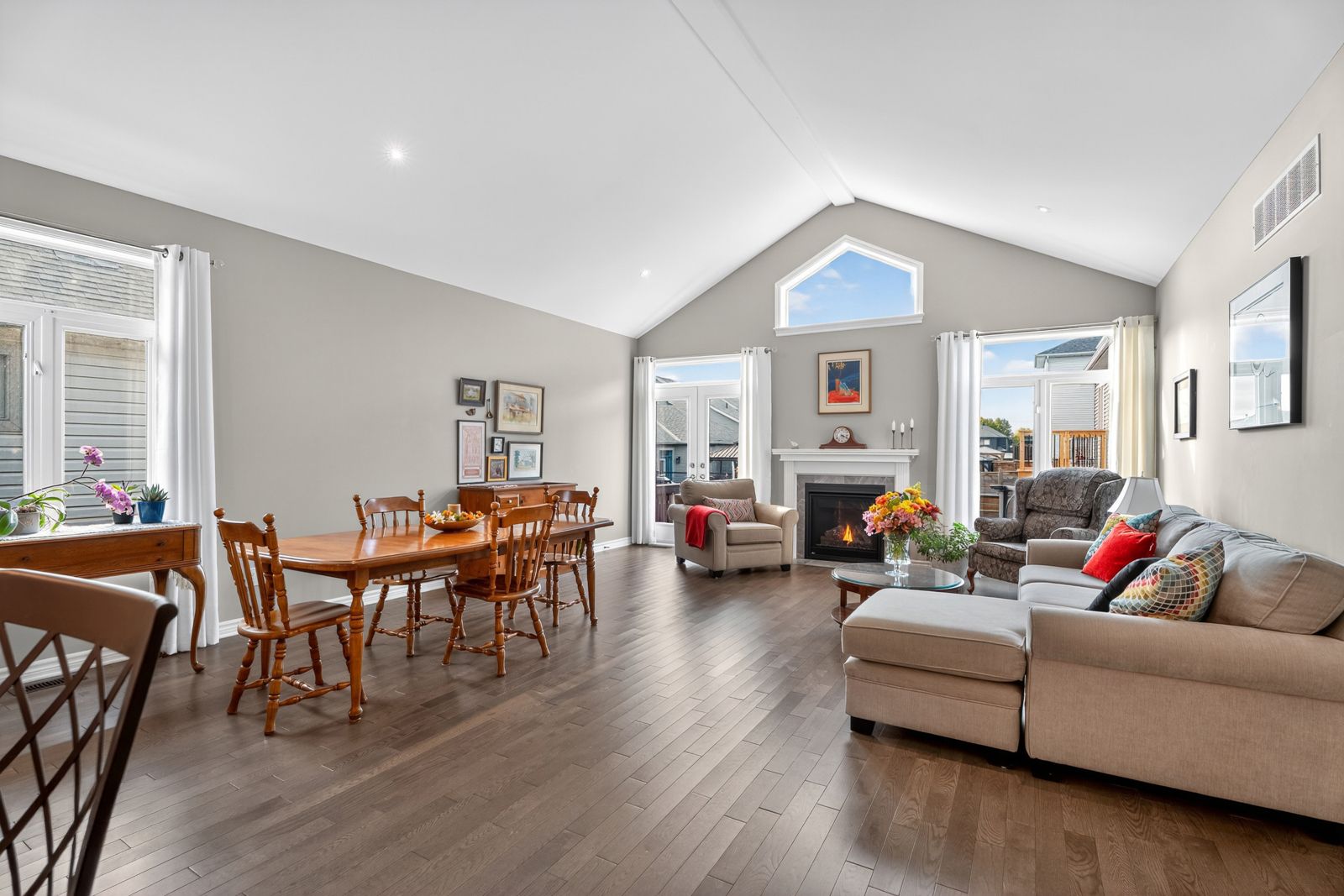 • Open-concept design with vaulted ceilings and rich hardwood flooring.