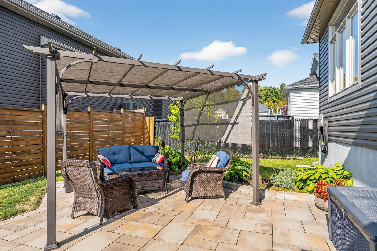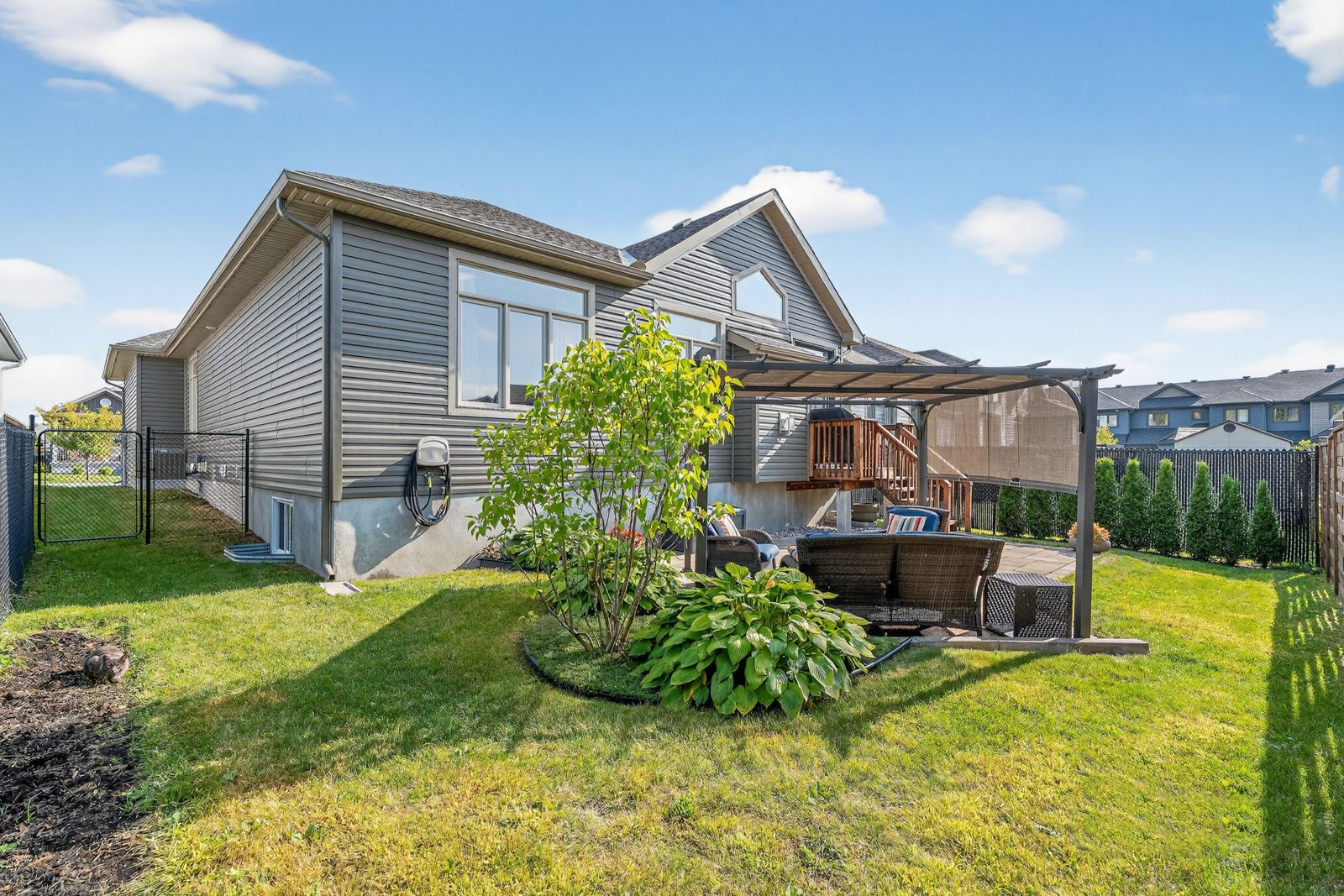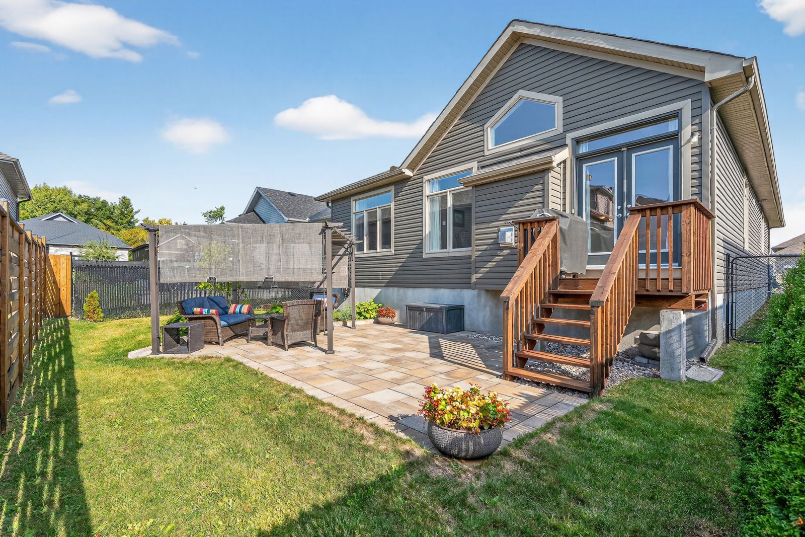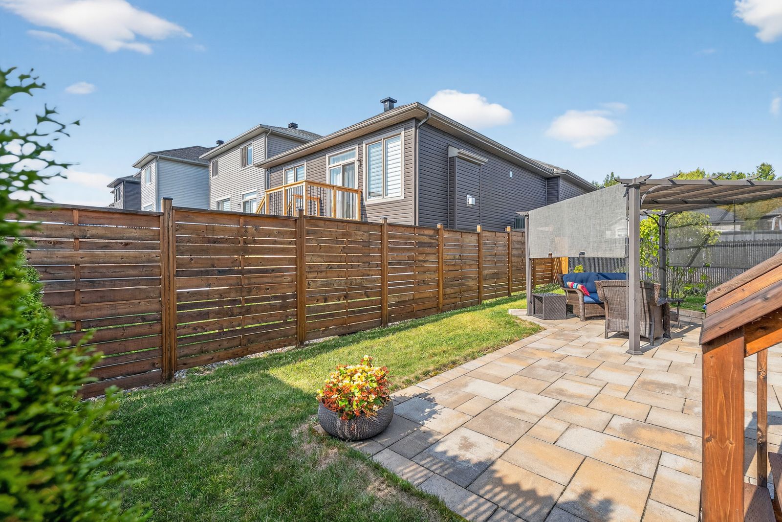 • Fully fenced backyard with interlock patio and pergola for summer relaxation.