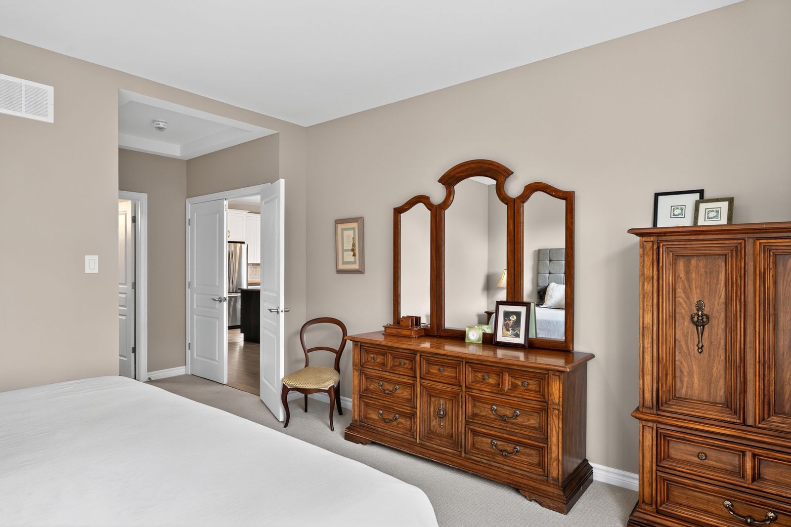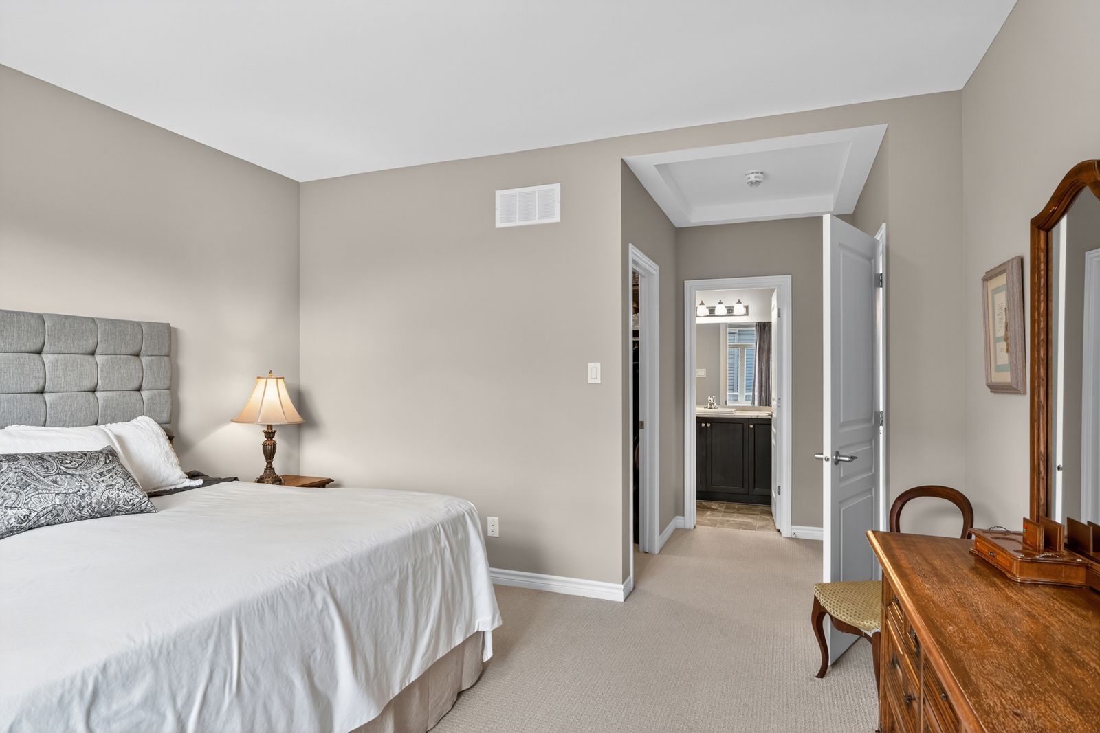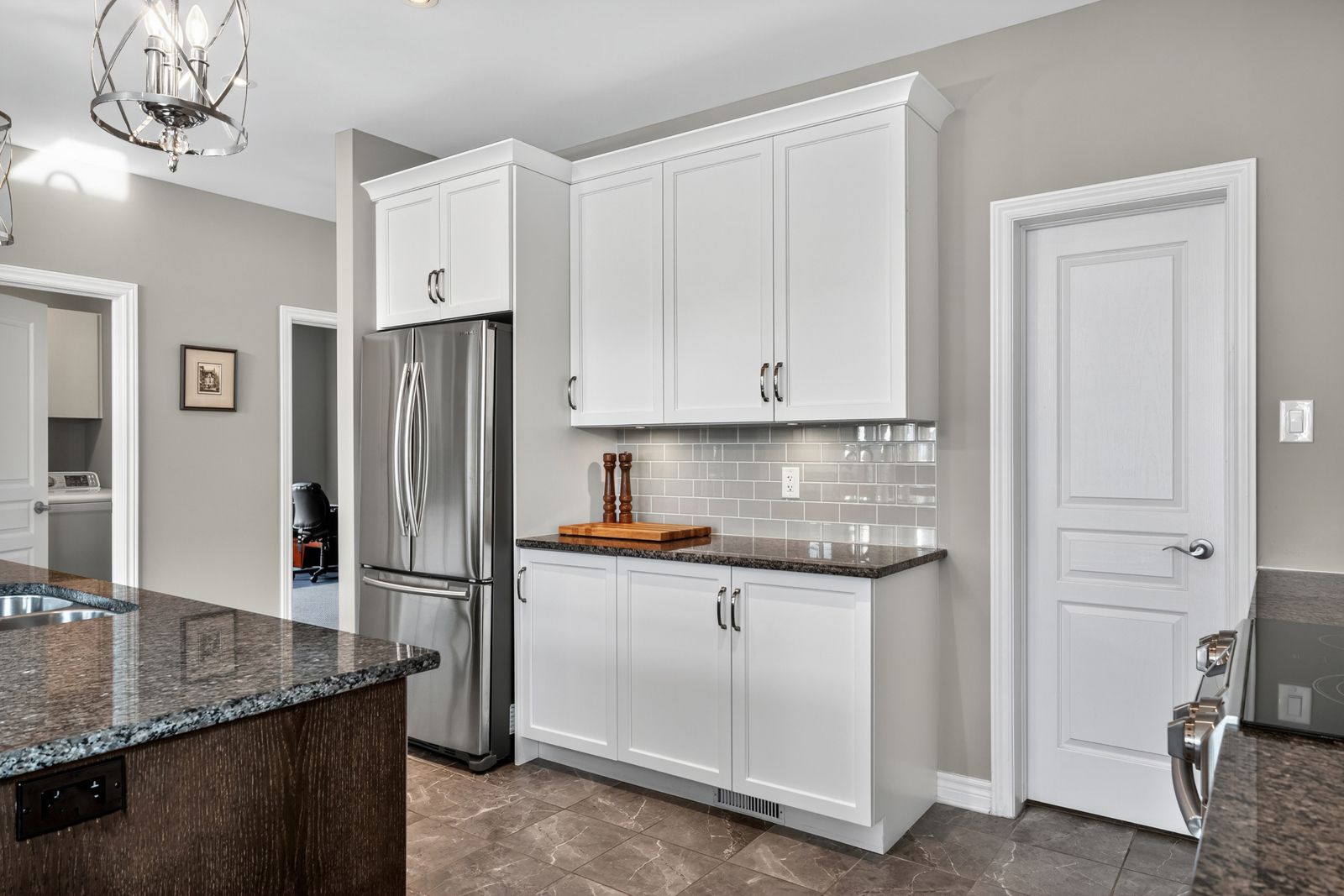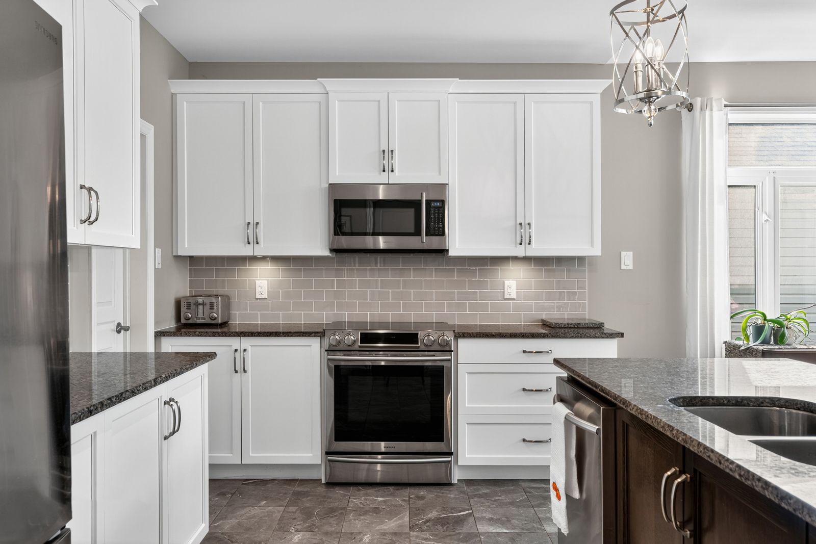 • Modern kitchen features granite counters, stainless steel appliances, and a walk-in pantry.