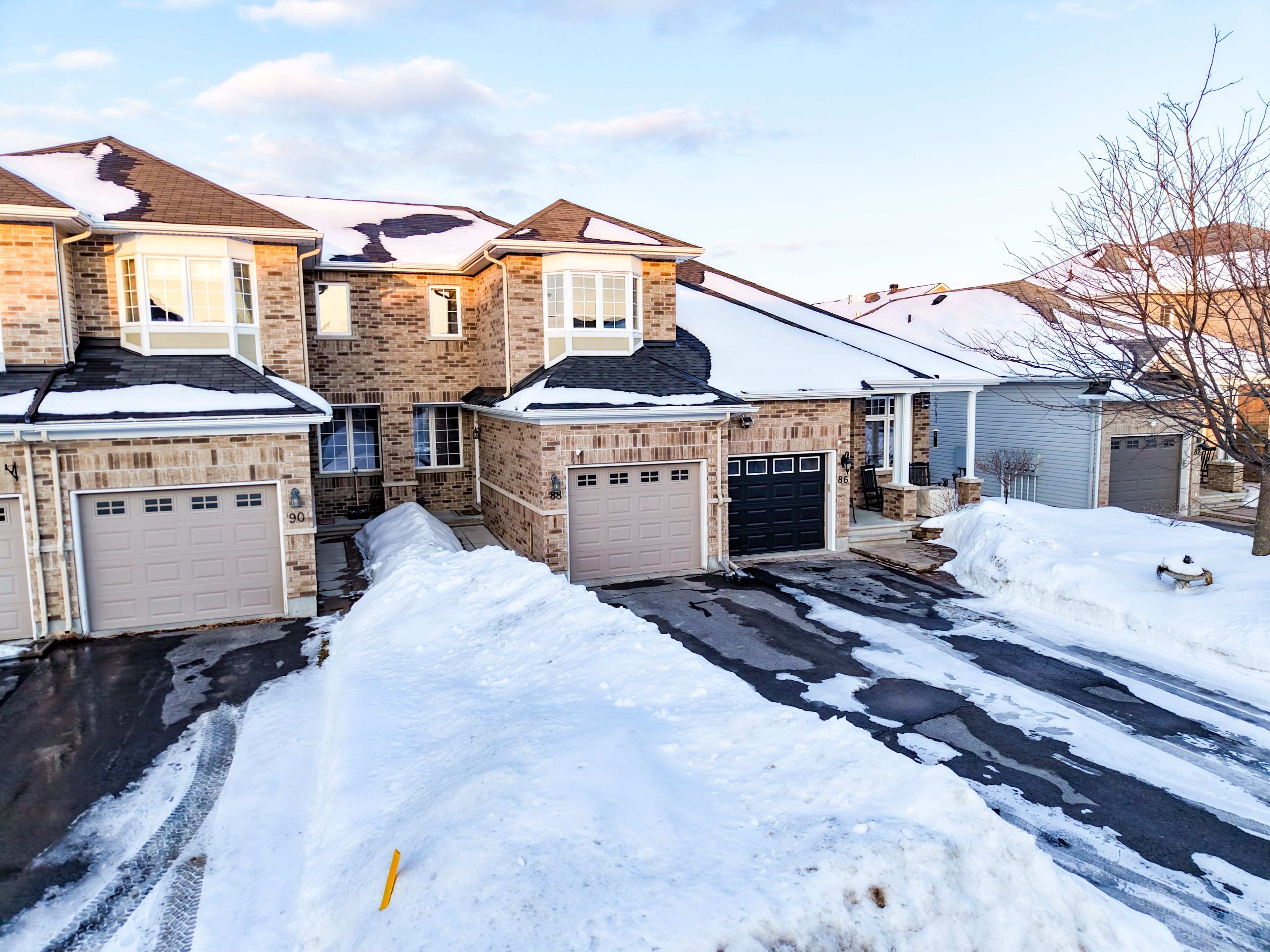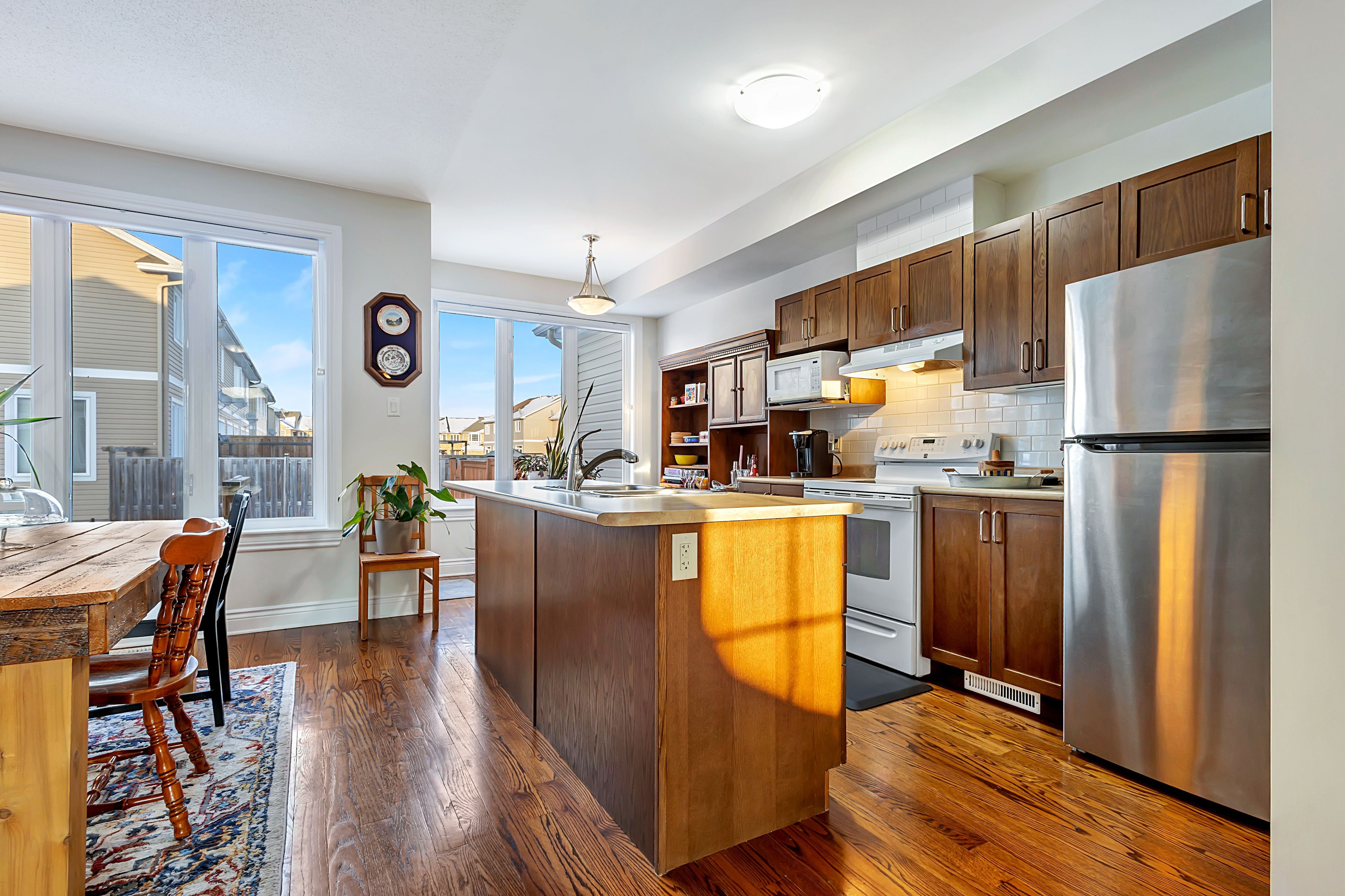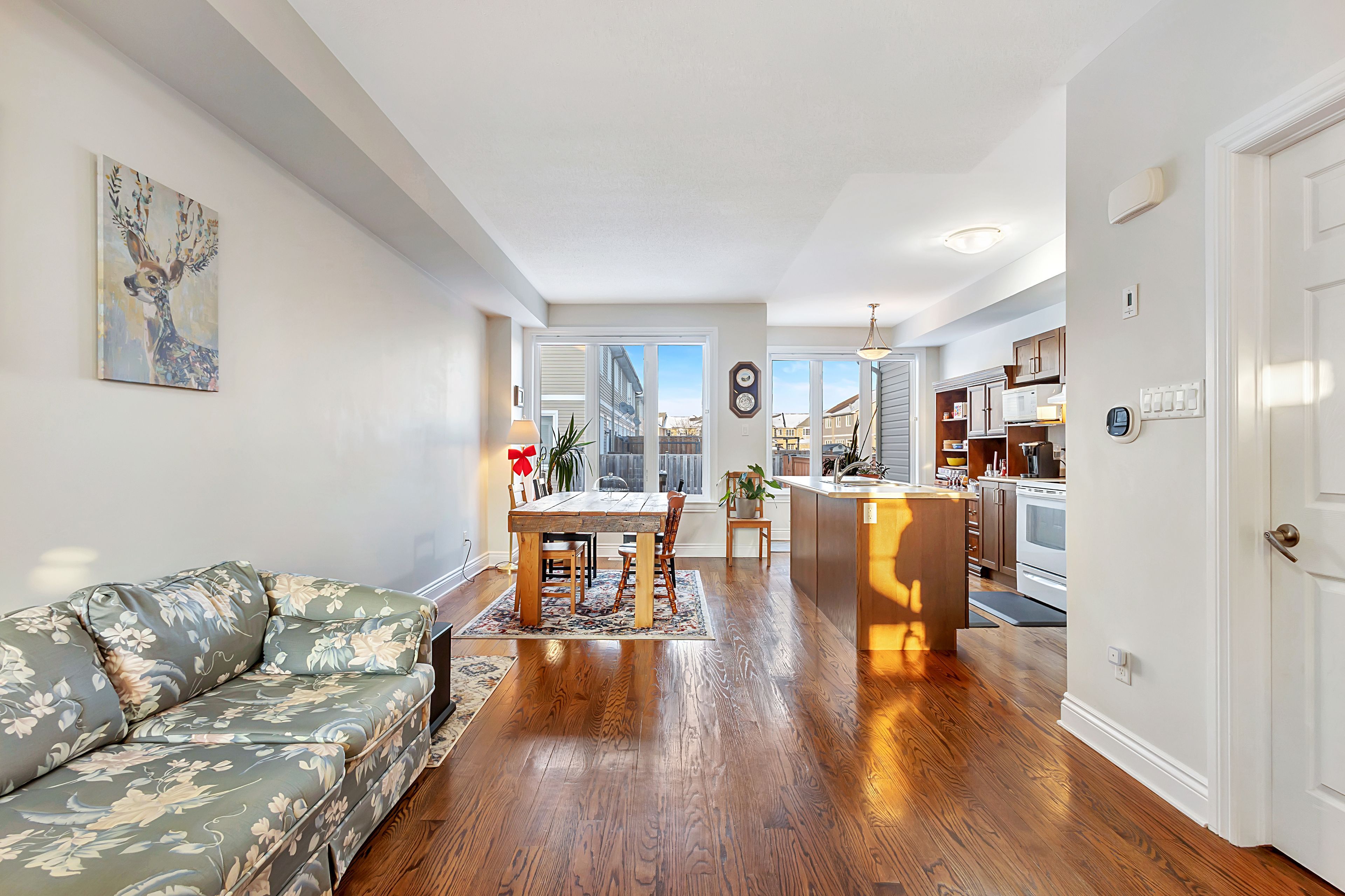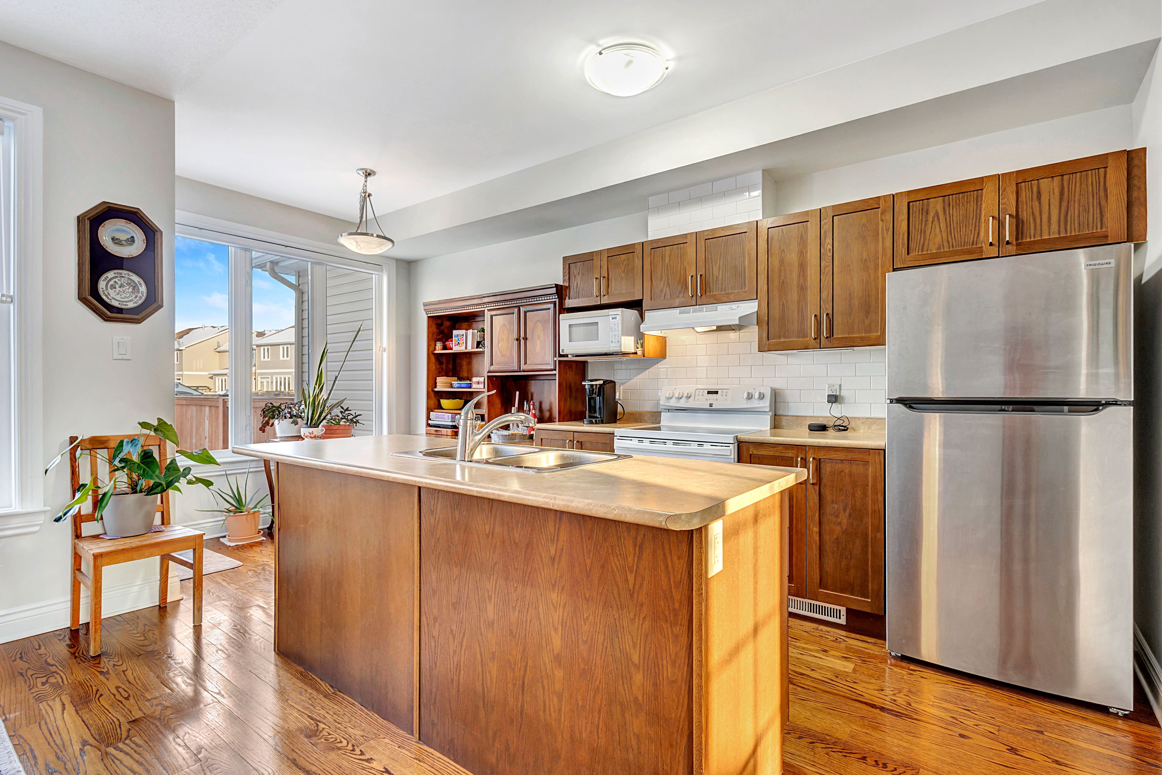 This beautifully maintained 3-bedroom townhouse offers open-concept main level, hardwood flooring on the main floor, tiled bathrooms, and extra-soft wall-to-wall carpet on the stairs and second level. The sun-filled kitchen features an island and patio door access to a backyard with plenty of natural light. The spacious bedrooms offer ample storage. The unfinished basement with a large window is perfect for storage, gym space and includes laundry with washer and dryer. Complete with all appliances, a main-floor powder room, single attached garage with automatic opener, and easy access to highway 417, parks, and amenities - this home truly has it all.