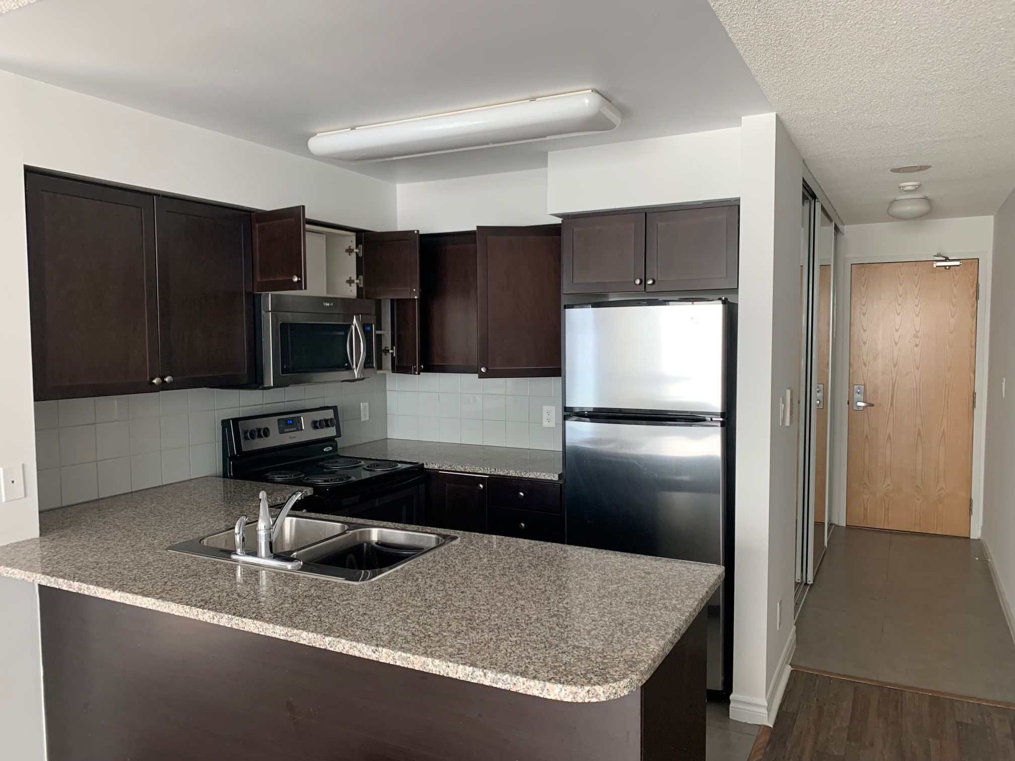 Live in this comfortable roomy, bedroom unit with a magnificient sw view. On a clear day you can see the lake and the cn tower. Mirrored closets in hall and bedroom with exquisite upgraded shelving. Freshly painted, 24 hrs concierge, excellent recreation facilities, library, party room, hot tub , pool, next door to shopping and transit routes. Ymca for more intense exercising. Enjoy living here at 88 grangeway ave.