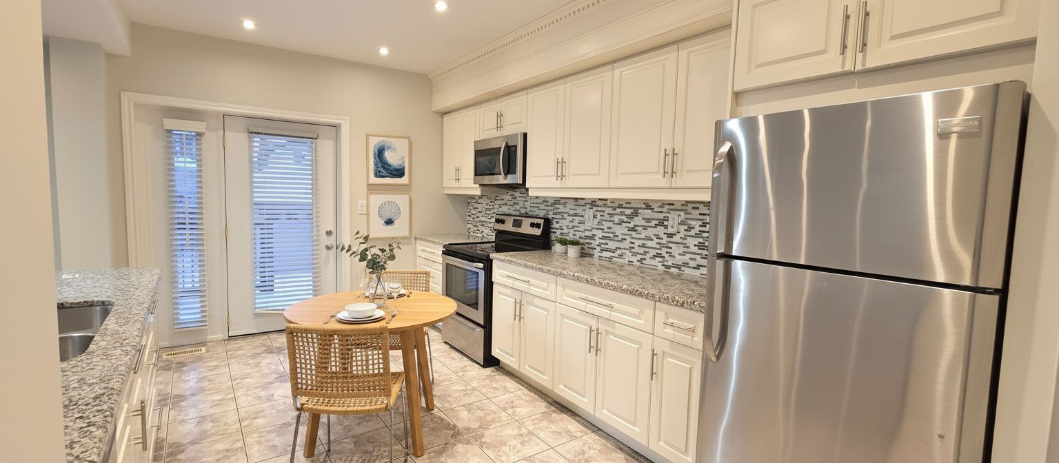 • Modern kitchen with granite countertops and stainless steel appliances.