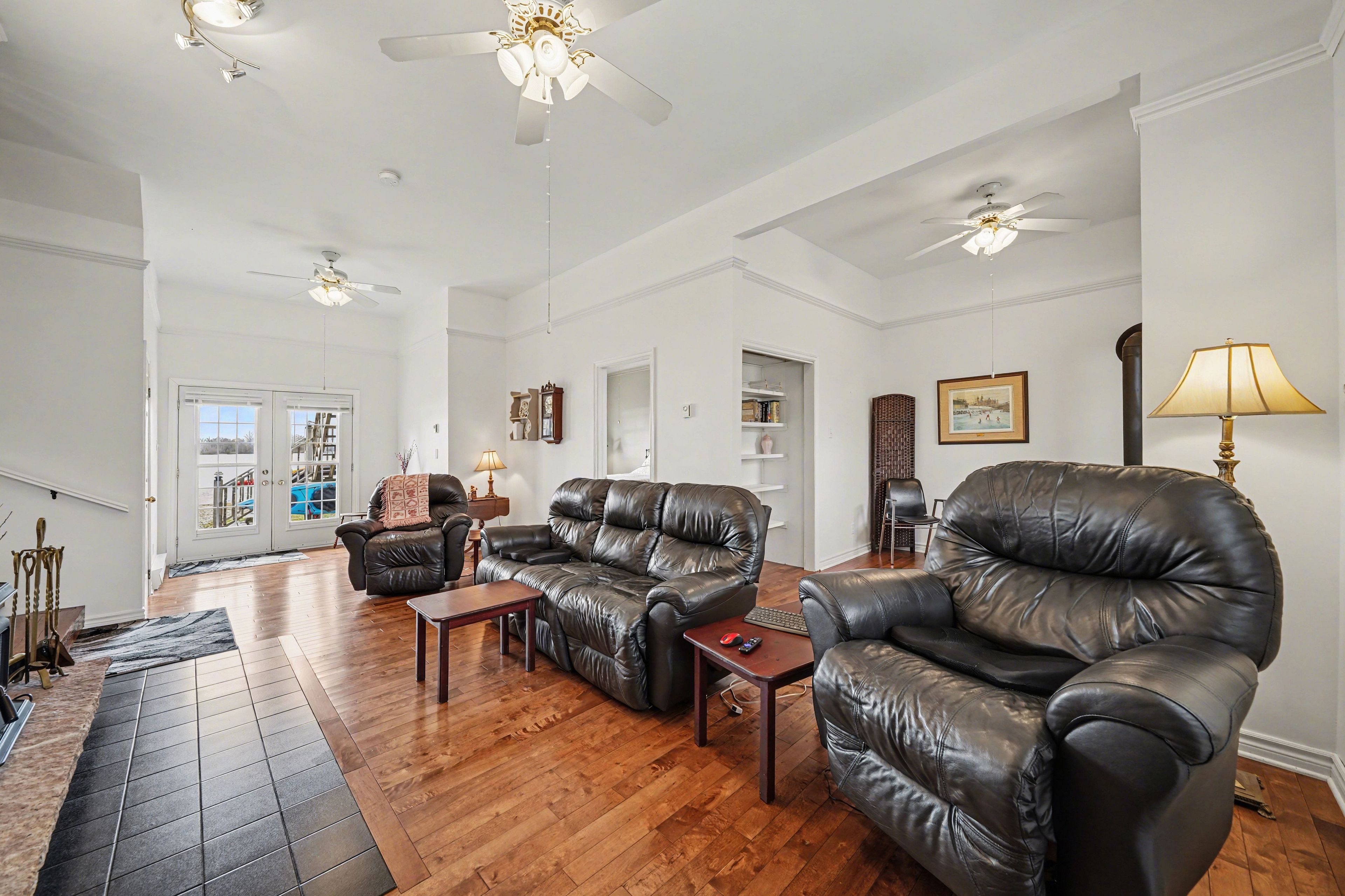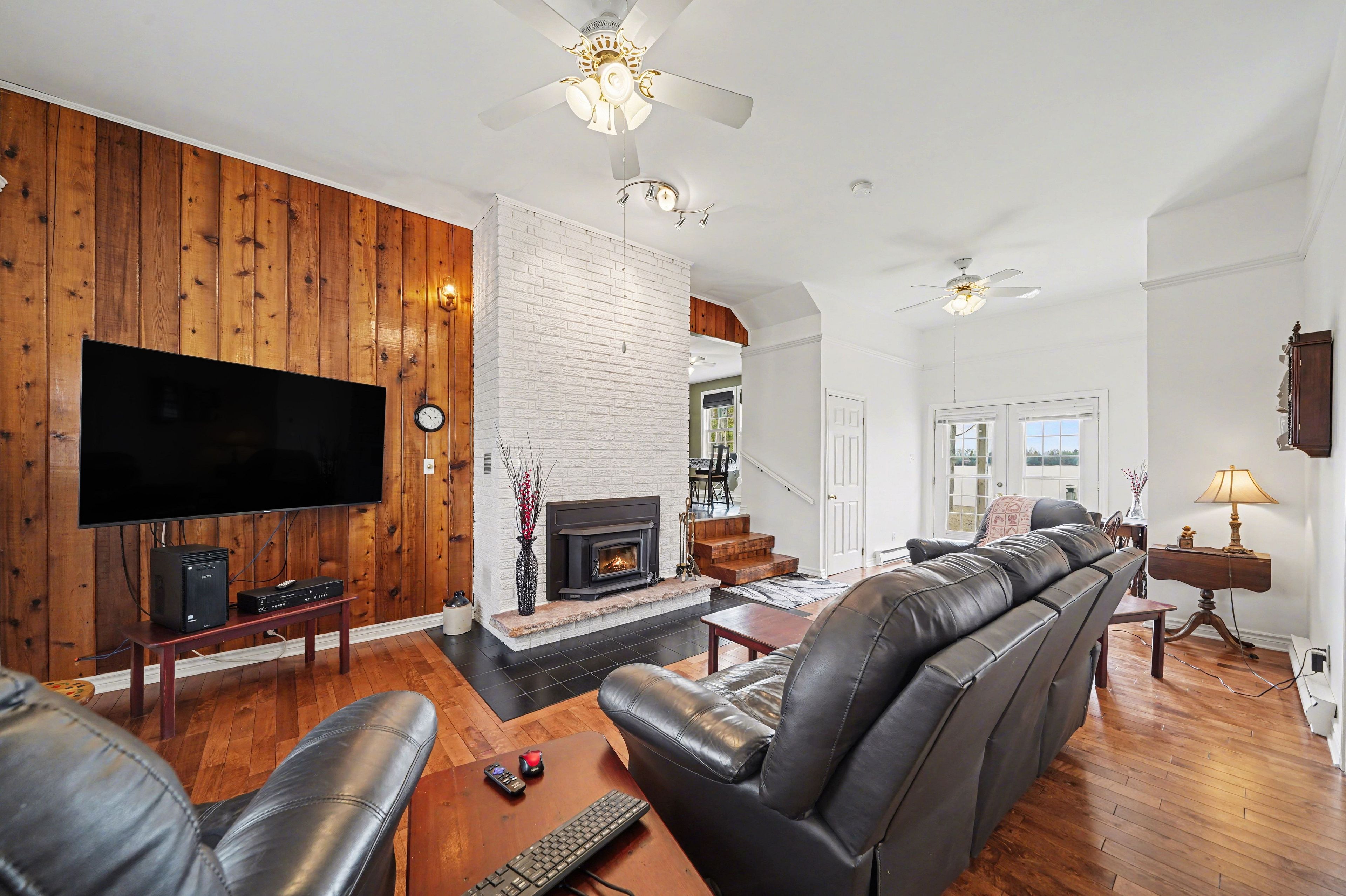 • Cozy living room with wood insert for warmth on cooler nights.