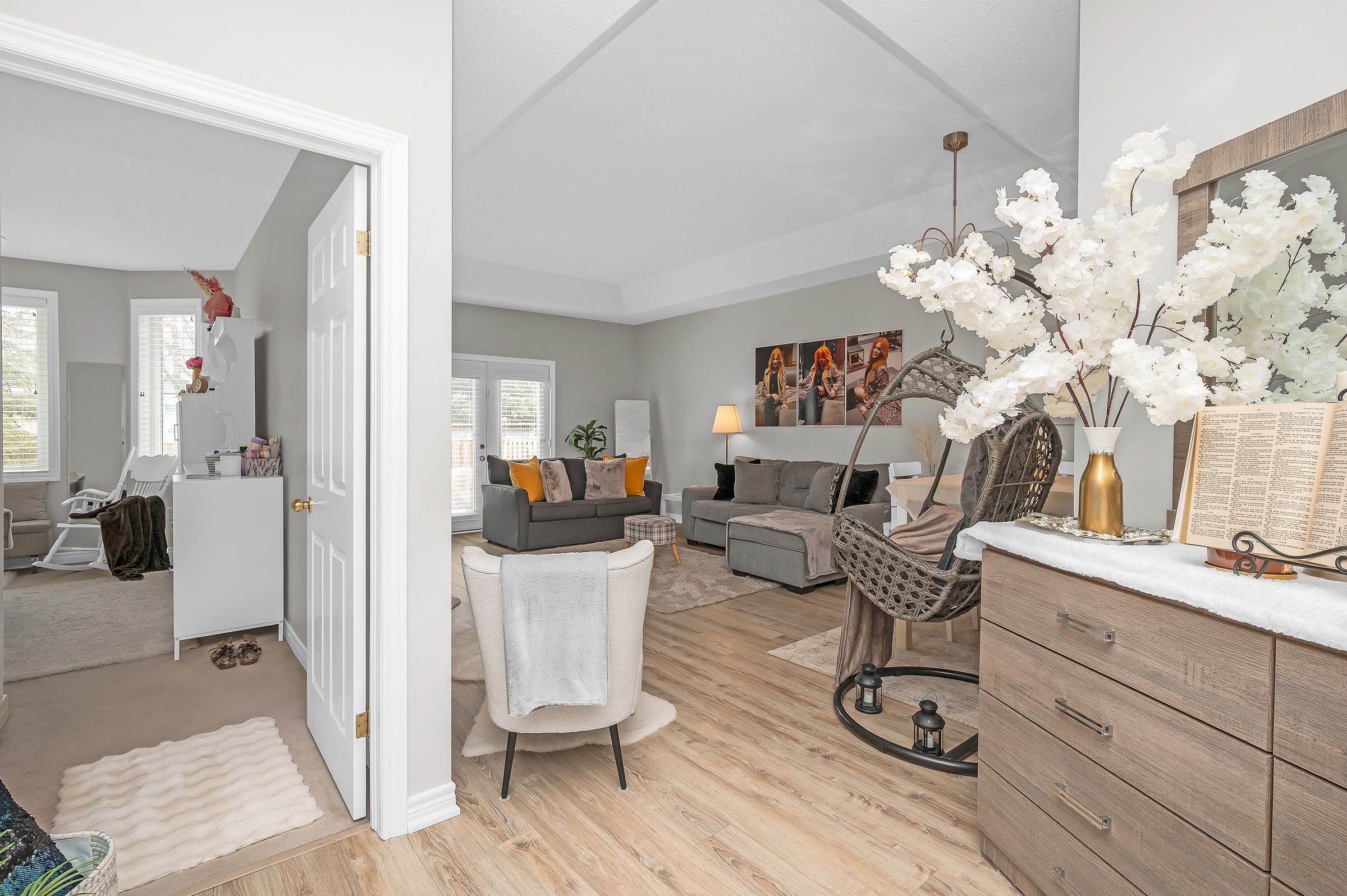 Experience elevated, maintenance-free living in coveted twenty place - one of hamilton's premier lifestyle communities. This beautifully appointed bungalow condo townhome offers over 1,300 sq ft above grade plus more than 1,200 sq ft of lower-level space, delivering exceptional comfort, scale, and flexibility. The main level features two generous bedrooms, two full bathrooms, a bright and spacious living/dining area accented by coffered ceilings, timeless neutral finishes, and the ease of main-floor laundry. Downstairs, the finished lower level extends your living space with an additional bedroom and bathroom, along with a large recreation area ideal for entertaining, a home gym, or a private guest retreat. Step outside to an extended patio surrounded by lovely perennial gardens - your own serene outdoor escape. Residents enjoy outstanding resort-style amenities including an impressive clubhouse, indoor pool, hot tub, sauna, fitness centre, library, games/party room, and outdoor tennis courts.