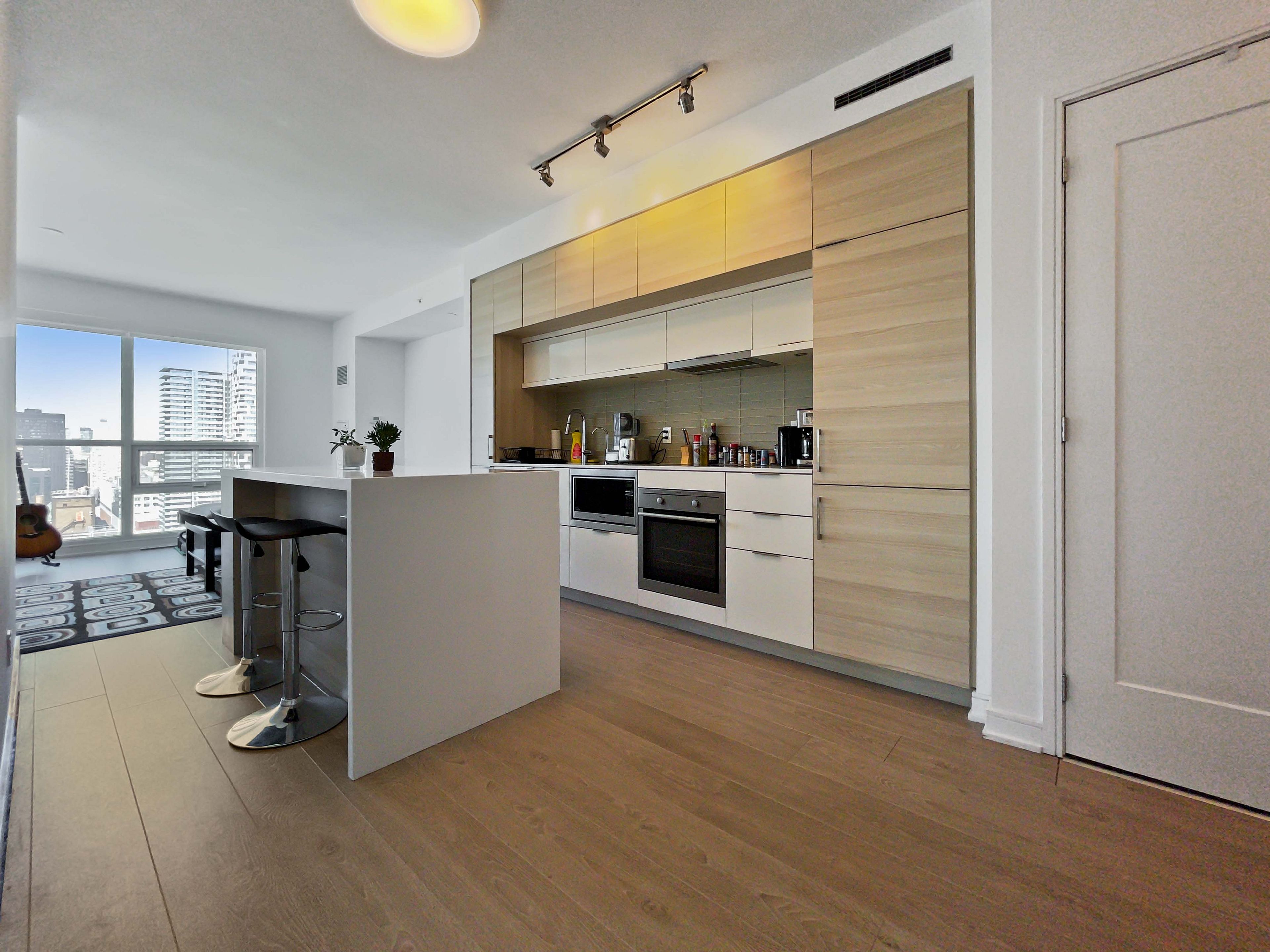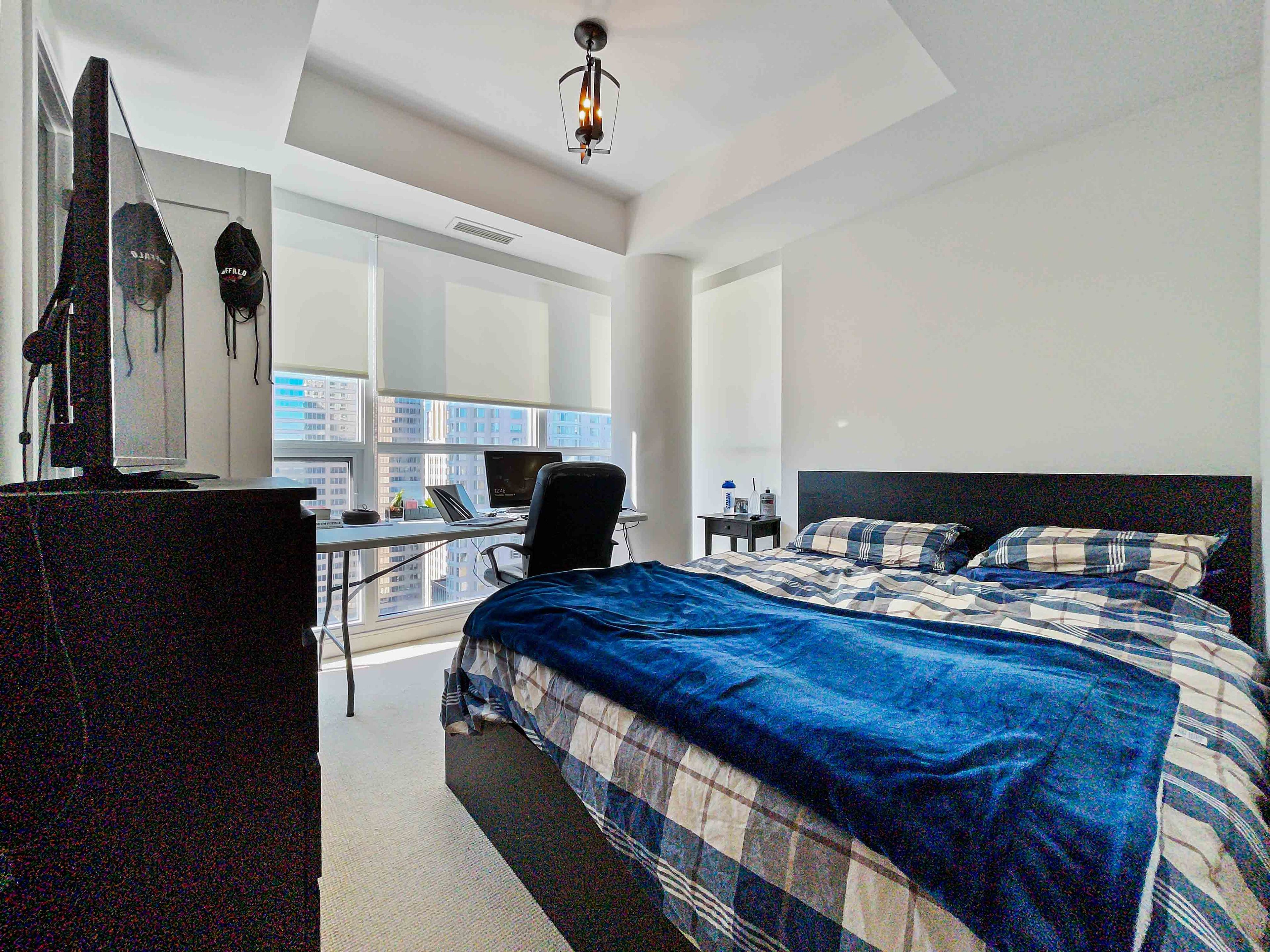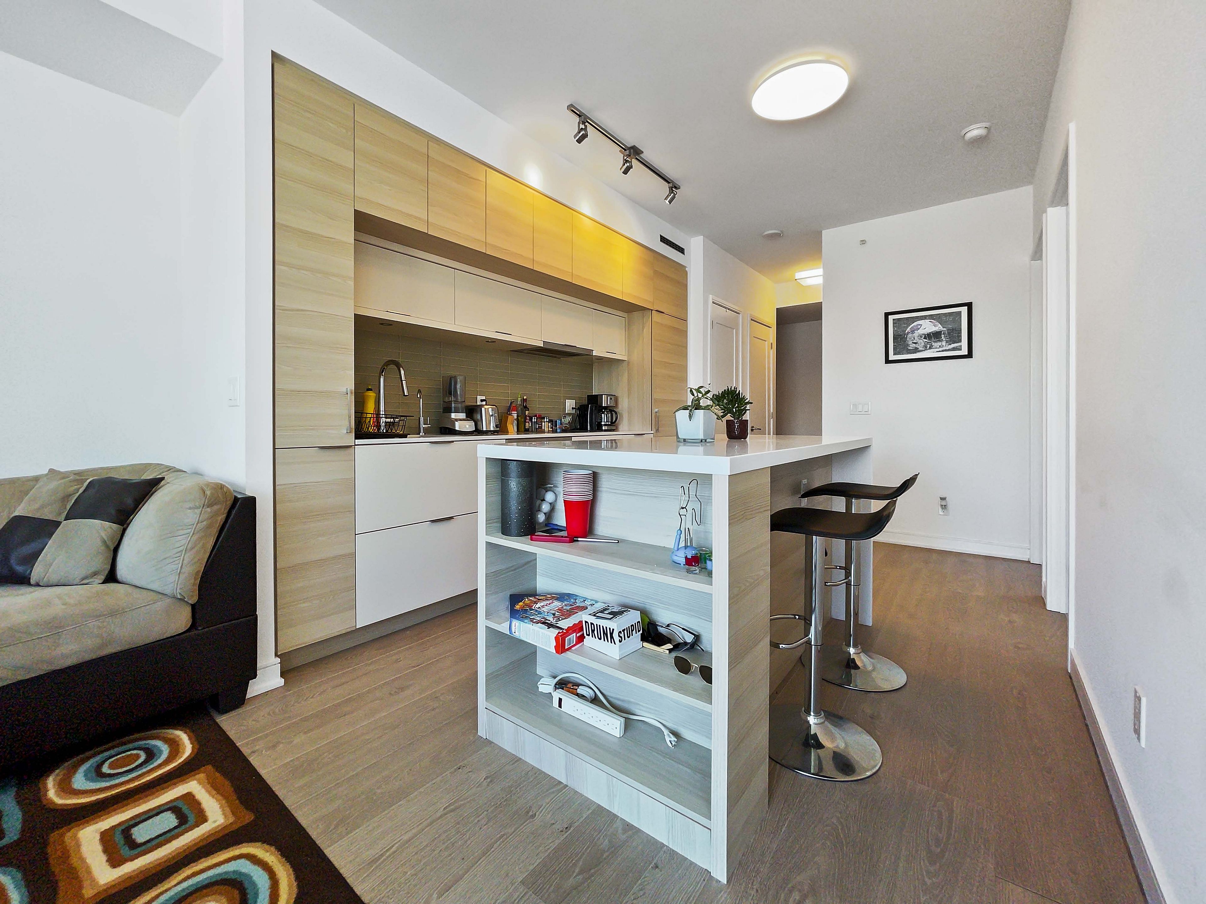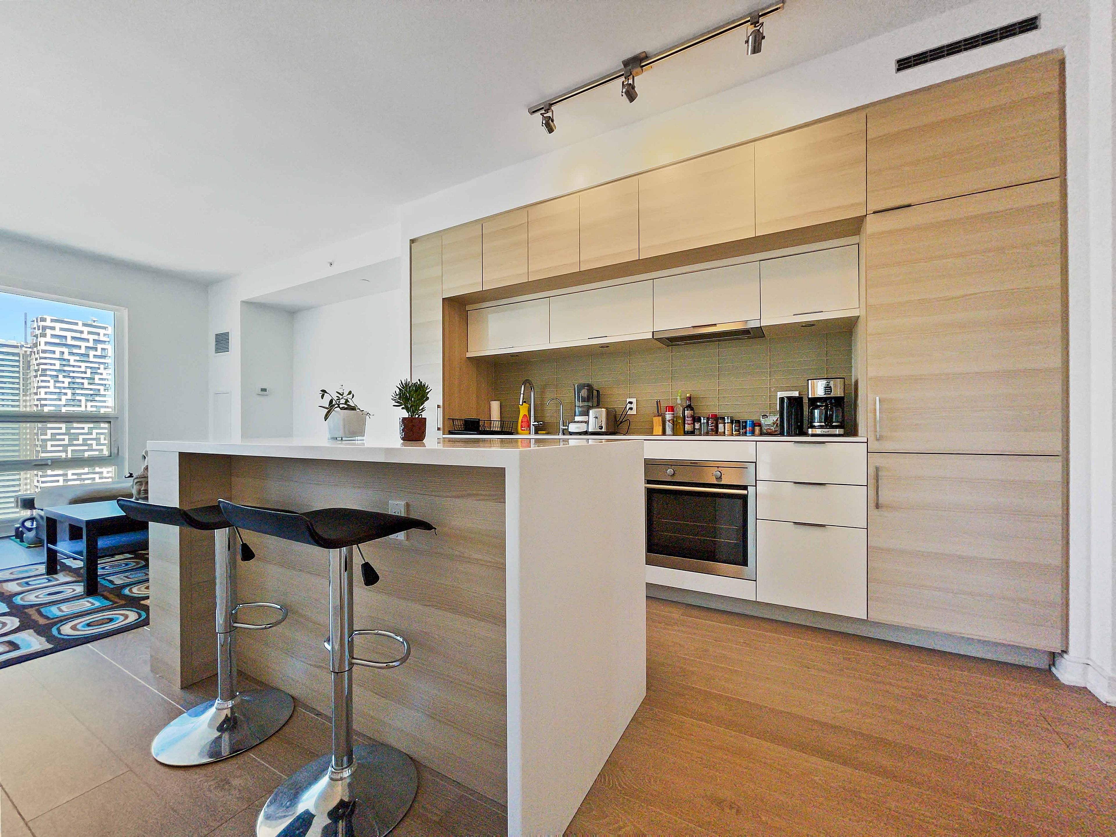 Stunning north west corner 2-bedroom at prestigious 88 scott. Downtown living at its finest! This approximately 743 sq. Ft. Unit boasts 9-ft smooth ceilings and floor-to-ceiling windows that flood the space with natural light. Features include custom roller shades, laminate floors, and a thoughtfully designed kitchen with built-in appliances, undermount sink with filtered water tap, quartz countertops, and a center island with corian countertop and built-in storage. The 4-piece double-access ensuite includes a corian sink and countertop, plus a relaxing soaker tub. Enjoy the ultimate downtown lifestyle-just steps from union station and up express, the path, financial district, st. Lawrence market, berczy park, eaton centre, restaurants, and more!