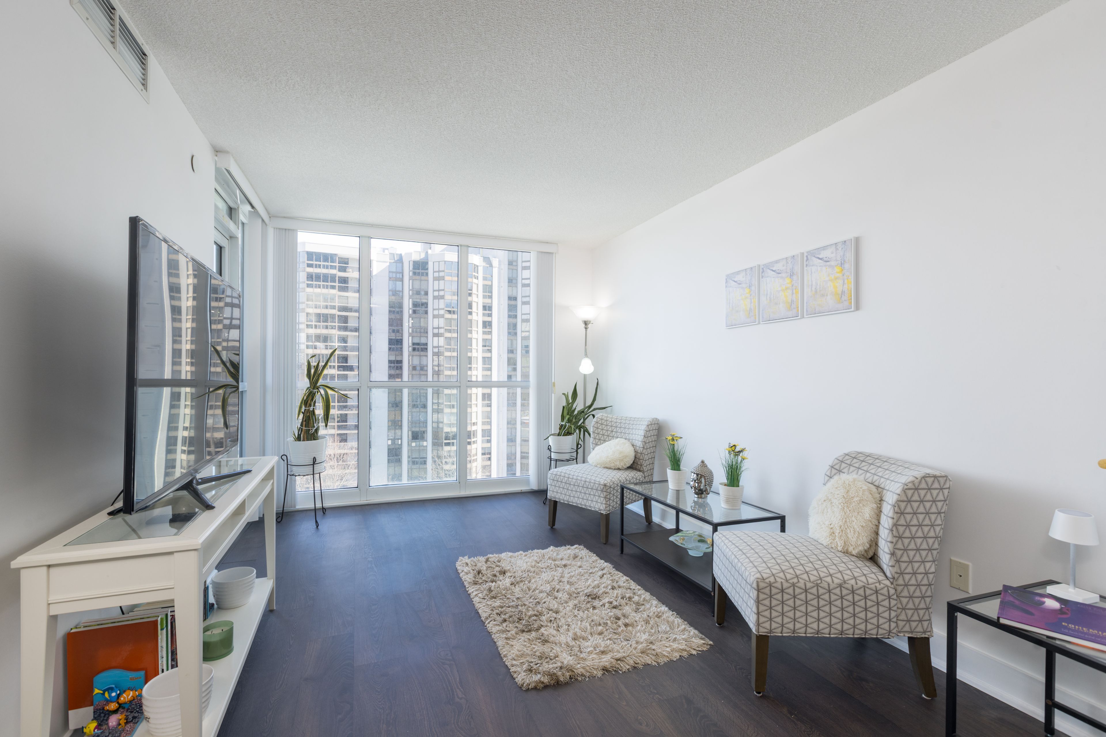 • Bright one-bedroom condo with floor-to-ceiling windows and water garden views.