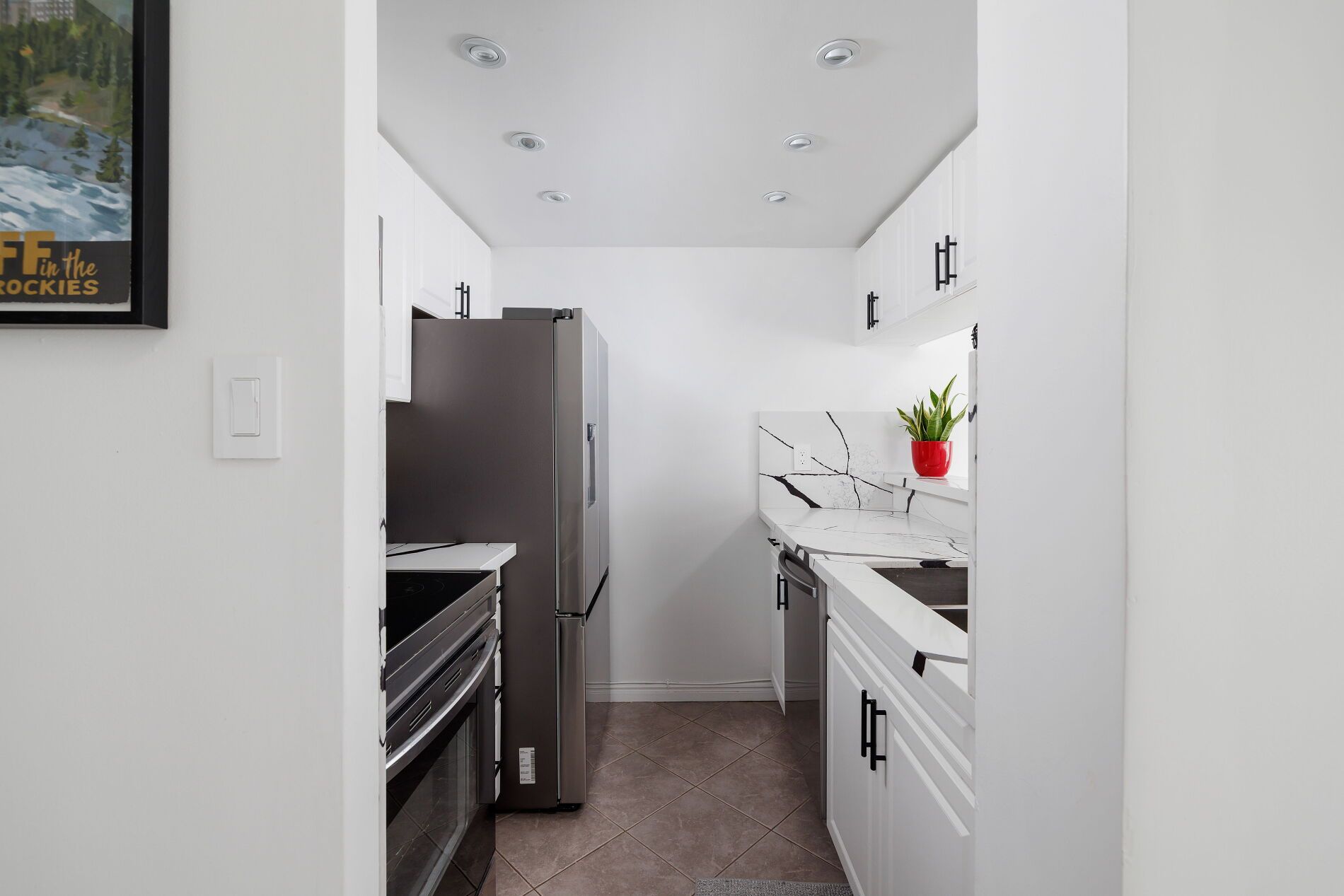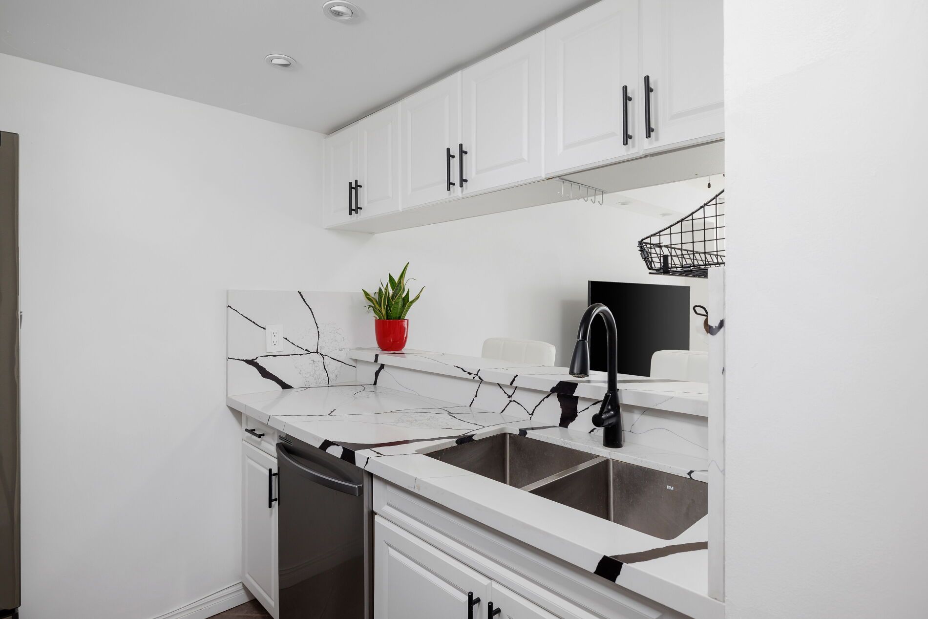 • Modern kitchen features granite counters and stainless steel appliances.
