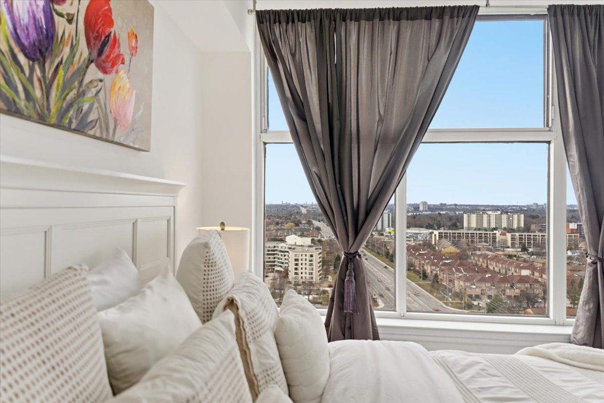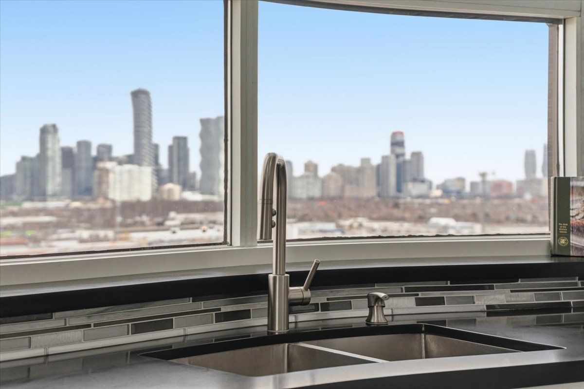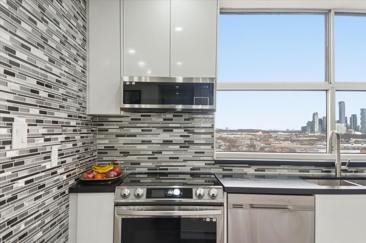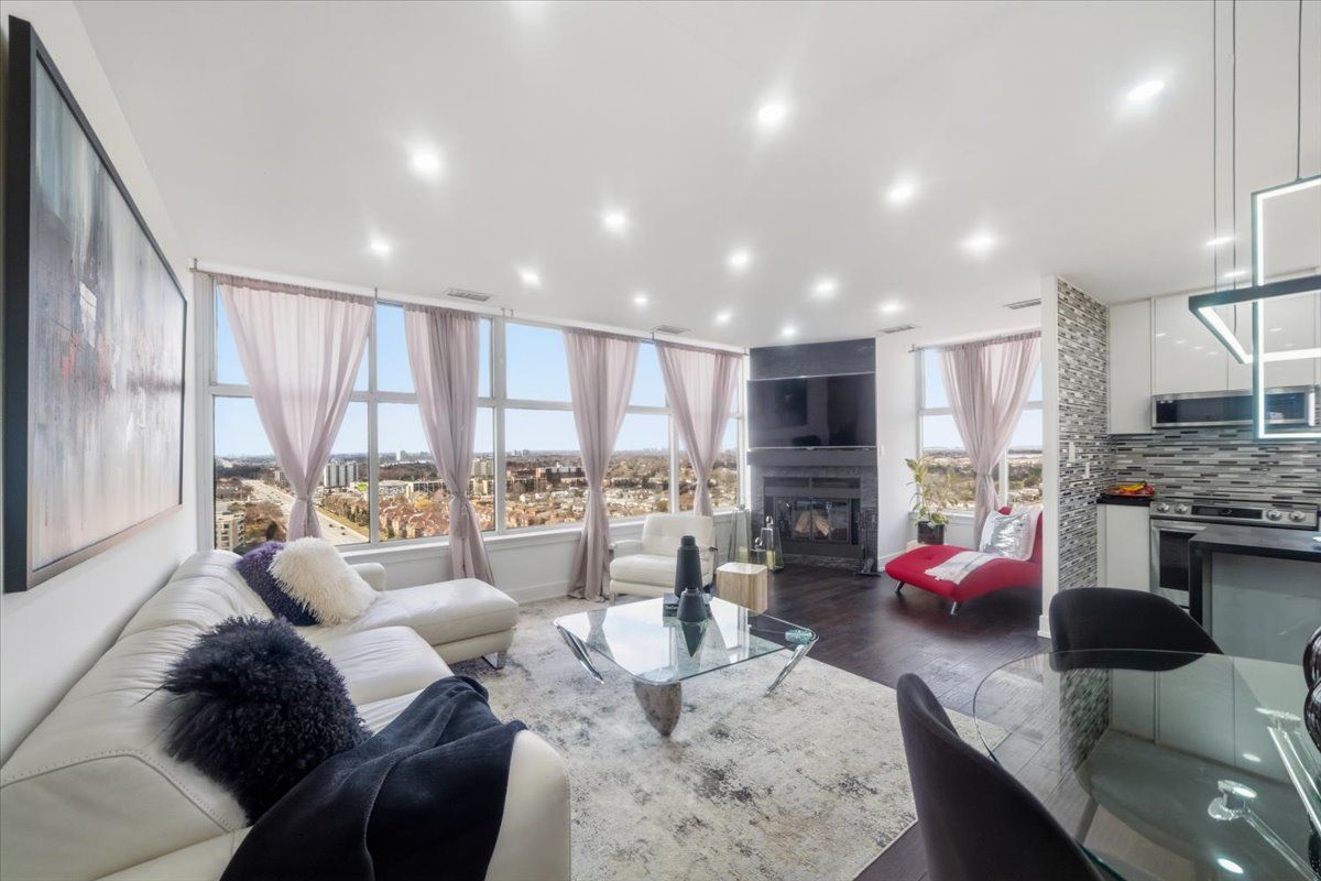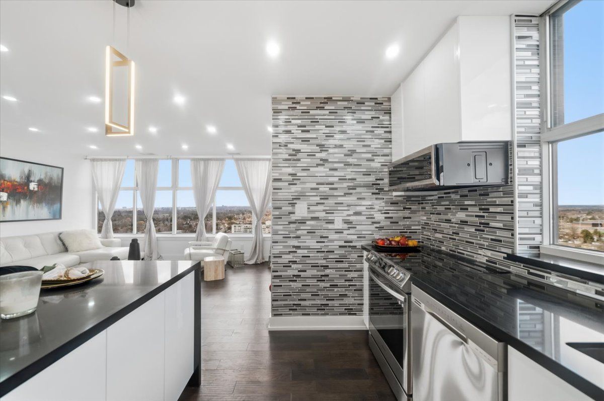 Enjoy penthouse living at it's finest. No expense spared in this top to bottom renovation completed in 2023-2024 featuring hardwood floors throughout & new modern baseboards with matching shoe molding, new door & window trim. Smooth ceilings with new led potlights & accompanying dimmer switches. New interior doors, lever handles & hardware. Gorgeous hexagon tile feature wall in powder room with new porcelain vessel sink & gold mirror to match faucet. Open concept living/dining/kitchen with a stone tile wall to highlight the fireplace & mantle. Stunning views of the city & lake ontario from this upper penthouse suite fit for a king or a queen. Tons of natural lighting. Modernized kitchen with new upper & lower flush cabinets (no handles), high-end samsung appliances, and a waterfall edge quartz countertop to complete a breakfast bar peninsula island. Horizontally opposed matching backsplash tile in the kitchen. Large master bedroom has a 5 piece en-suite bath & walk-in closet. Bonus: office/den space beside the master can also accommodate various uses. New custom closets & custom millwork. Wow, the list of upgrades goes on! Don't let this hidden gem pass by: 2 parking spots! All utilities plus cable tv & internet included in the monthly maintenance. Close to parks, shopping, highways & transit directly in front of the condo. Gated security house & concierge for accessibility. This corner unit penthouse is a rare find!