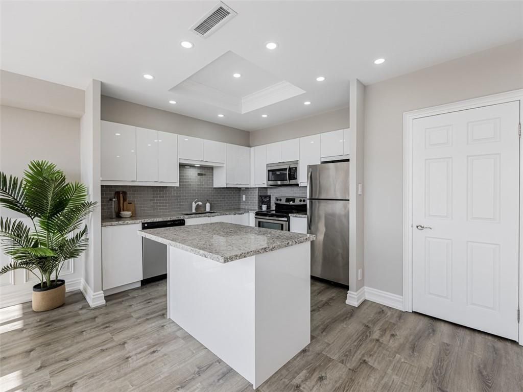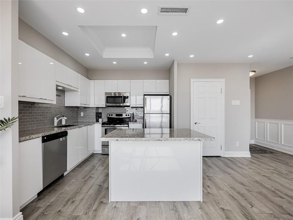 • Sleek white kitchen with quartz countertops and stainless steel appliances.