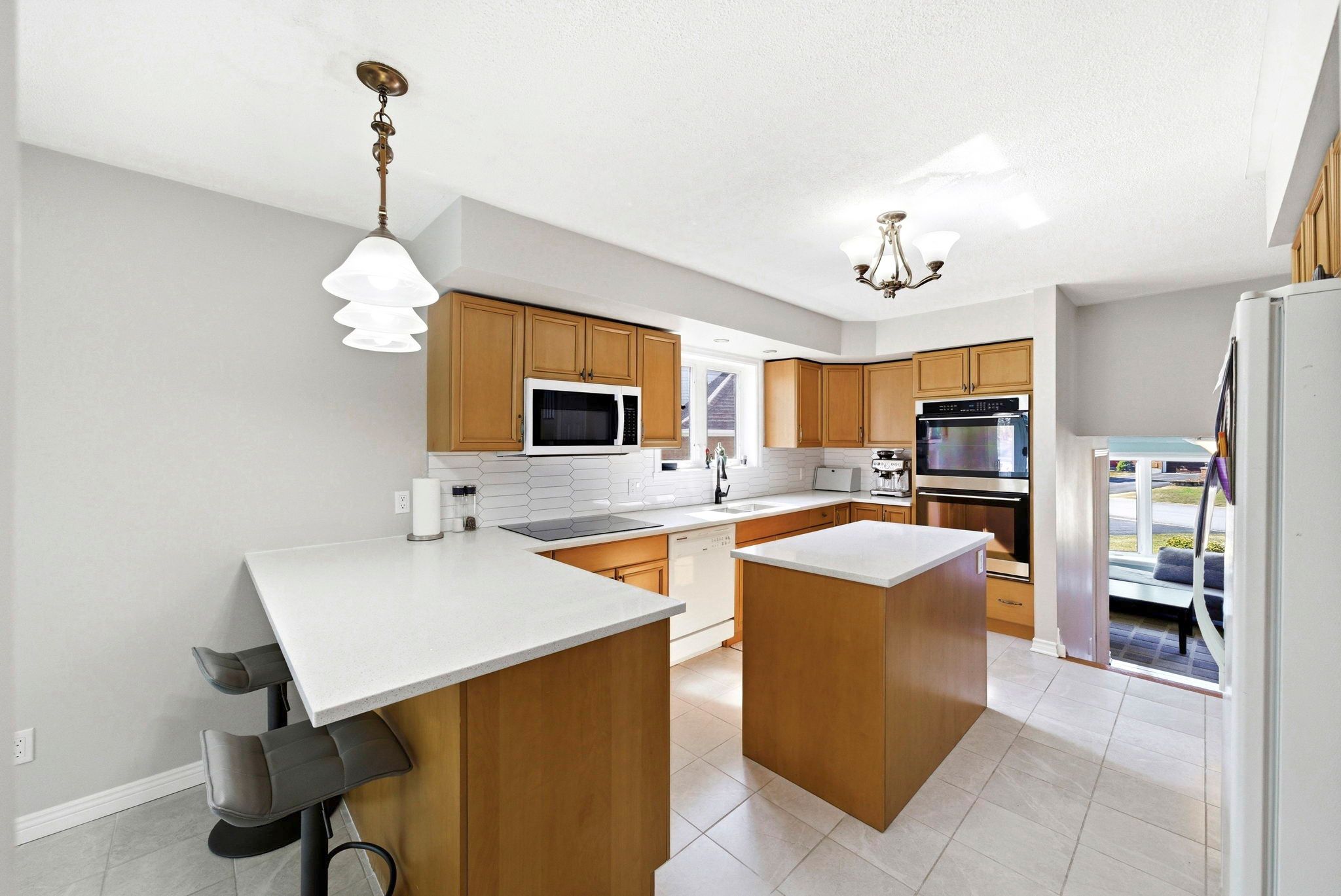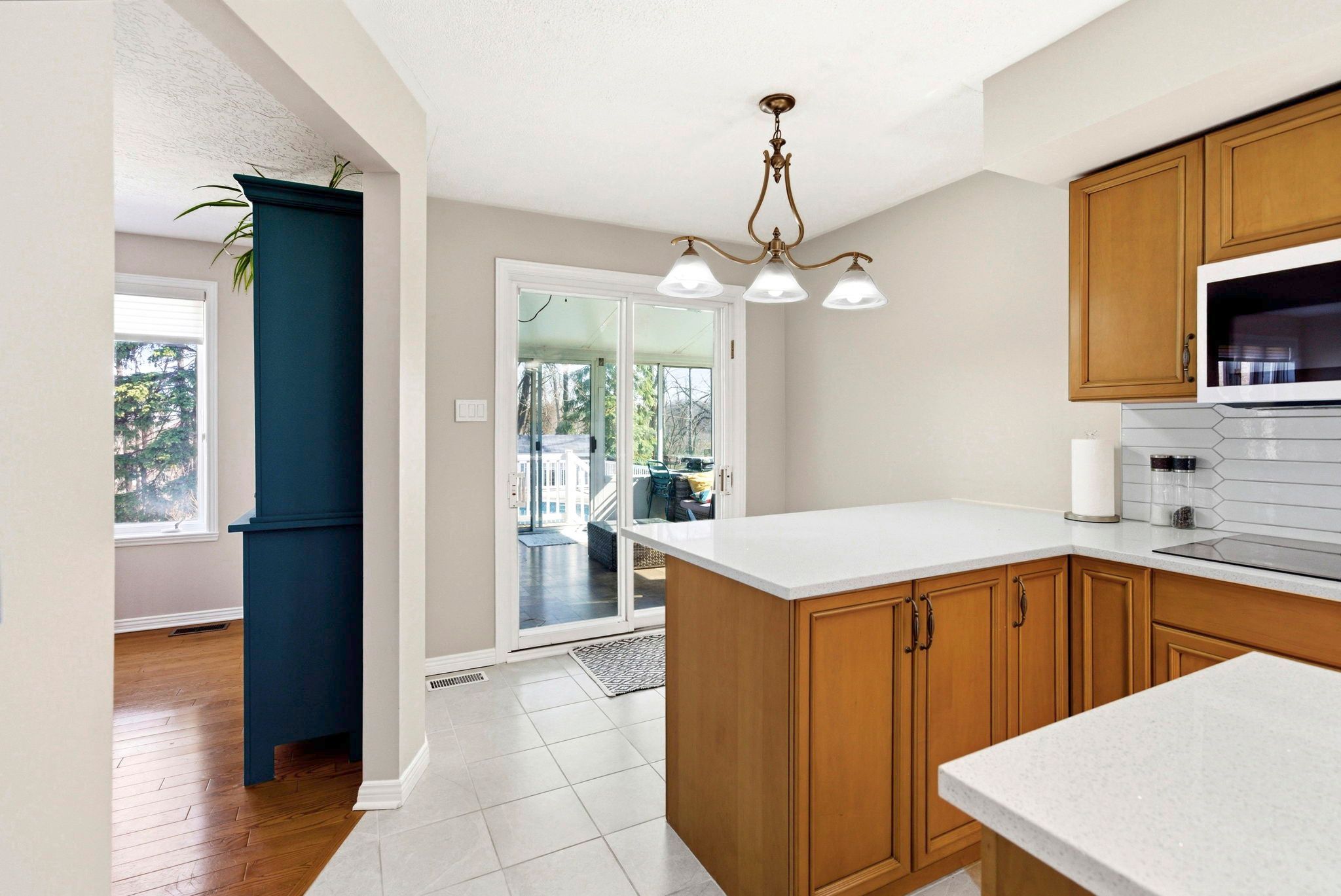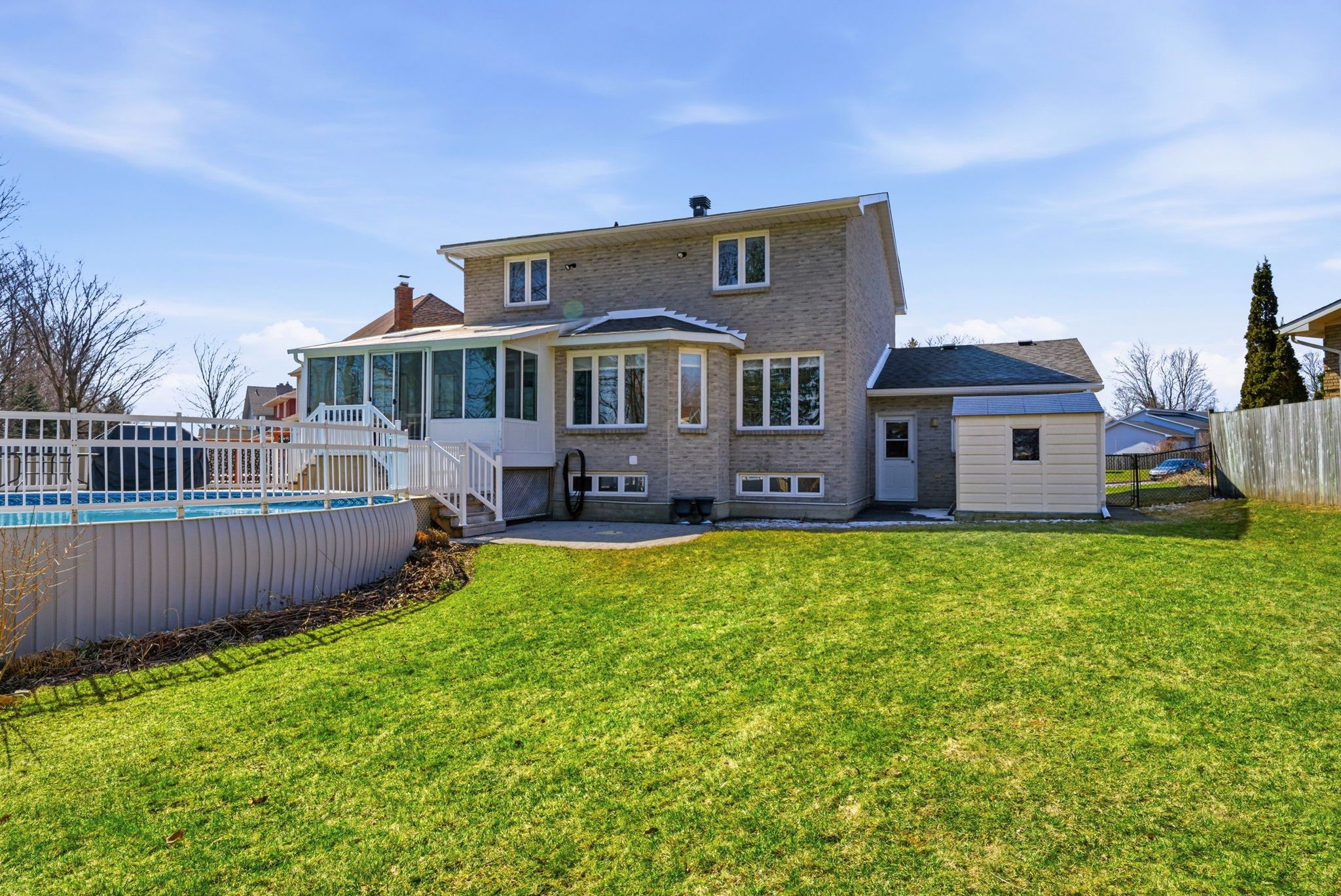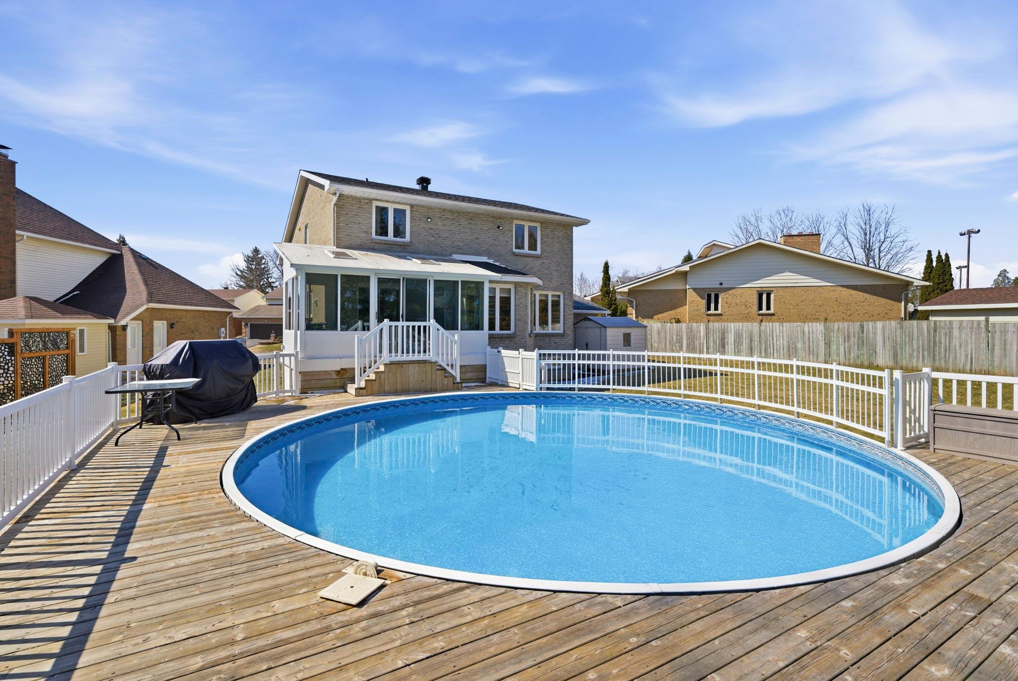 Don't miss out on this beautiful home! Welcome to this spacious and unique 2,252 sq. Ft. Five-level split home, offering the perfect blend of comfort, functionality, and style. Featuring 3+1 bedrooms, this home provides plenty of space for families of all sizes. Enjoy the convenience of a main floor family room and main floor laundry, designed for easy everyday living. The updated kitchen showcases quartz countertops and ceramic flooring, making it both modern and practical. The home also boasts a stunning cathedral ceiling in the living area, creating a bright and open atmosphere, along with a cozy loft featuring a wood fireplace-perfect for relaxing evenings. Step into the gorgeous sunroom at the back of the home, which leads to a deck and an above-ground heated pool with pool shed, ideal for entertaining and enjoying the outdoors. The huge primary bedroom with ensuite bath provides a private retreat. Additional features include gas heating with central air, a fully finished basement, and a single attached garage. Located on a quiet street close to all amenities, including schools, this home truly has it all. A must-see property. Book your showing today!