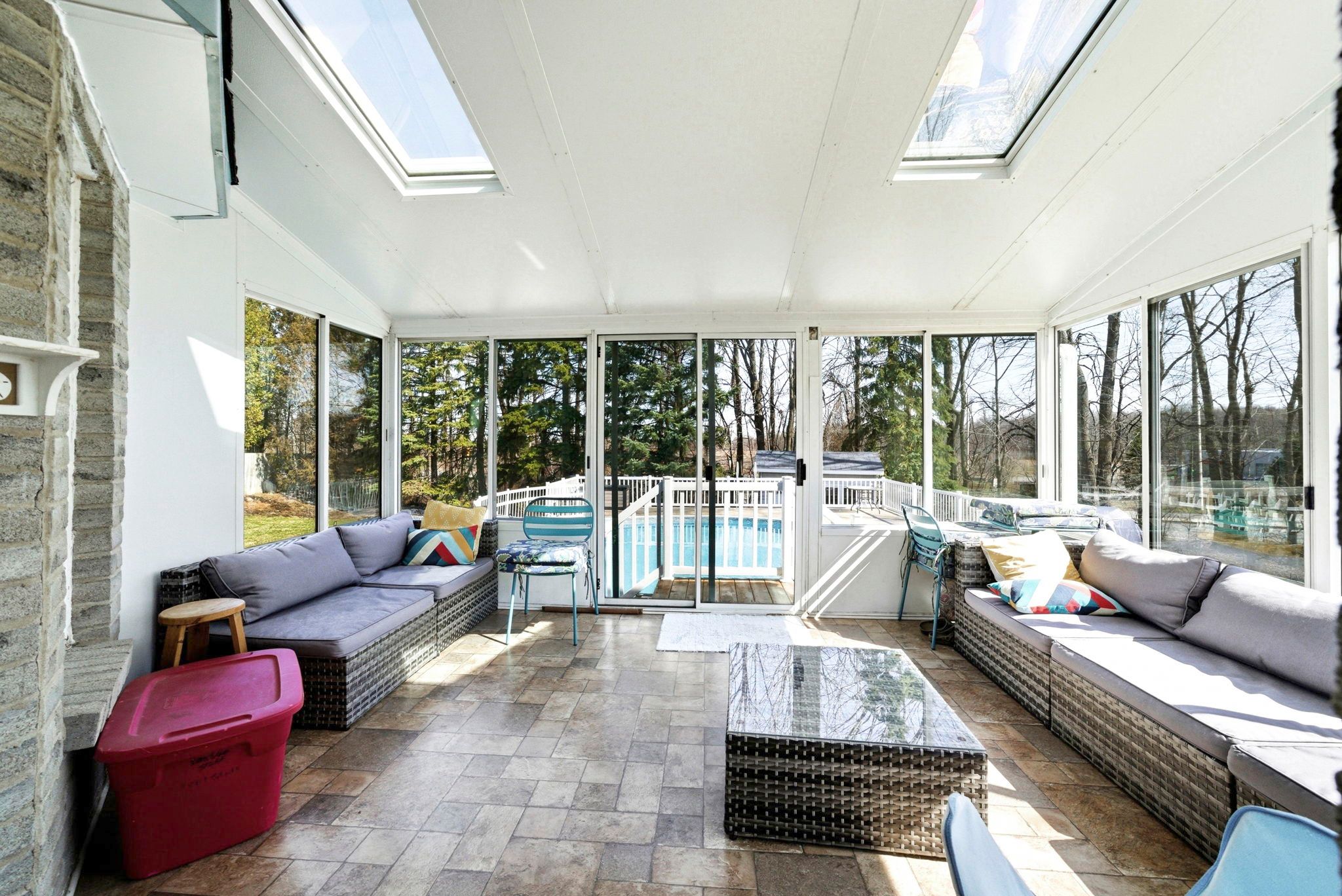 • Gorgeous sunroom leads to deck and heated above-ground pool.