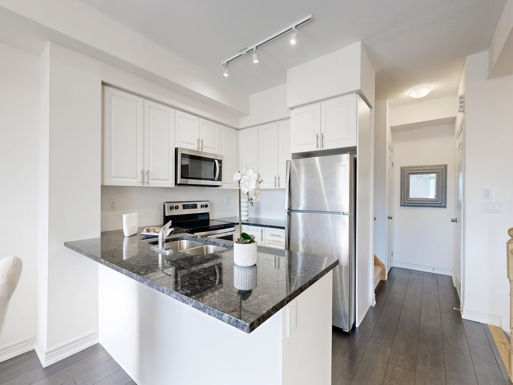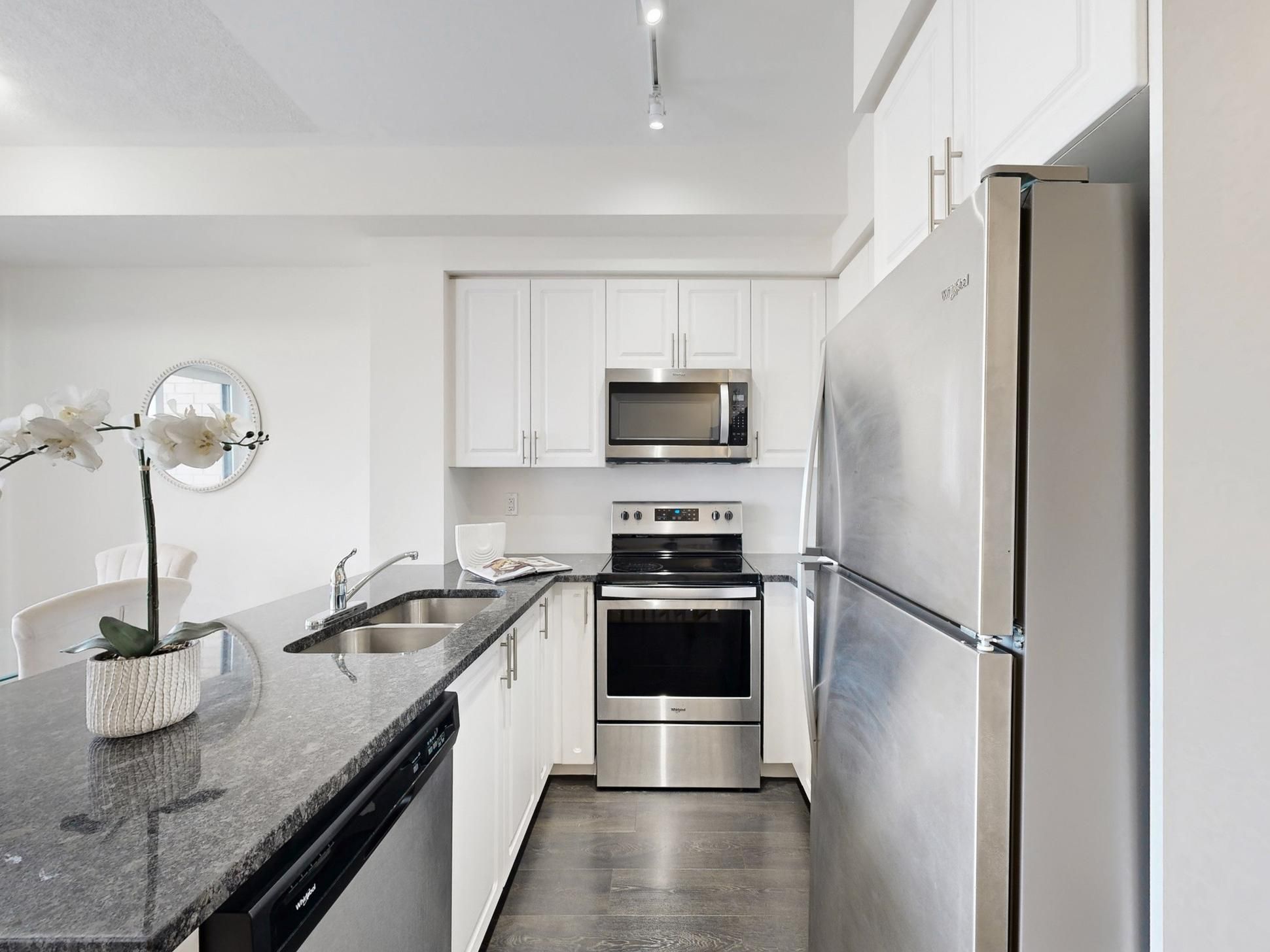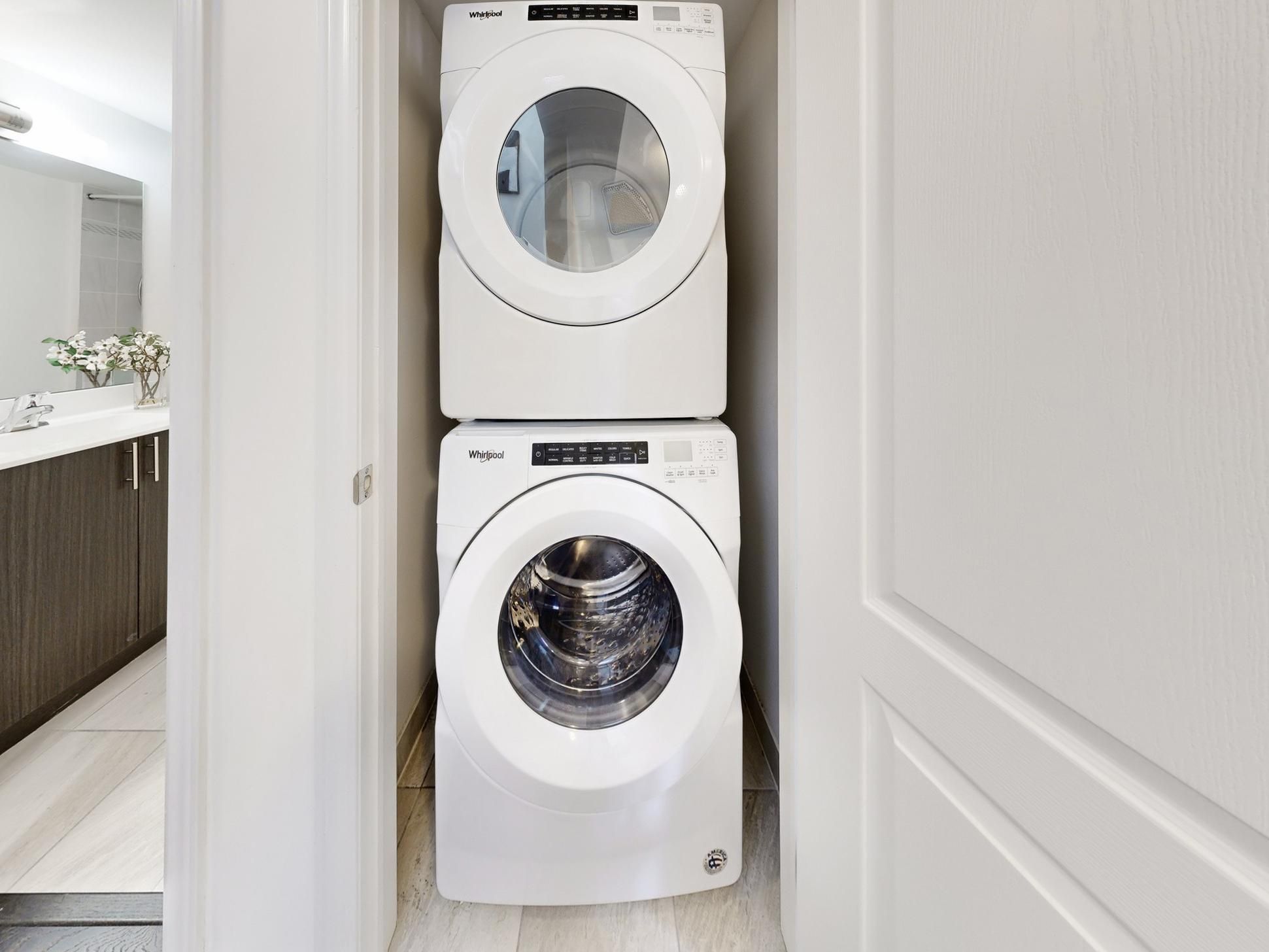 • Convenient stacked laundry and modern kitchen with granite countertops.