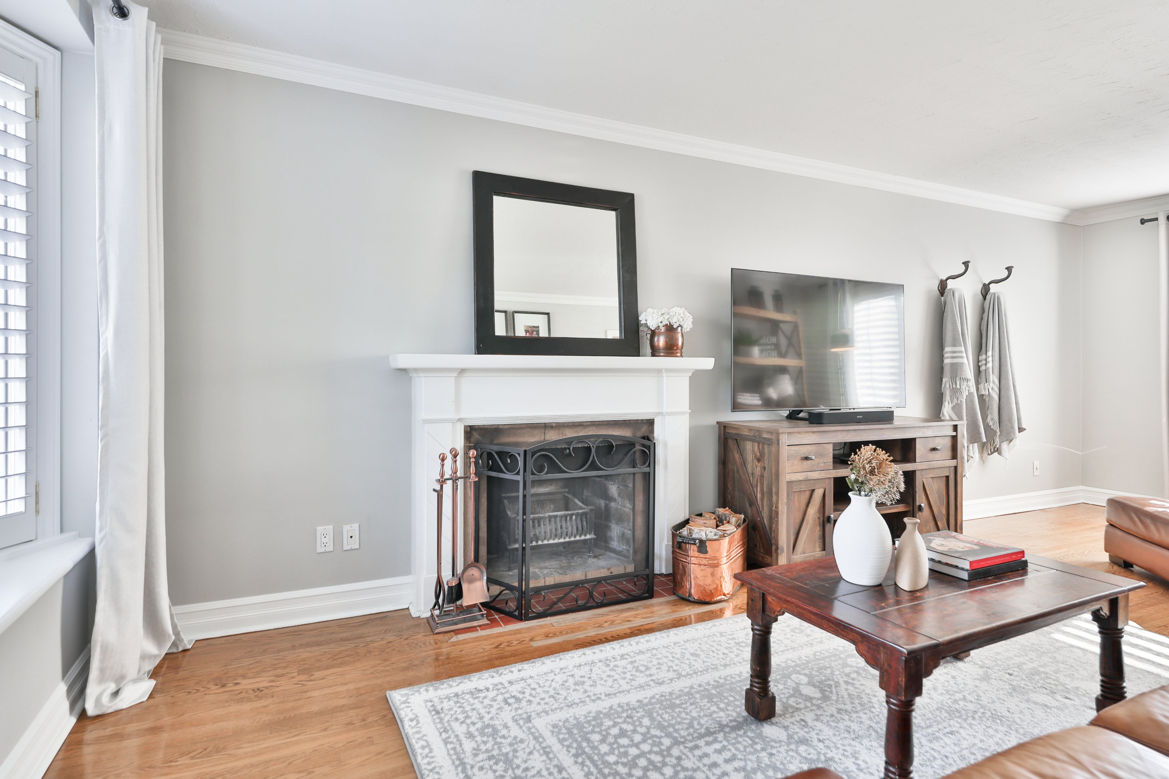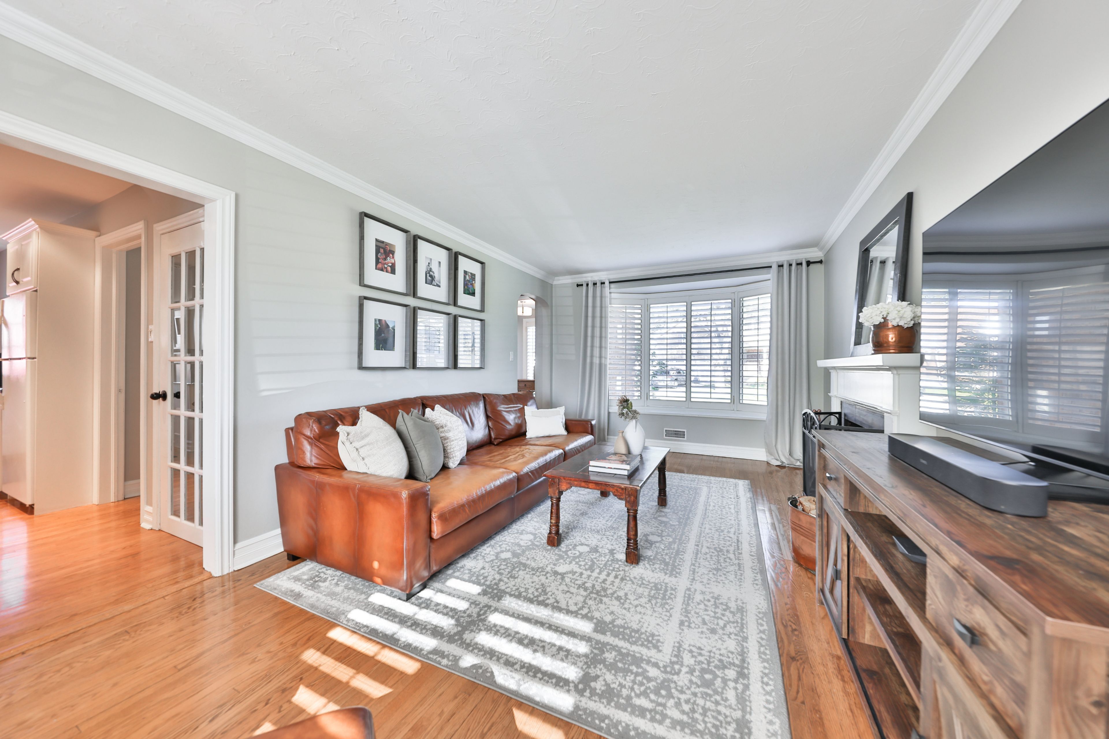 • Spacious living room with a cozy wood-burning fireplace and window seat.
