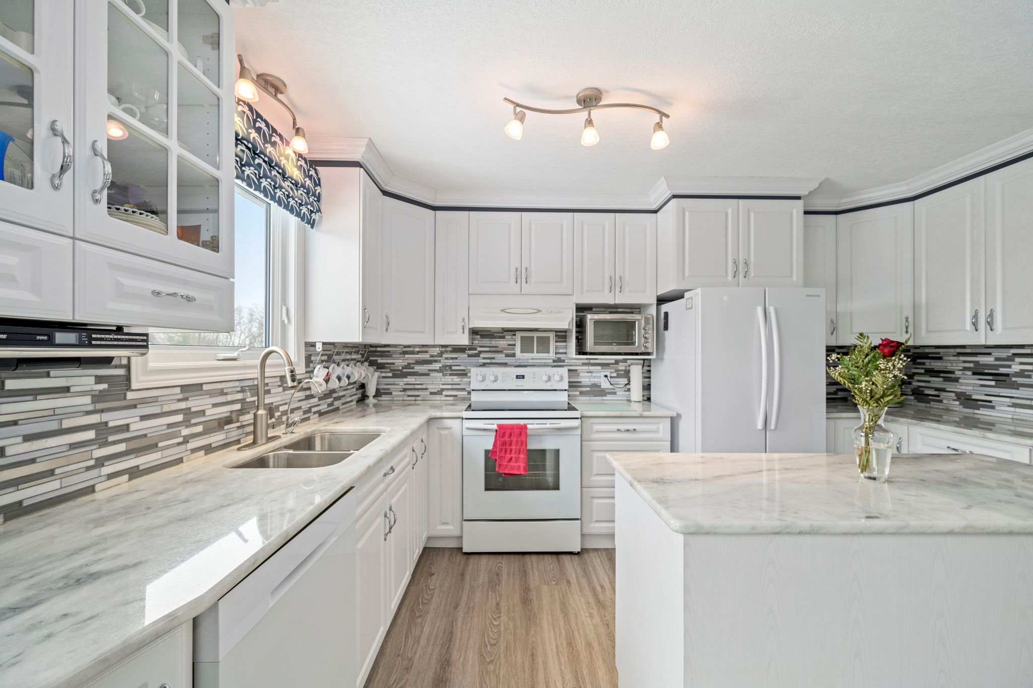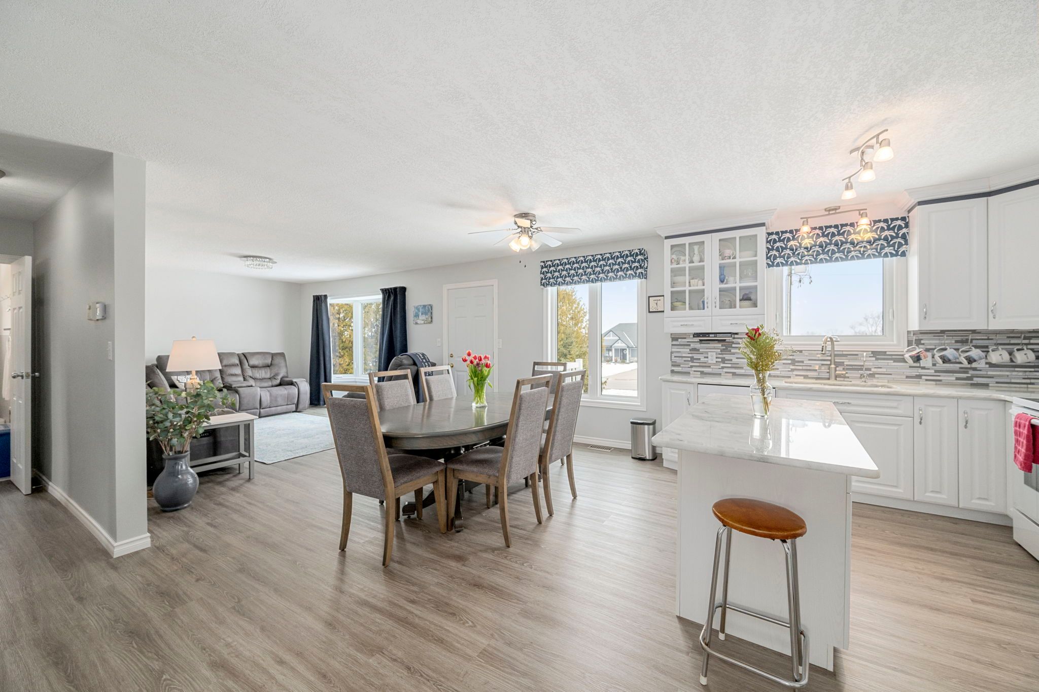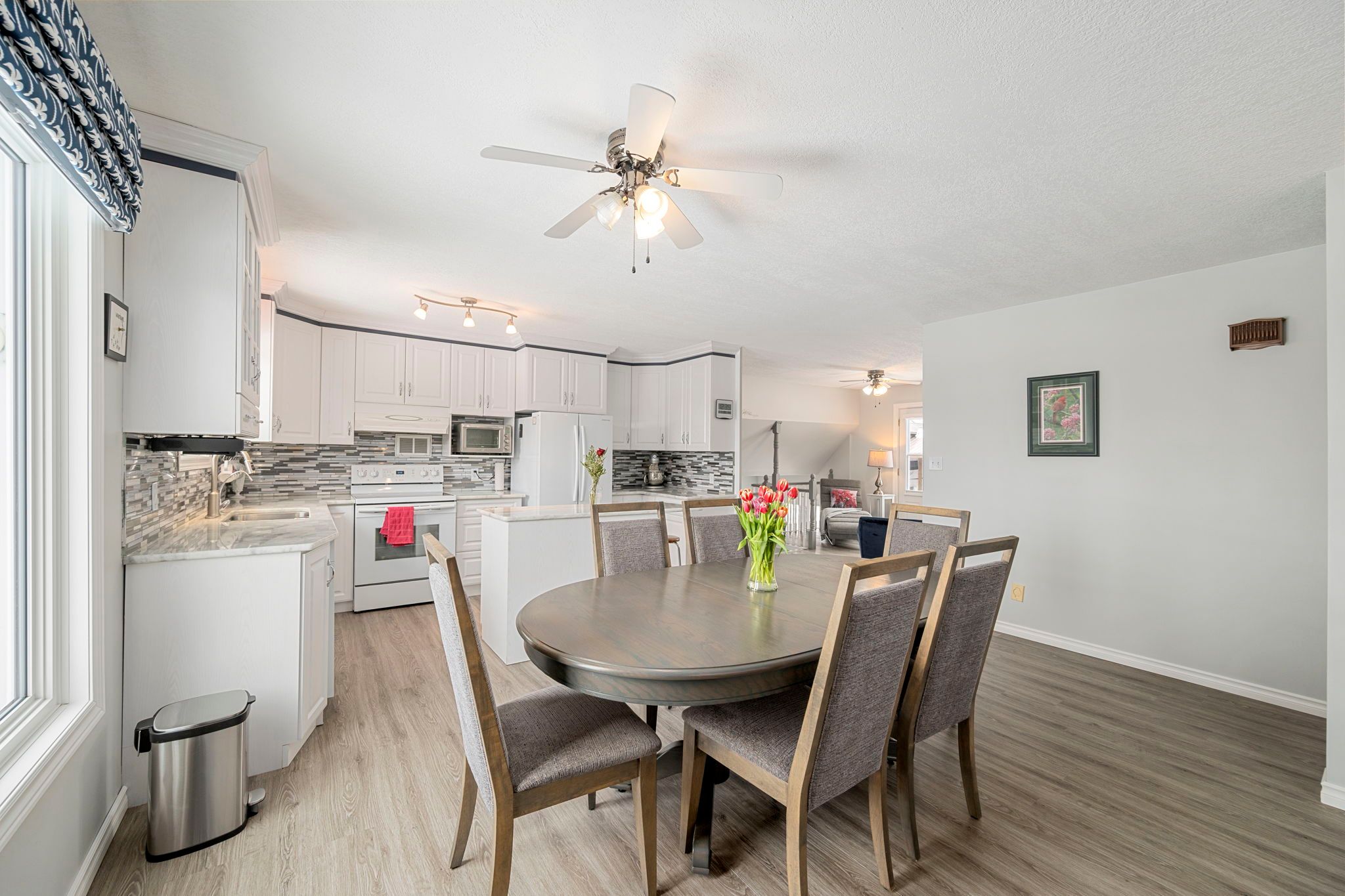 • Bright kitchen with granite countertops and a cozy sitting area.