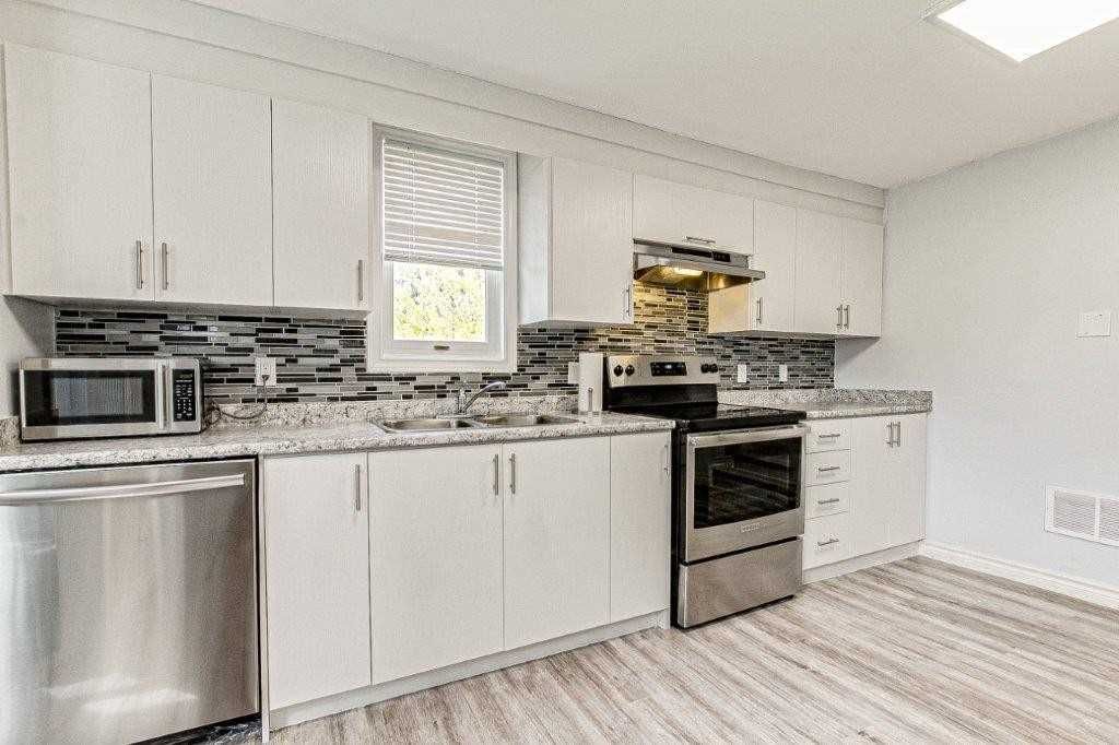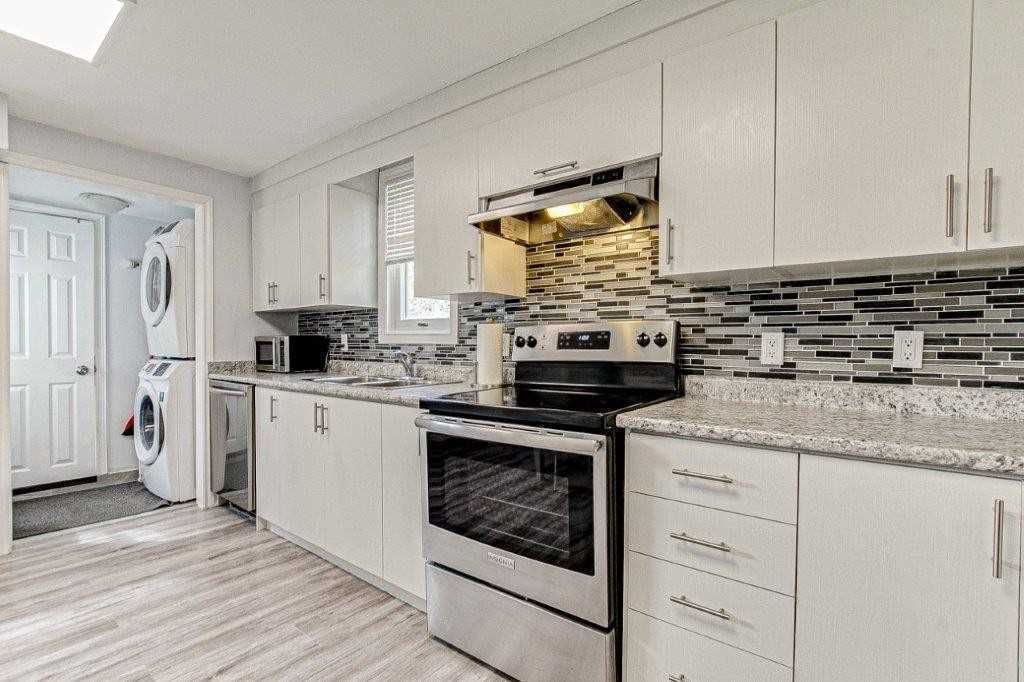 Charming two-bedroom, two-bathroom bungalow situated on an exceptionally large lot. The property has been fully renovated and features a brand-new kitchen, new laminate flooring throughout, smooth ceilings, newly updated bathrooms, and a new roof. Additional upgrades include all new stainless steel appliances, a new front-loading washer and dryer, new central air conditioning, and a new hot water tank. One bedroom includes a private ensuite. The laundry area provides direct access to a spacious patio and a beautifully fully fenced backyard, complete with a large deck-ideal for outdoor entertaining. Conveniently located within walking distance to schools, restaurants, and shopping, with quick access to highway 401 just five minutes away.