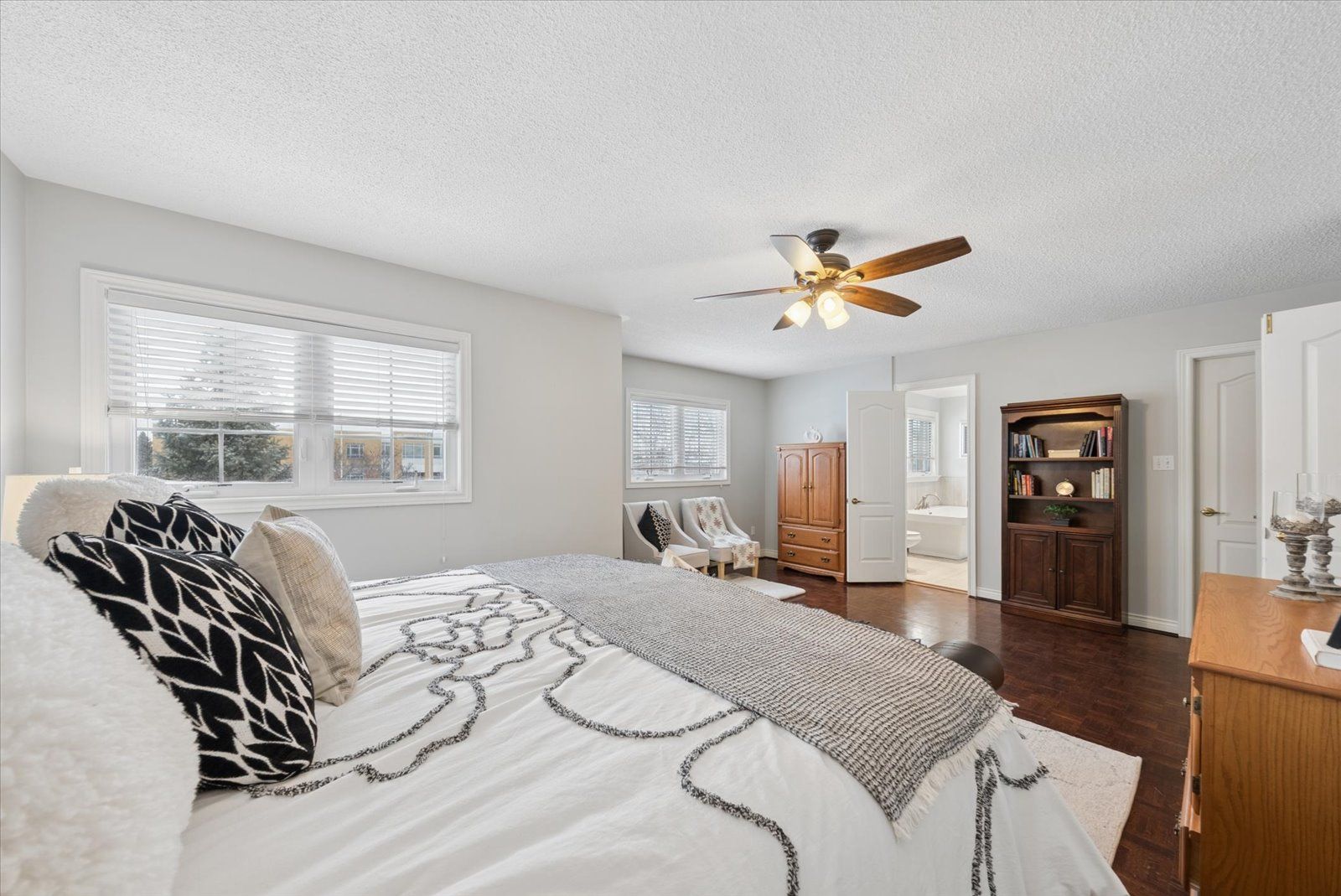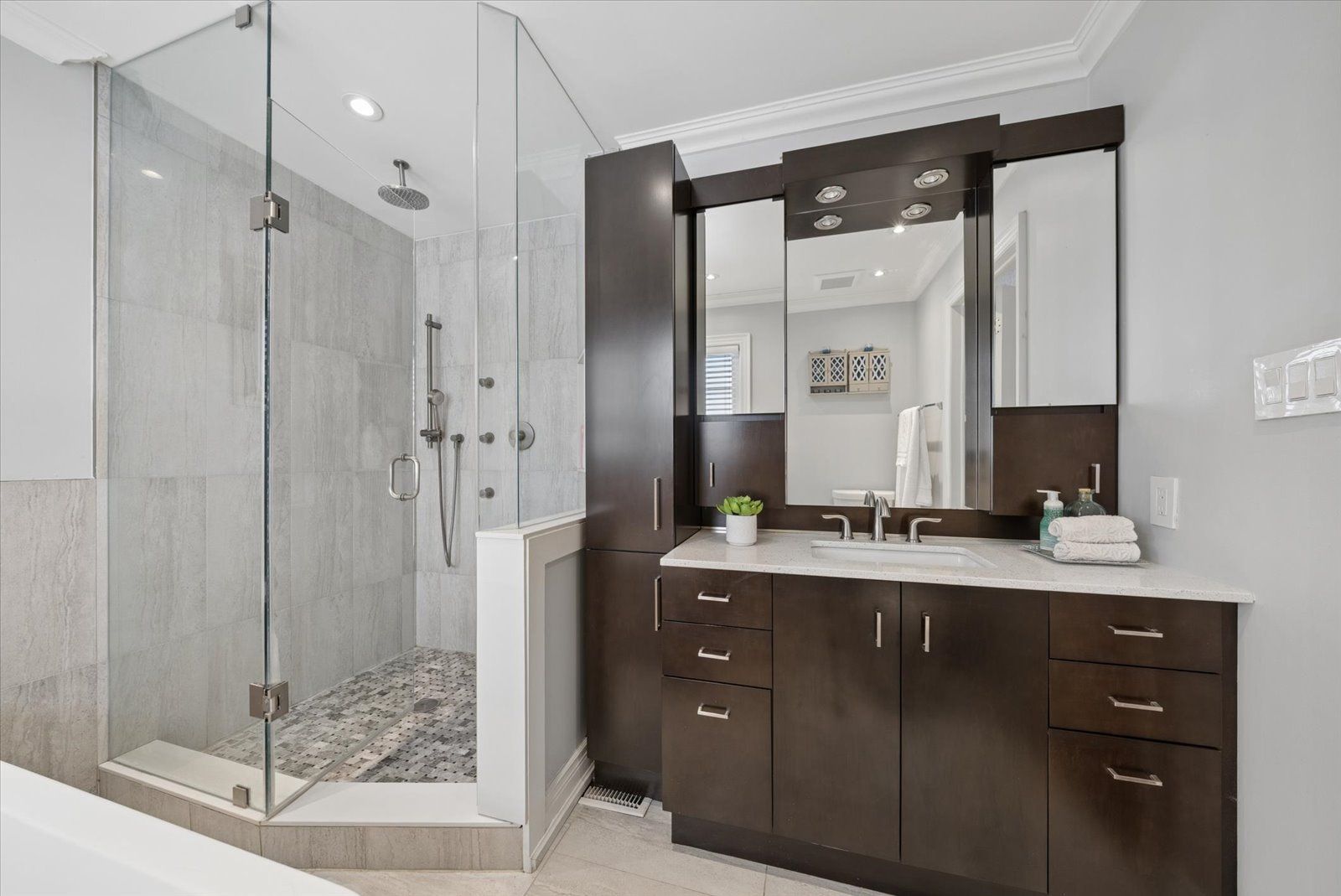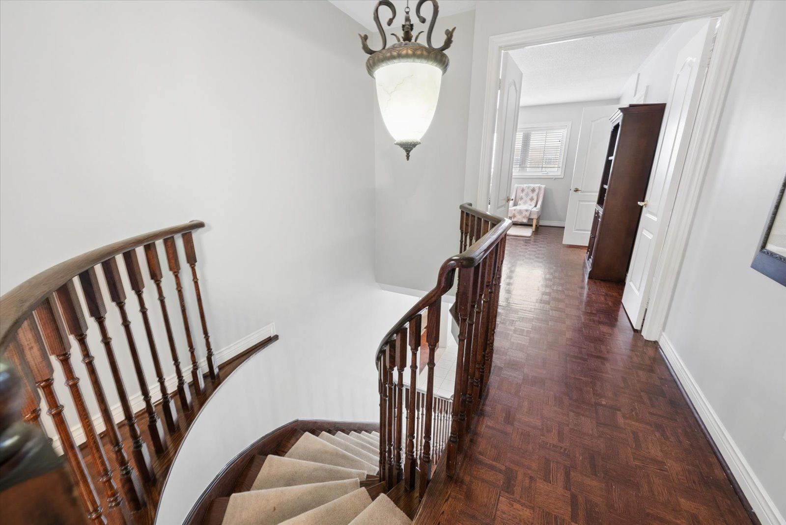 Fabulous 4 bedrm detach situated on a 40 ft lot in the highly desirable west woodbridge! This bright and spacious layout is designed for family living & entertaining: large eat-in kitchen with newer stainless steel appliances and a walkout to an inviting deck; bright sunroom with two skylights; open -concept living & dining with elegant parquet floors. The main floor features a family room with open brick fireplace , a grand foyer w/ a circular oak staircase, and a laundry room with separate garage entrance & service stairs to the basement . Expansive primary bedroom with renovated ensuite - quartz countertops, soaker tub & a glass shower- plus 3 additional generous bedrooms & a sizeable 4 pc main bath. Professionally finished basement with terracotta tiles, built-in cabinets, gas fireplace, wet bar , music room, & a designer 3 pc bathroom w/jacuzzi tub. Executive touches include interlock driveway and walkway, fully fenced yard, deck with pergola. Steps to top -rated schools (including the acclaimed st. Angela merici c. S.), as well as transit, parks restaurants ,shopping & more -a must see!!