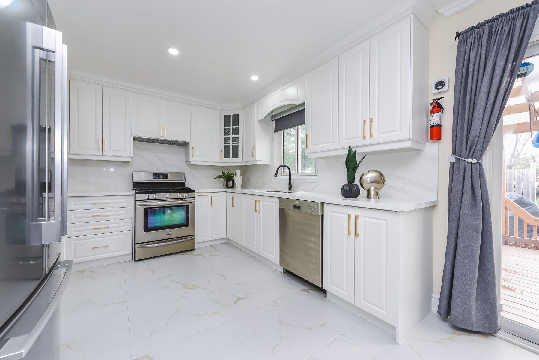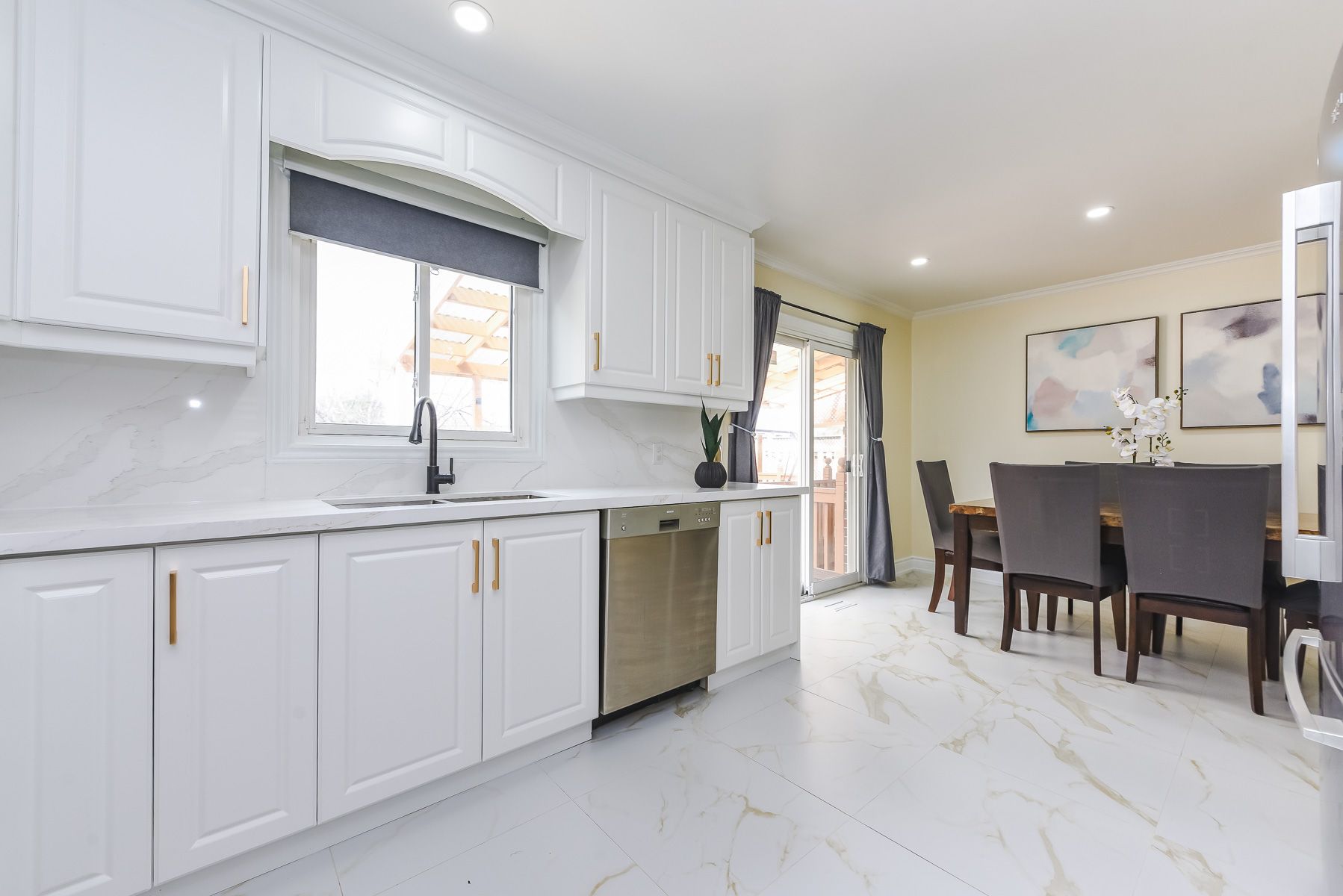 • Modern kitchen with a breakfast area overlooking the deck and park.