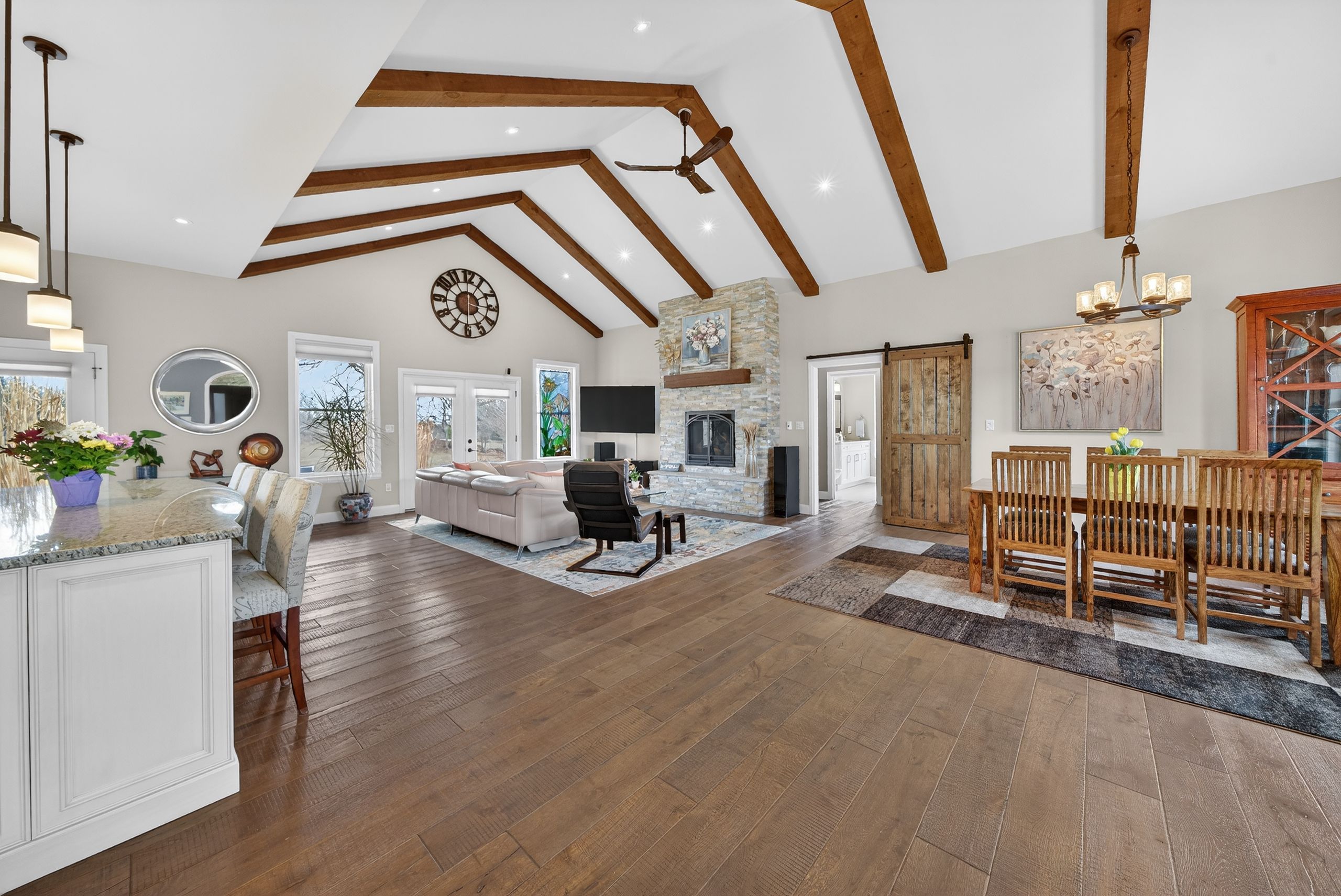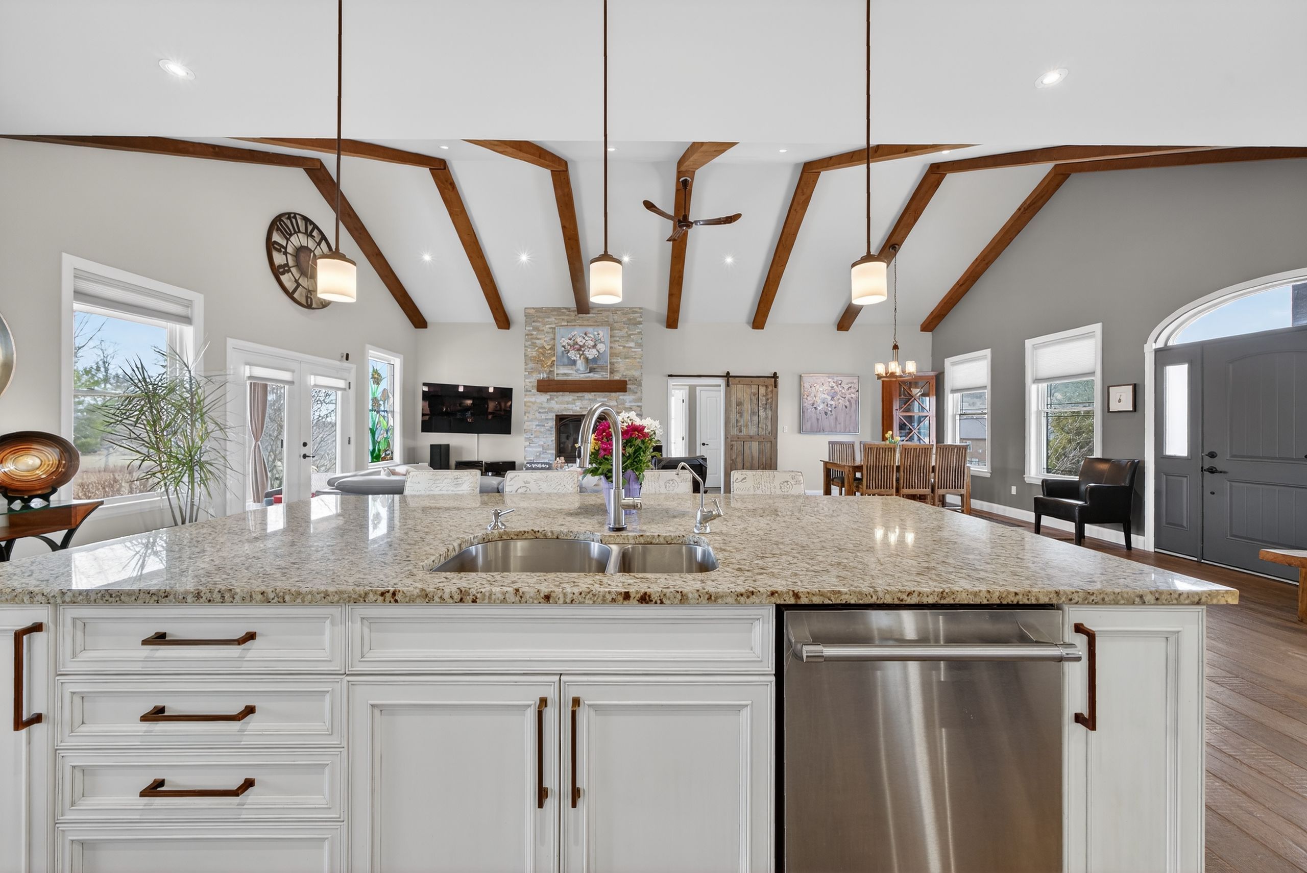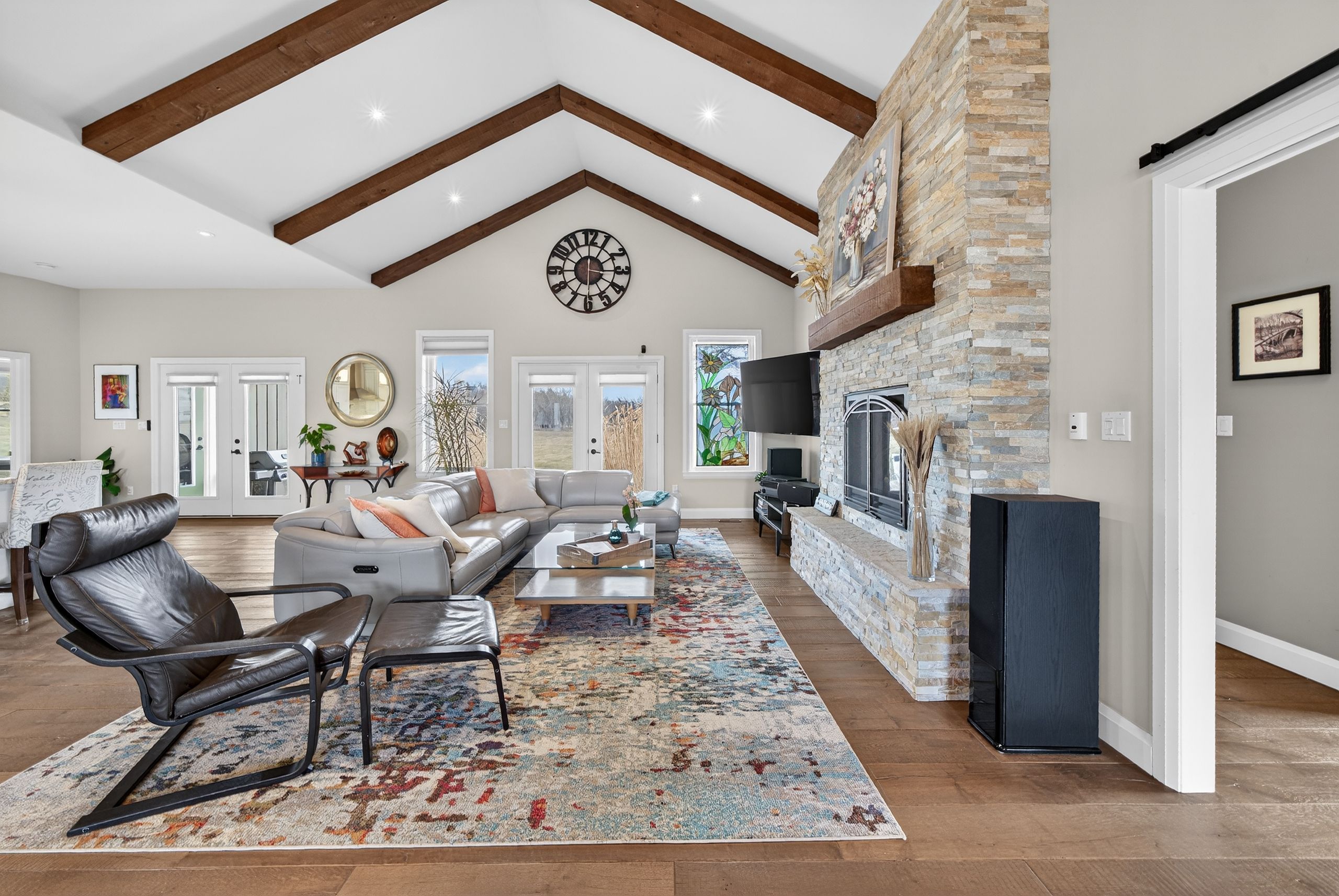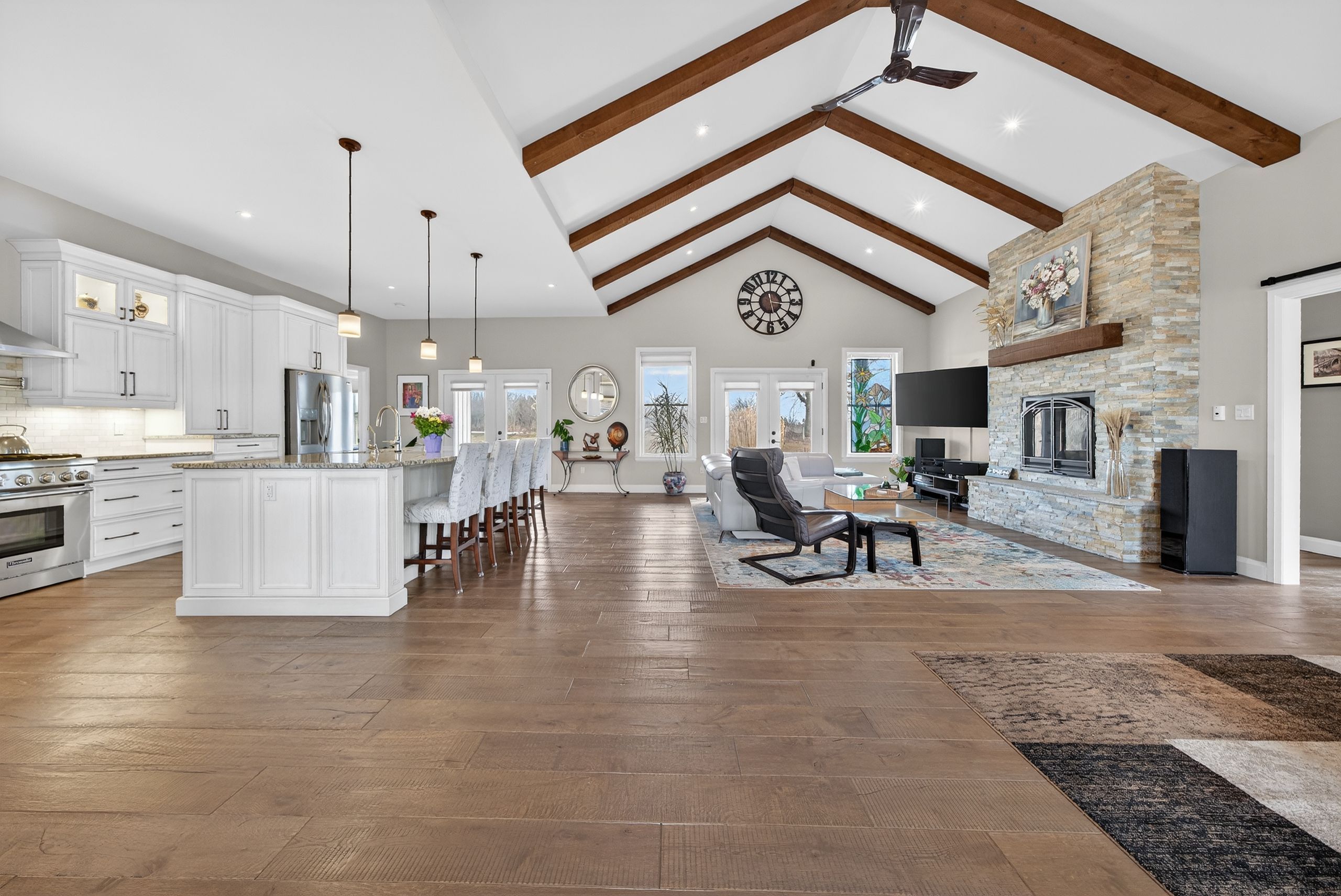 • Open-concept main floor with vaulted ceilings and floor-to-ceiling stone fireplace.