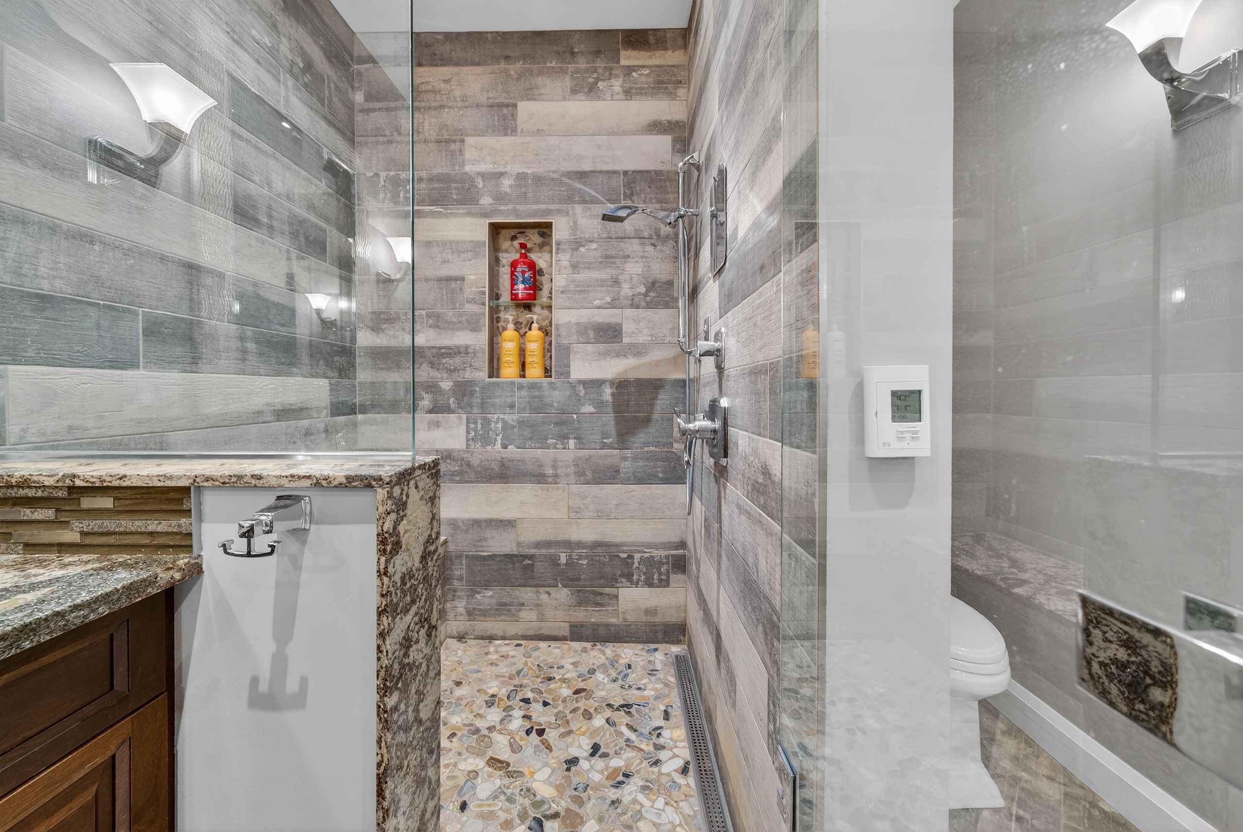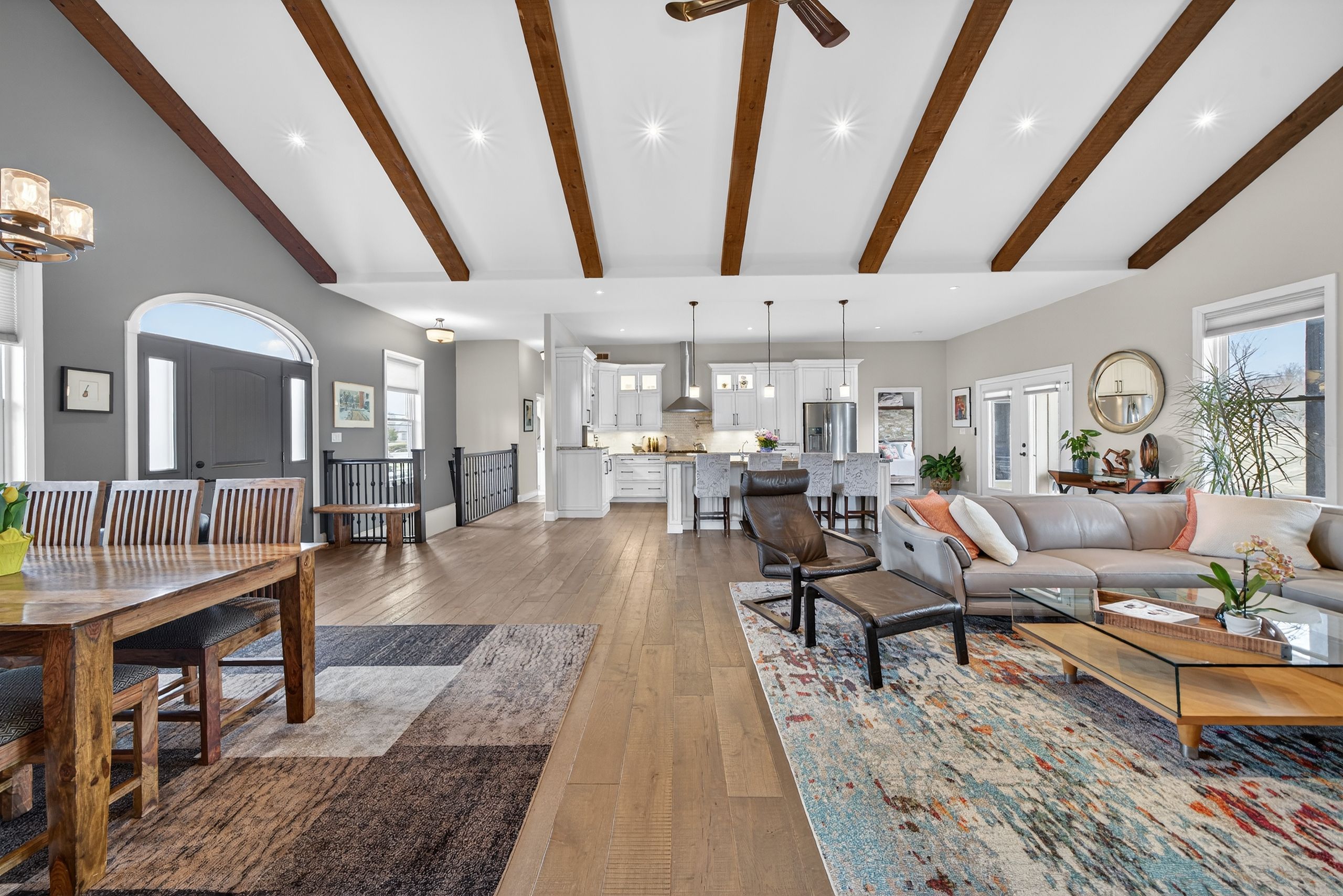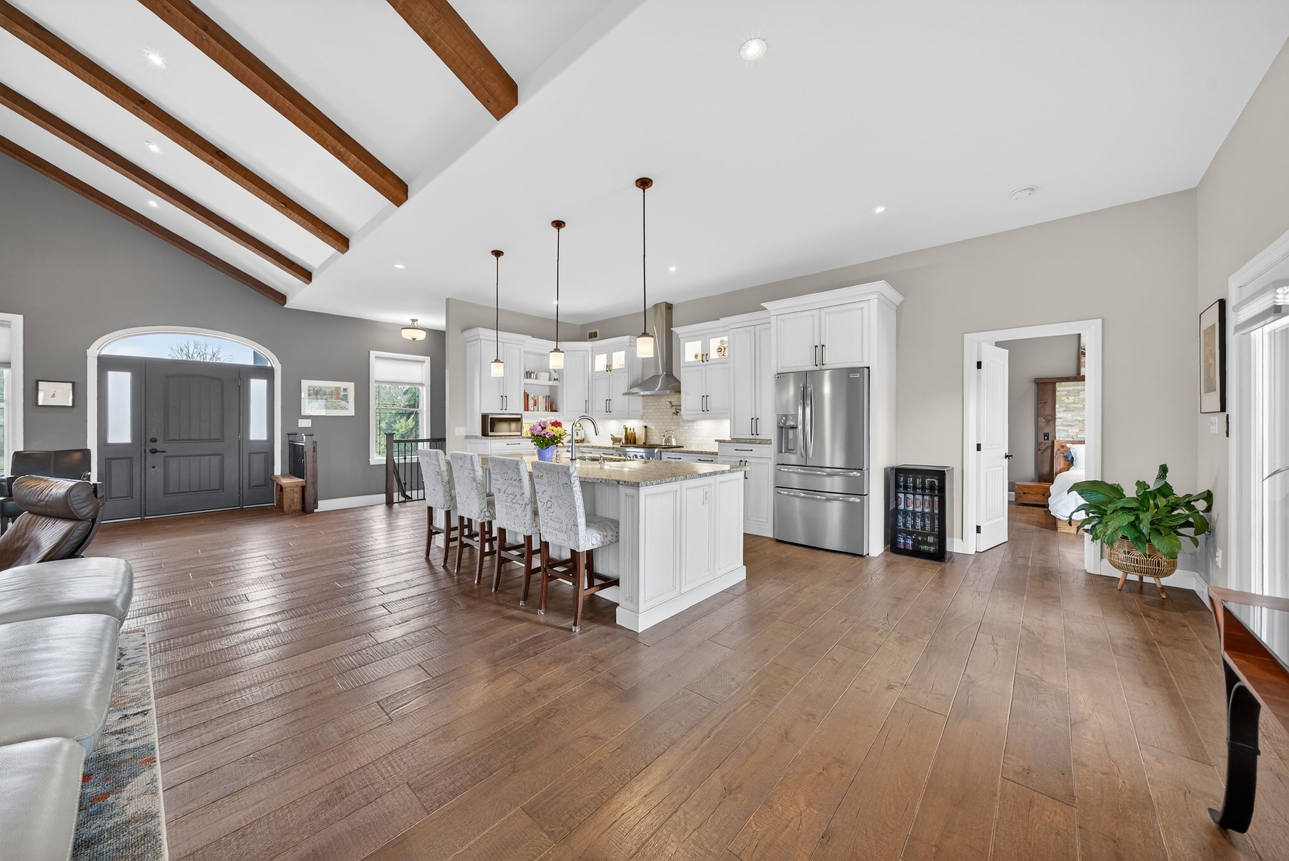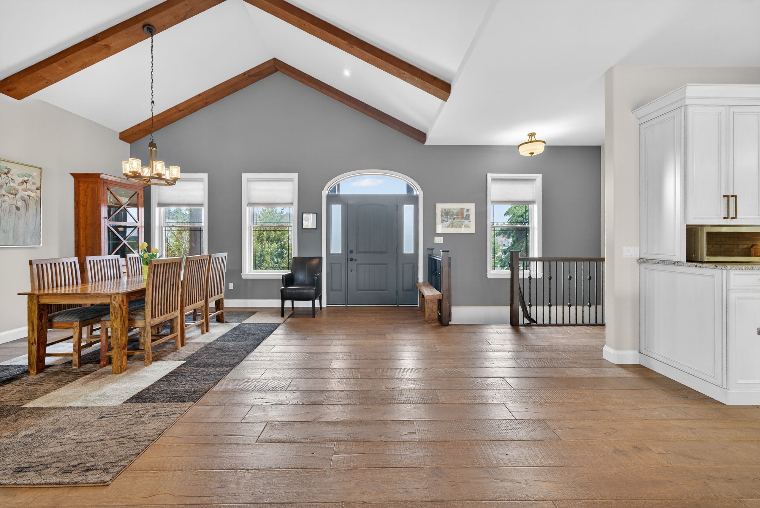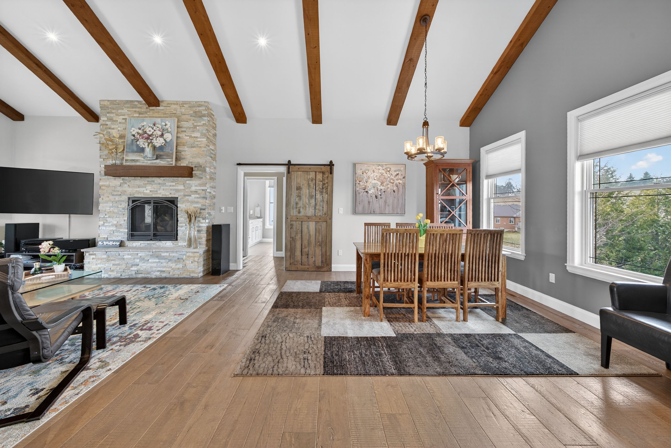 • Open-concept main floor with vaulted ceilings and floor-to-ceiling stone fireplace.