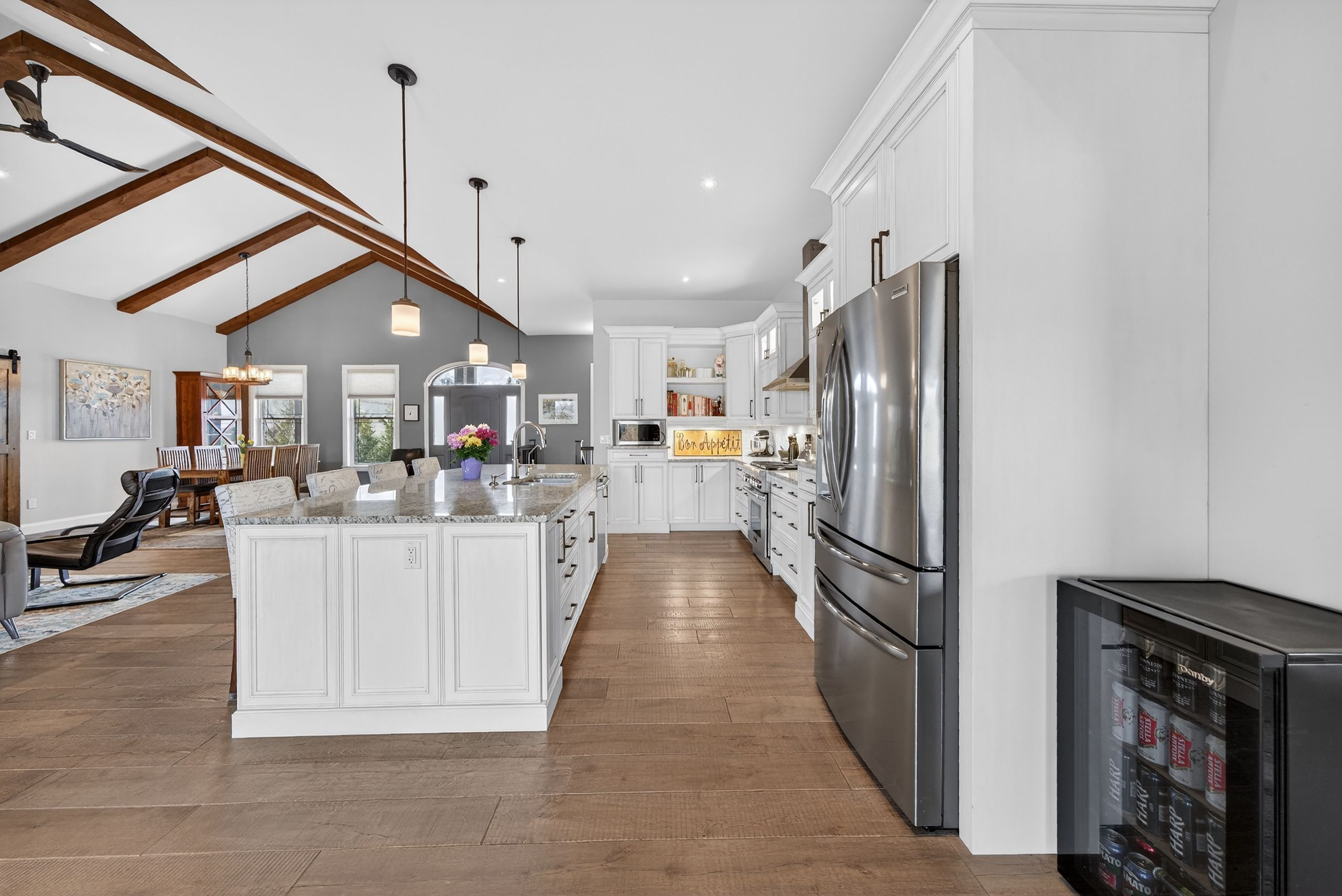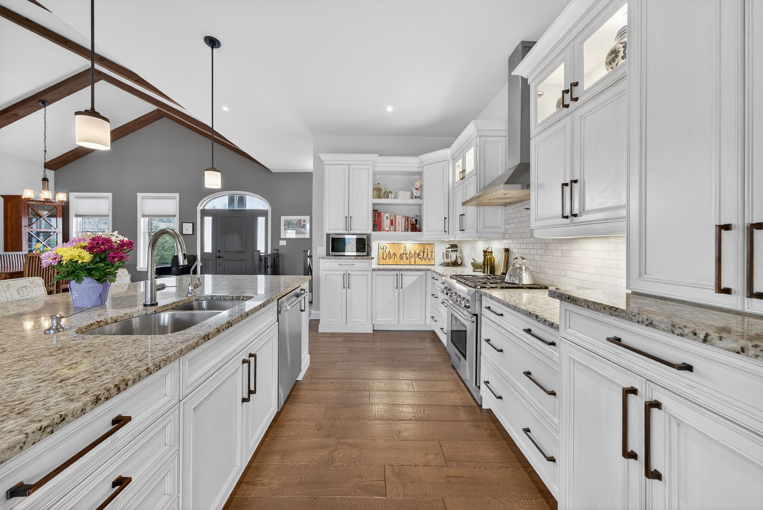 • Chef's kitchen featuring granite counters, oversized island, and premium gas stove.