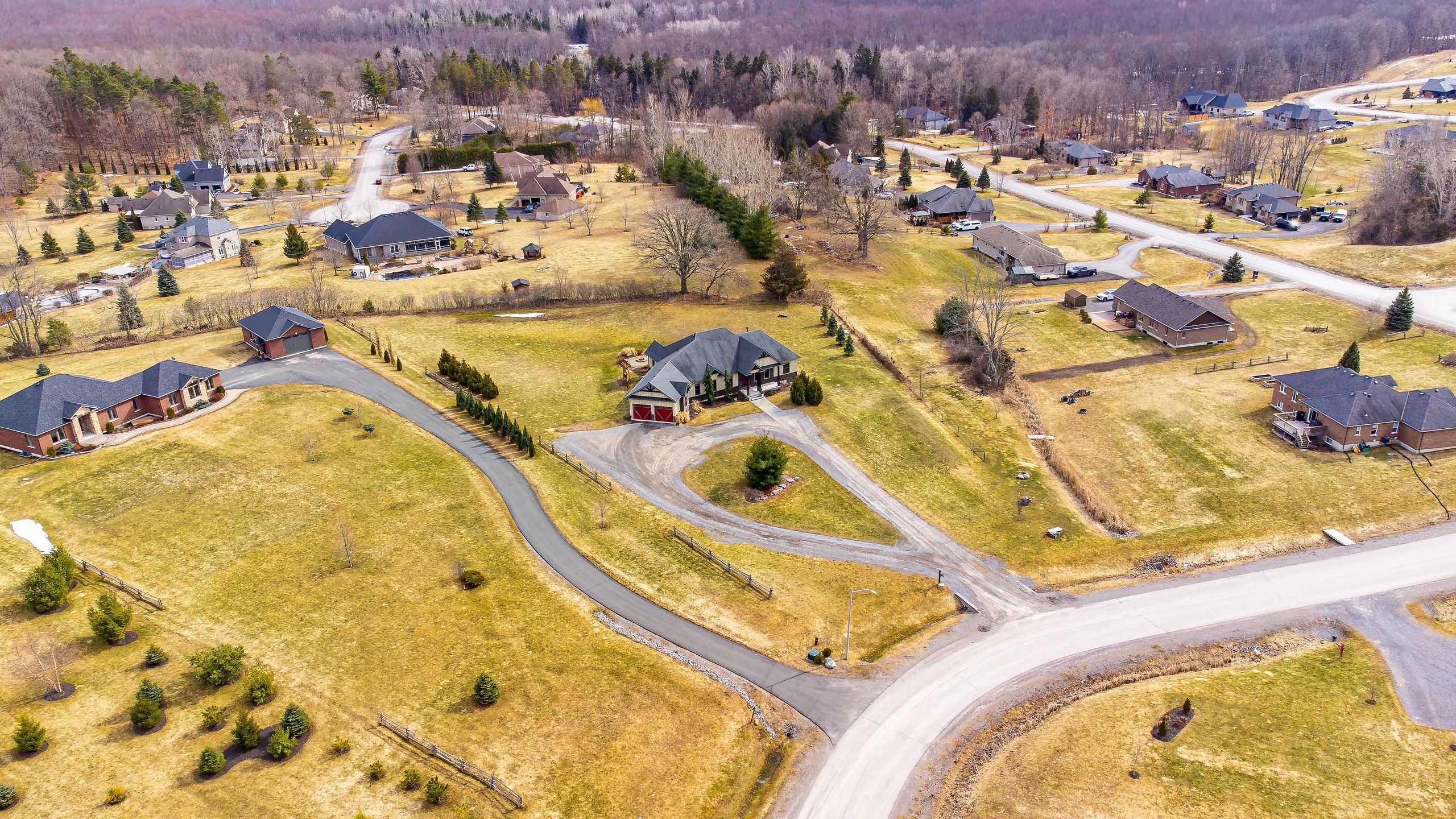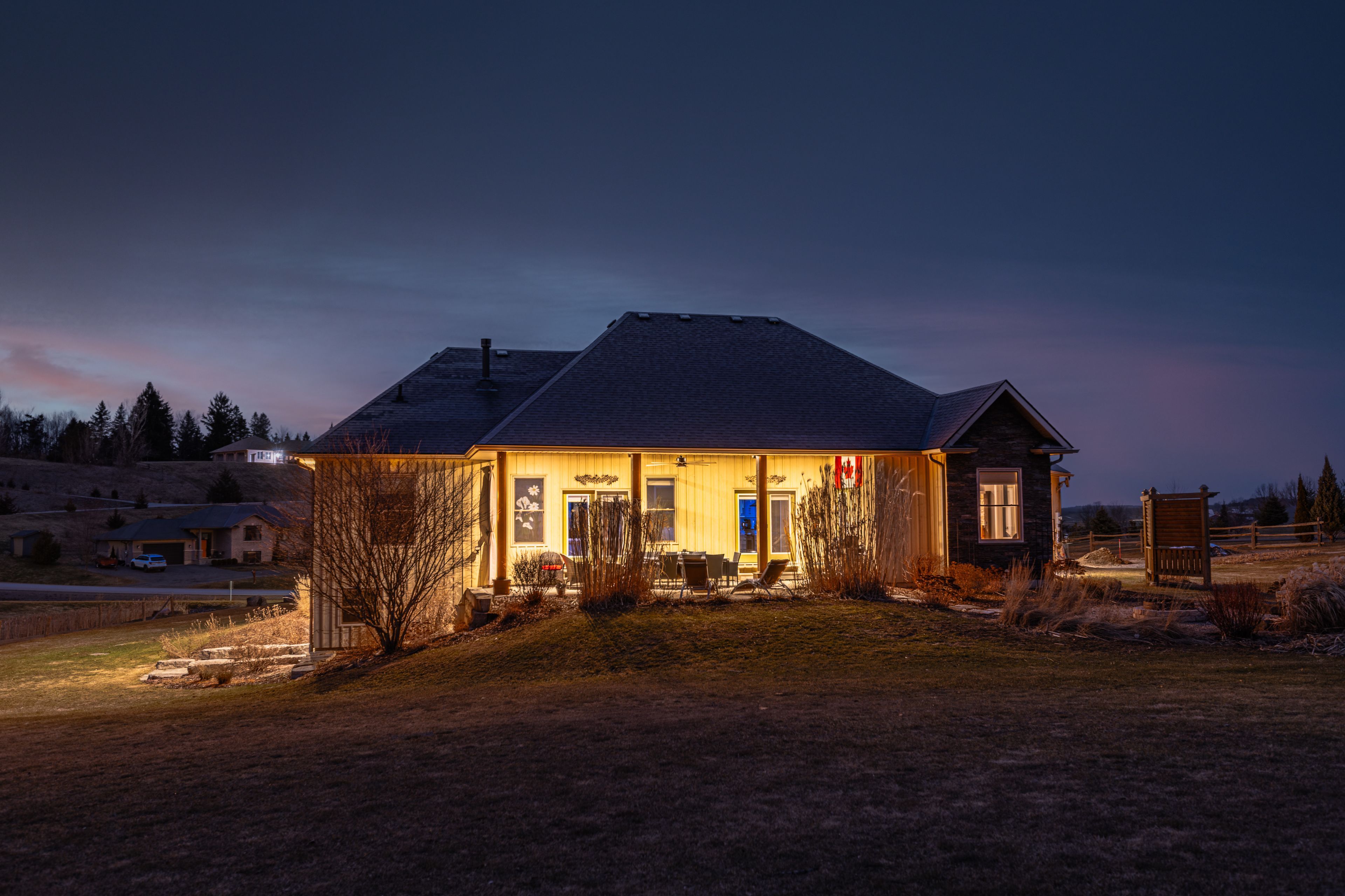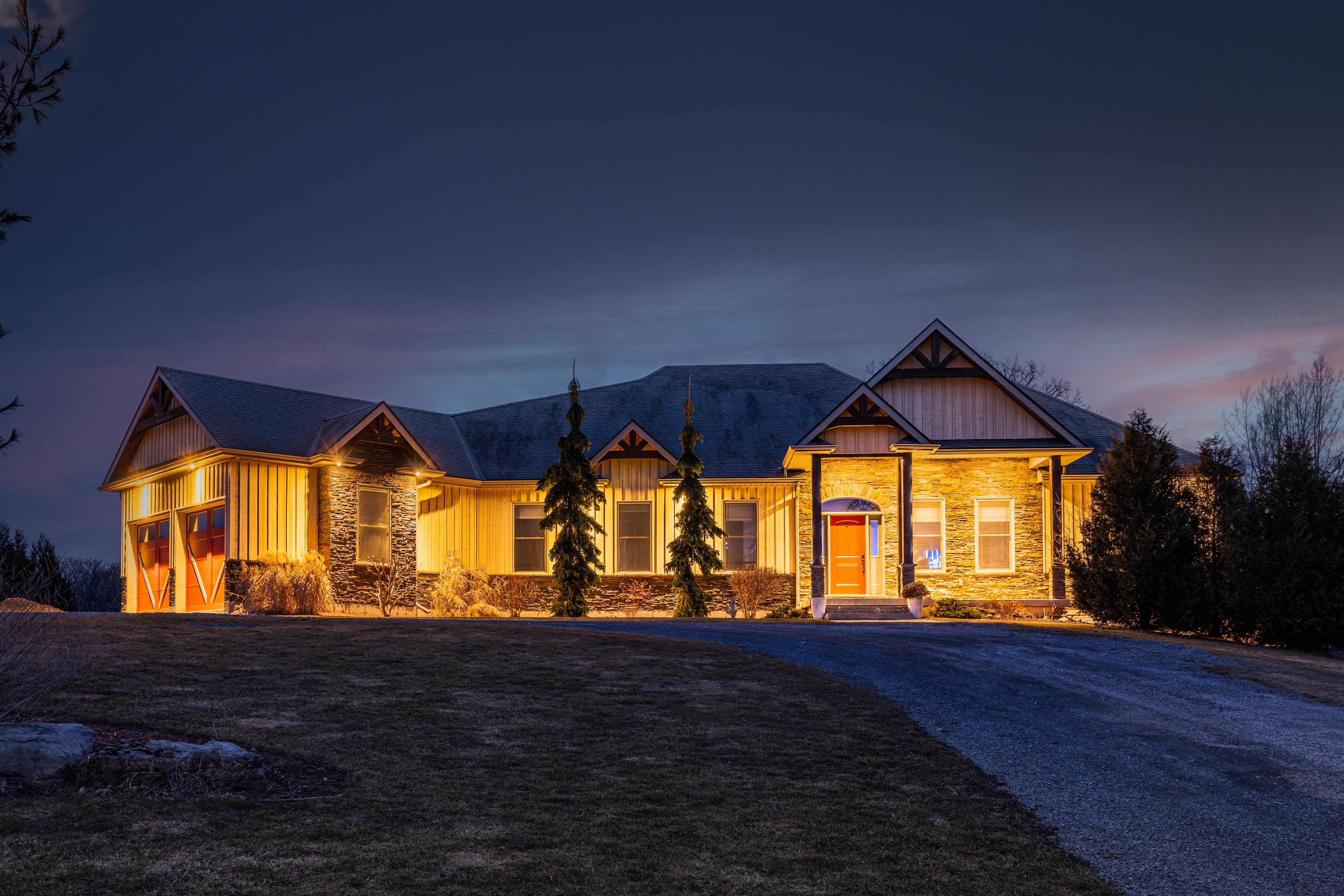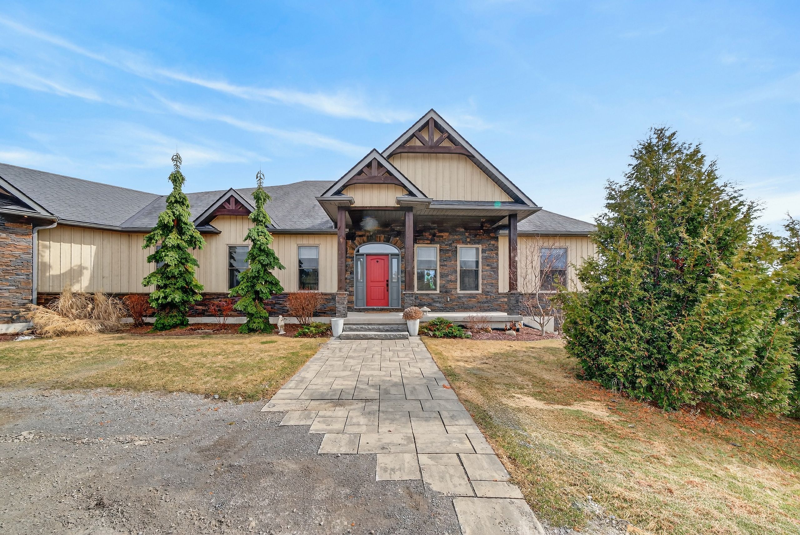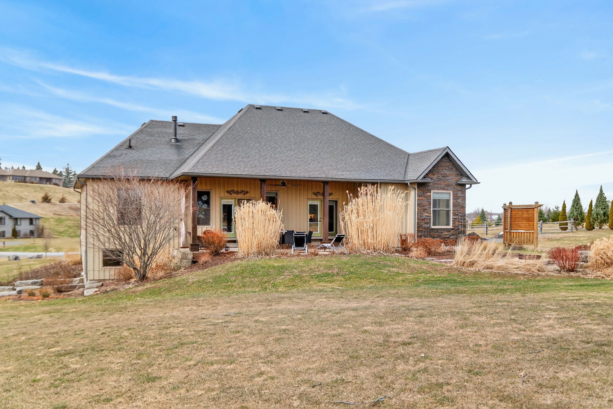 Welcome to this exquisite custom-built board-&-batten & stone bungalow, perfectly perched on a private, elevated lot in the exclusive executive enclave of hearth stone ridge estates. Exuding luxurious rustic charm, the open-concept main floor boasts soaring vaulted ceilings with exposed wood beams, rich hardwood floors, & a magnificent floor-to-ceiling stone fireplace. The chef's dream kitchen features gleaming granite counters, an oversized breakfast bar island, a pull-out pantry, & a premium gas stove complete with a convenient pot filler. Retreat to the primary suite showcasing a cozy built-in window seat, a custom headboard, a massive walk-in closet with more built-ins, & a gorgeous ensuite bath with his-&-hers sinks. Two additional spacious bedrooms & a 4-piece bath complete the main sleeping quarters, while a stylish mudroom offers laundry, more granite counters, a conveniently located 2-piece powder room, & inside entry to the oversized double-car garage with an excellent storage. The fully finished walk-out basement is an entertainer's paradise, offering an enormous rec room, cold storage, a large bonus bedroom, a beautifully tiled 3-piece bath with a touch-lit mirror, & an acoustically resilient games room complete with an included pool table. Step outside from multiple access points to the private covered interlock stone patio equipped with a virtually new napoleon bbq with gas hook up & take the flagstone path to warm up by the firepit. Enjoy the rare financial benefit of natural gas heating combined with rural well & septic, plus the everyday convenience of central vac. Experience the perfect blend of country tranquility & high-end executive living!