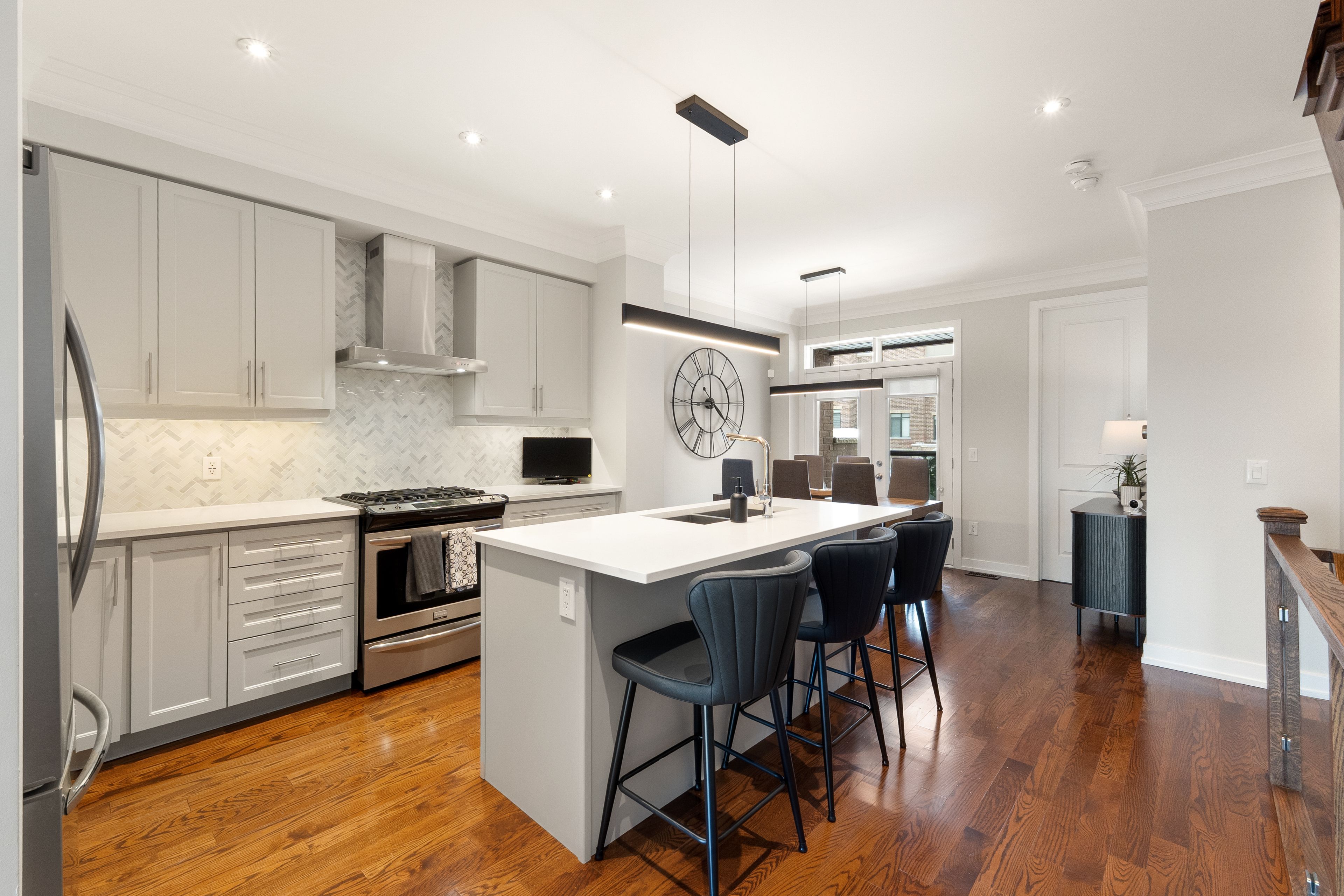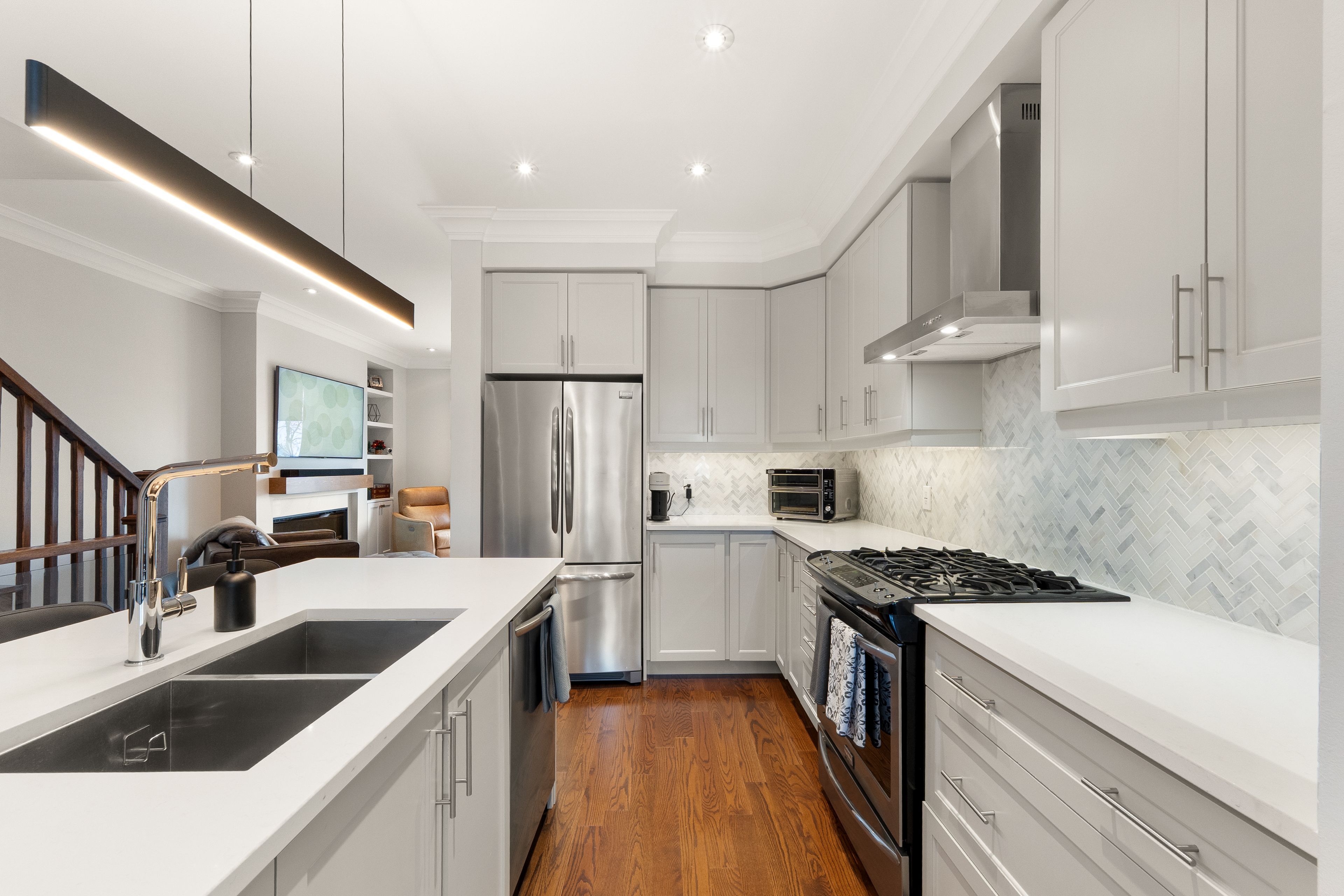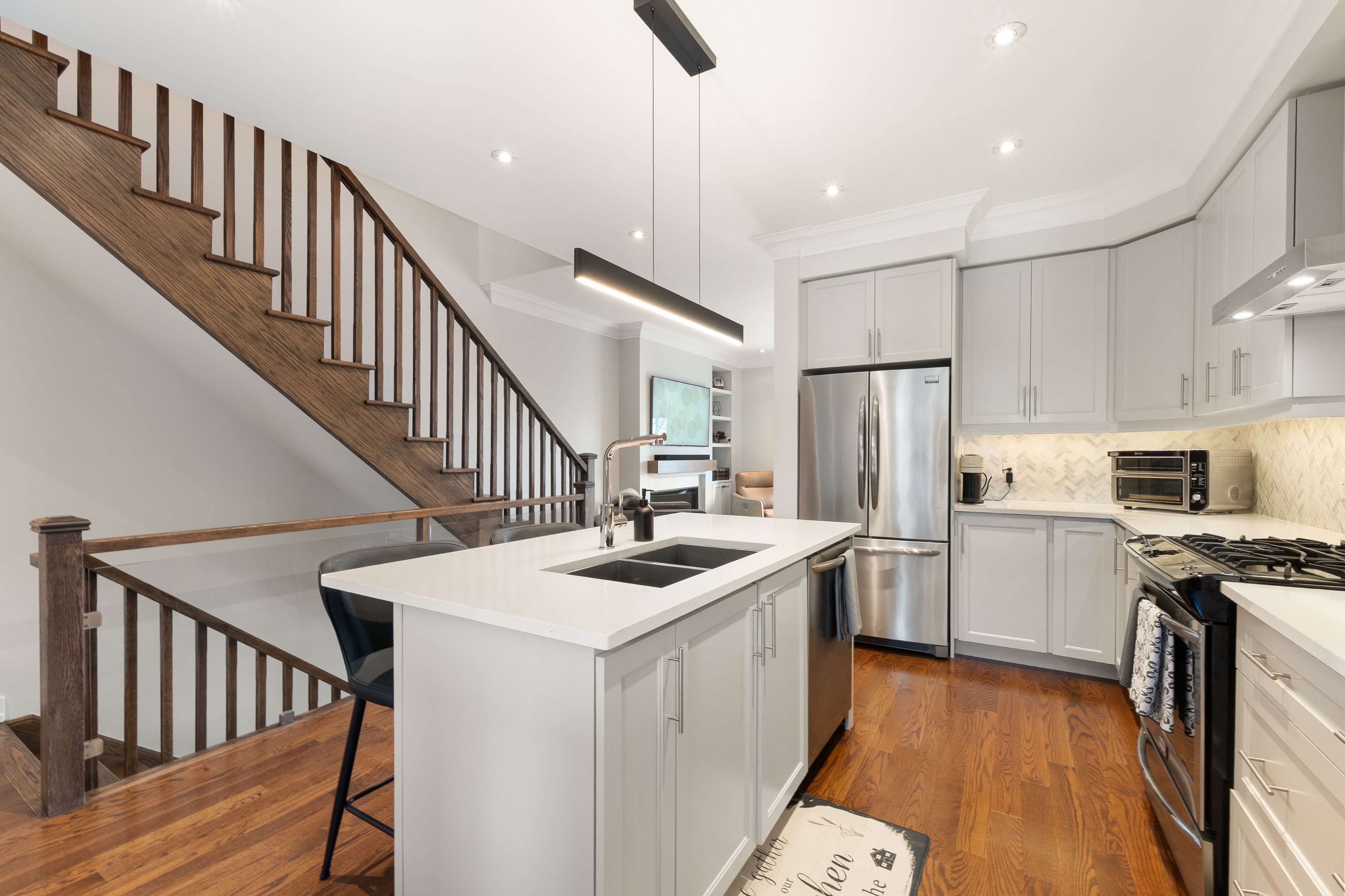 Open house sat/sun march 7th & 8th - 2-4pm. This one is special! An impeccably maintained freehold townhome (no monthly fees), cared for by the original owners. Thoughtful, refined upgrades define this home: striking glass-railed staircases, 8-ft doors on second & third floors, plaster crown moulding throughout, 9ft ceilings throughout, and bbq gas lines on patios. Chef's kitchen with marble backsplash, stone countertops, lazy susan, and top of the line ge appliances, including gas stove. The custom built electric fireplace with built-in storage cabinetry discreetly conceals tv and internet wiring, while upgraded lighting enhances the home's sophisticated ambiance. A primary bedroom with an over-sized walk-in closet and a well-appointed ensuite. Carpet-free flooring, central humidifier, and custom double blinds - including blackout shades in the bedrooms - add comfort and practicality. Enjoy interlock patios at the front and rear, two private balconies, and a pristine garage featuring an epoxied floor and built-in shelving. An elegant home where quality, care, and intelligent design come together seamlessly. Walk to maple go (30min to union station), walmart, community centres, libraries, top-rated schools, parks, cortellucci hospital, award-winning eagle's nest golf course, and hwy 400. This is affordable luxury living. Murphy bed in 3rd bedroom negotiable. See virtual tour & floor plans for room sizes.