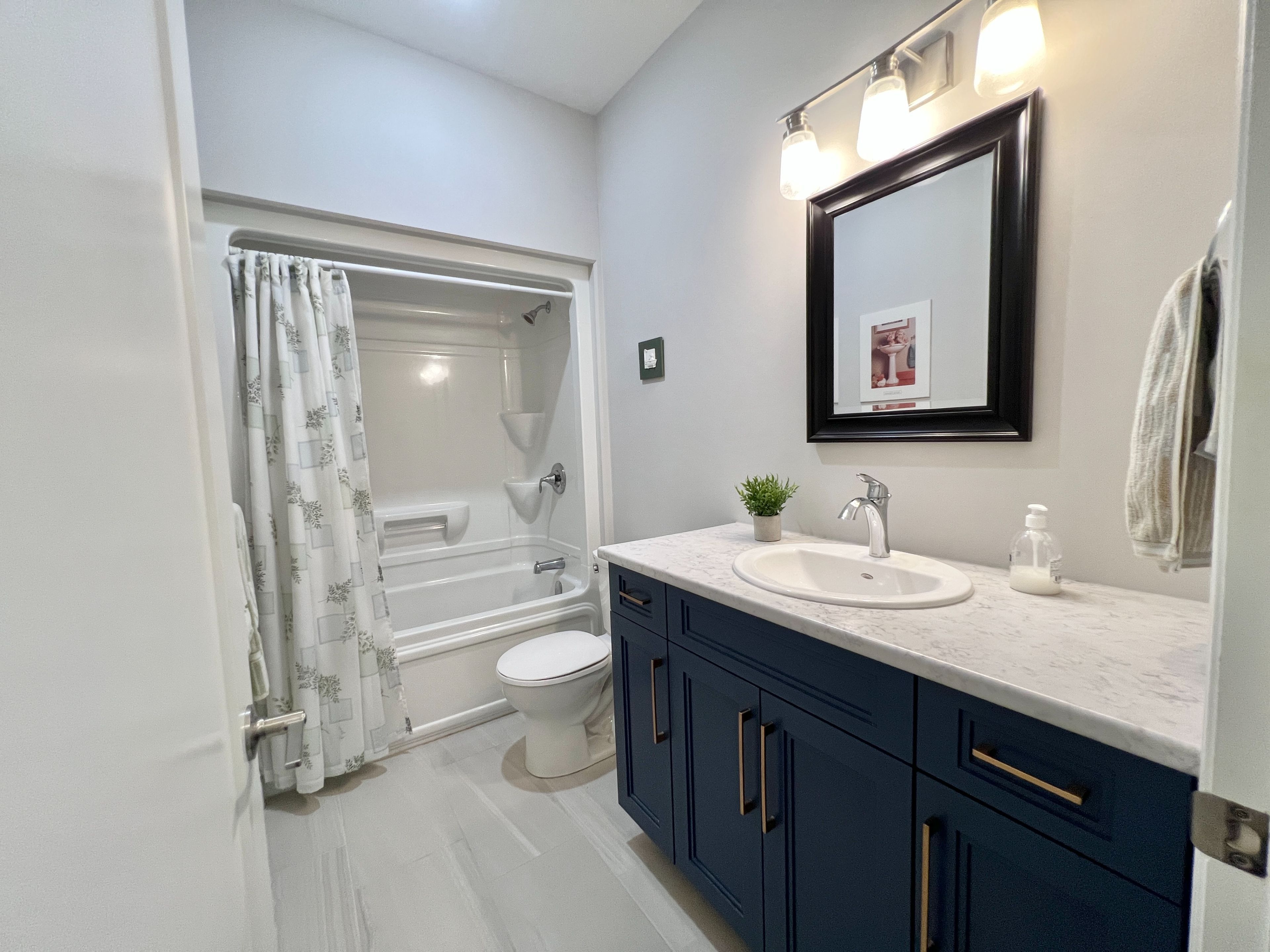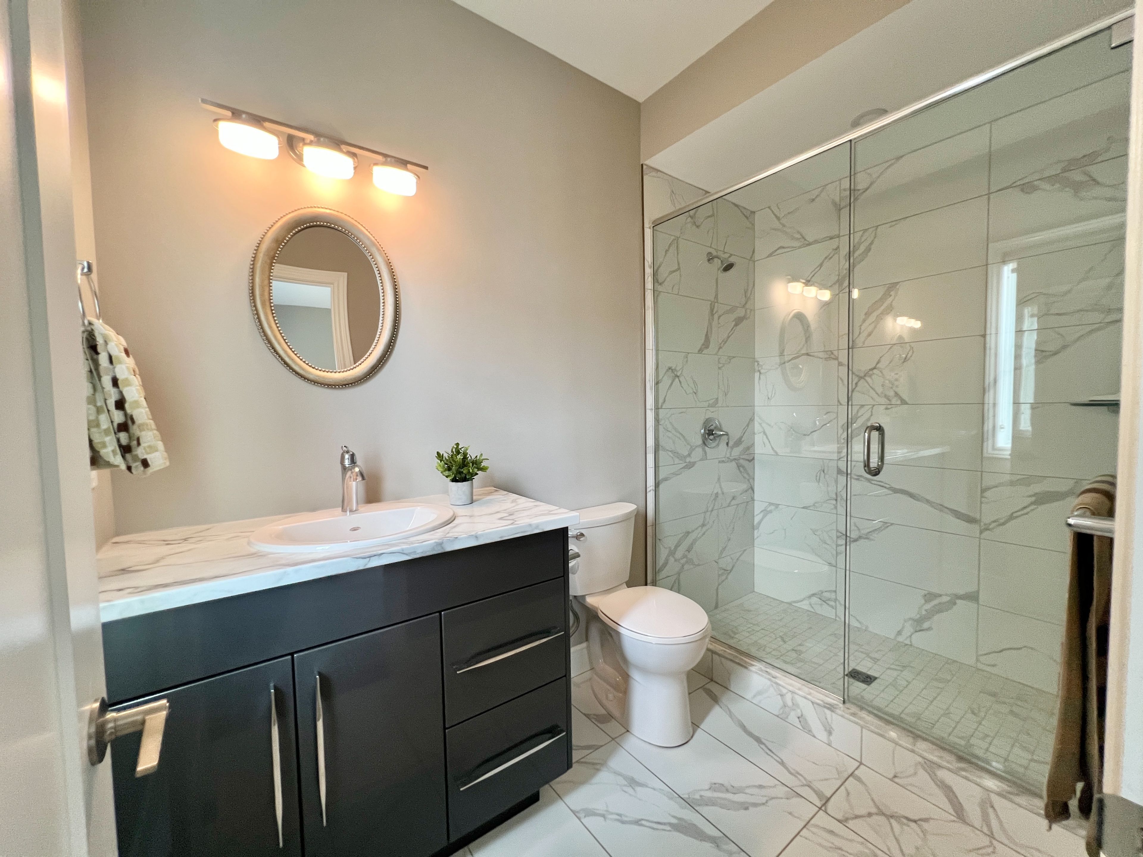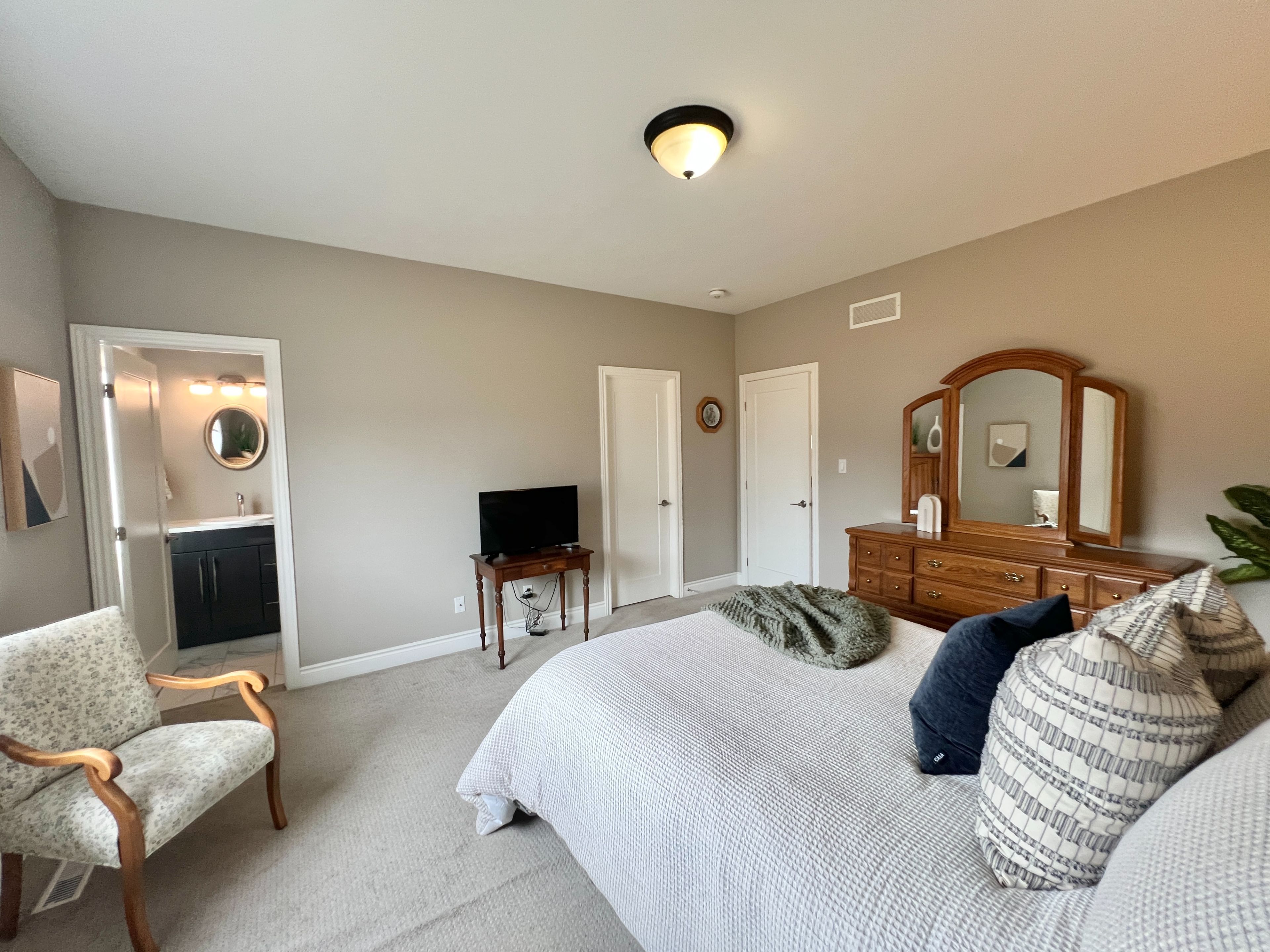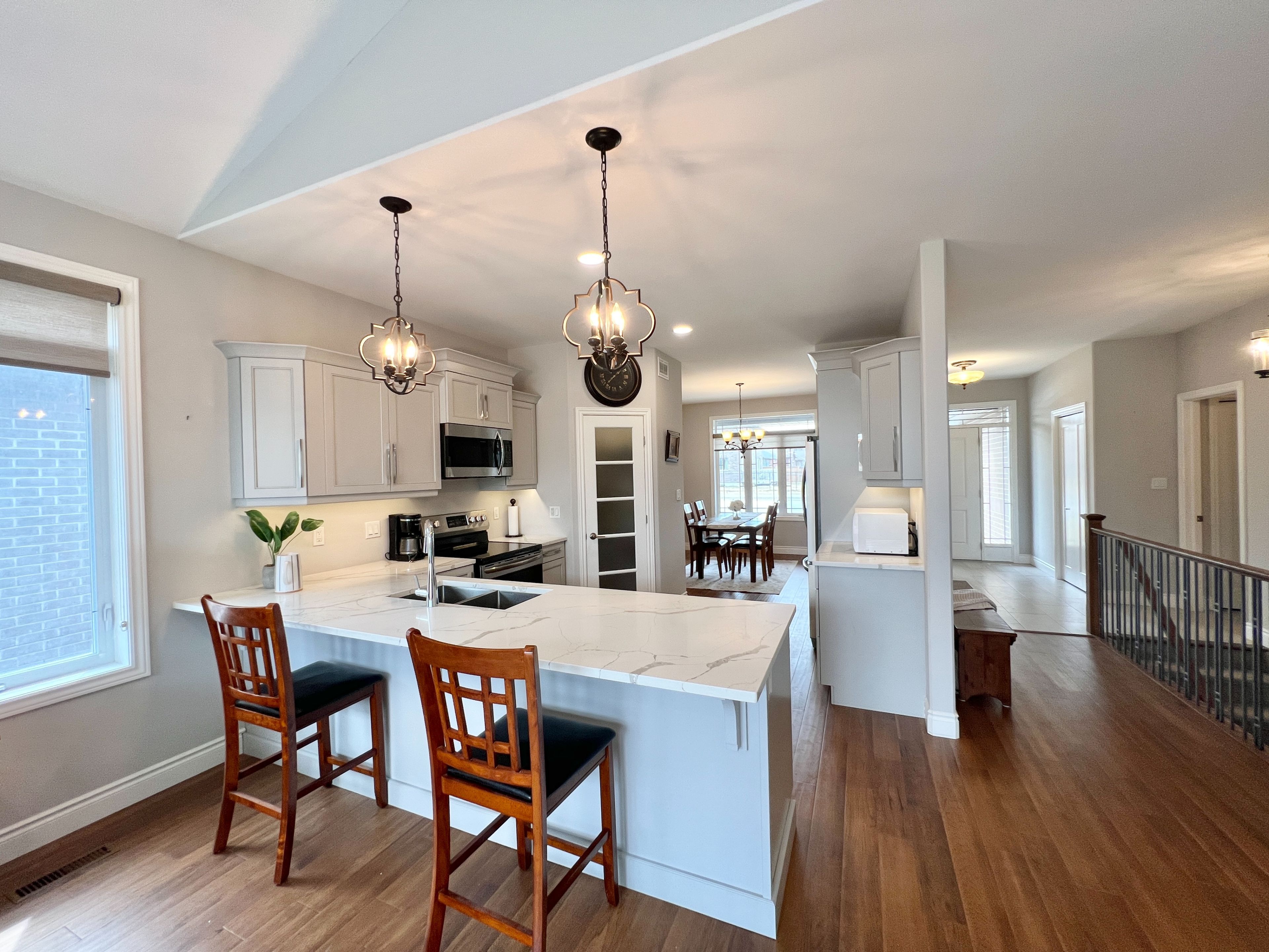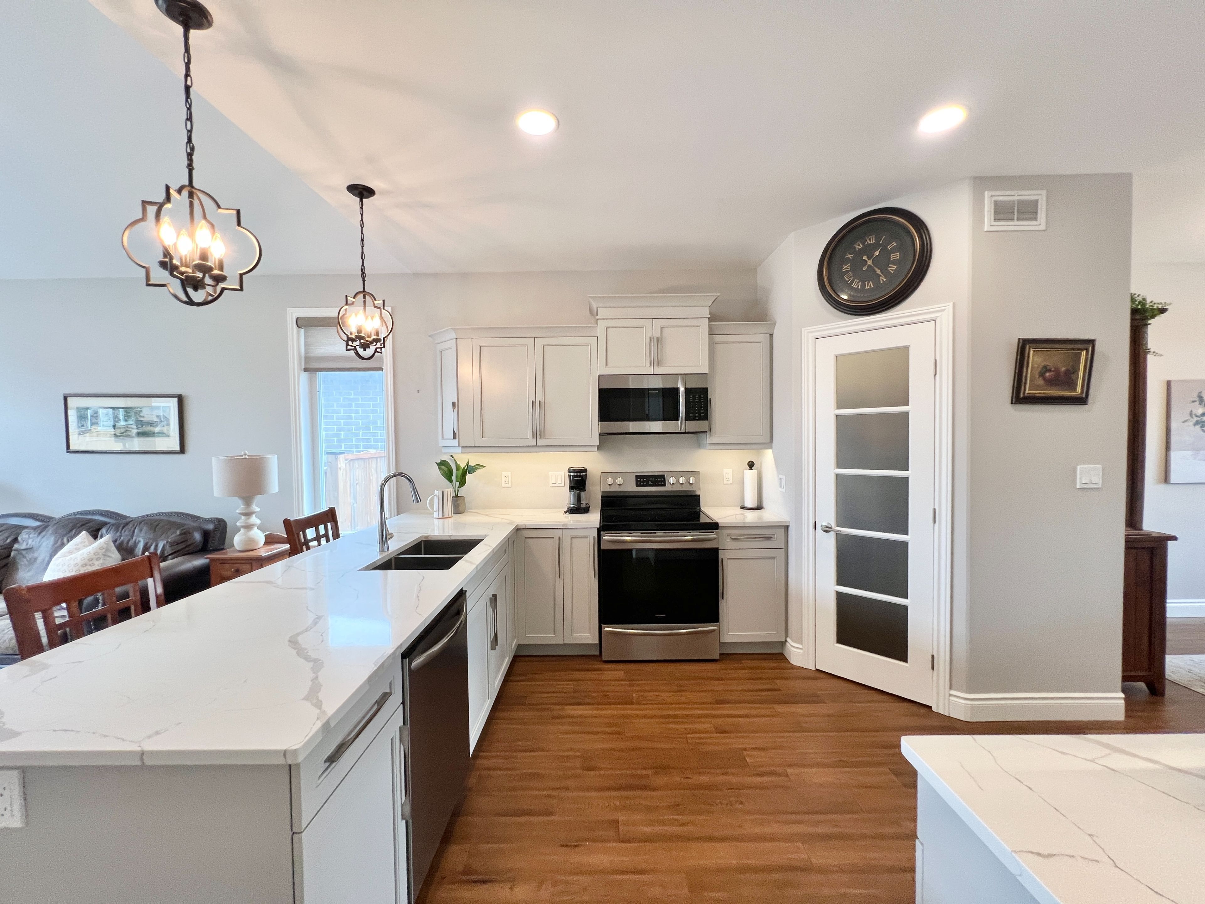 • Modern kitchen with quartz countertops and large island for gatherings.