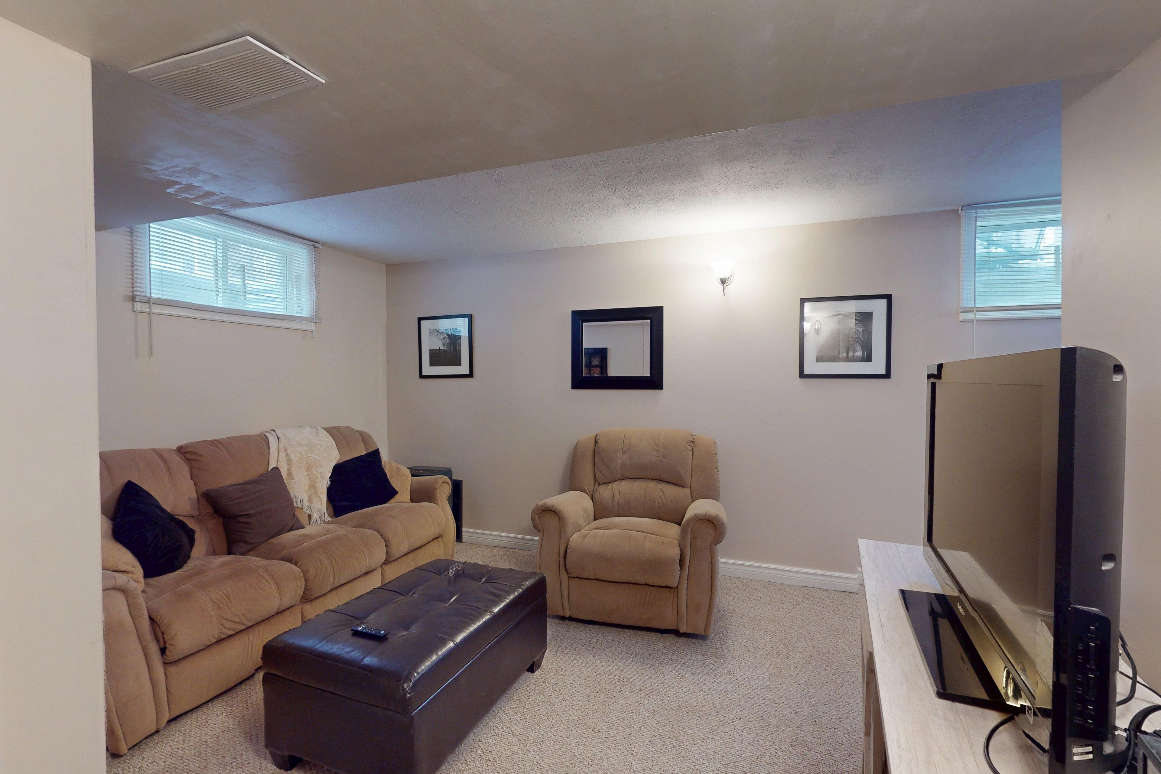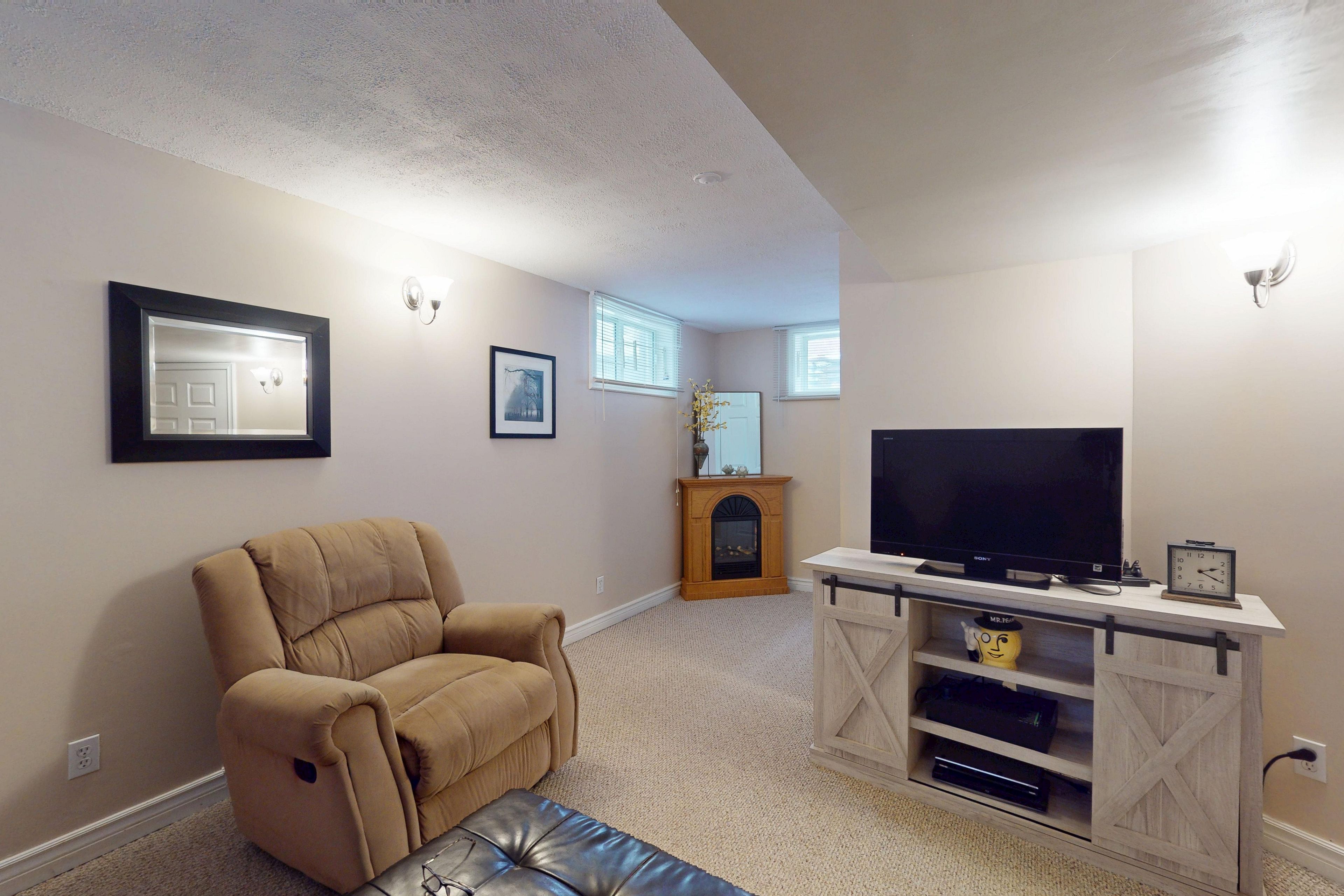 • Finished basement features a rec room, laundry, and extra storage.
