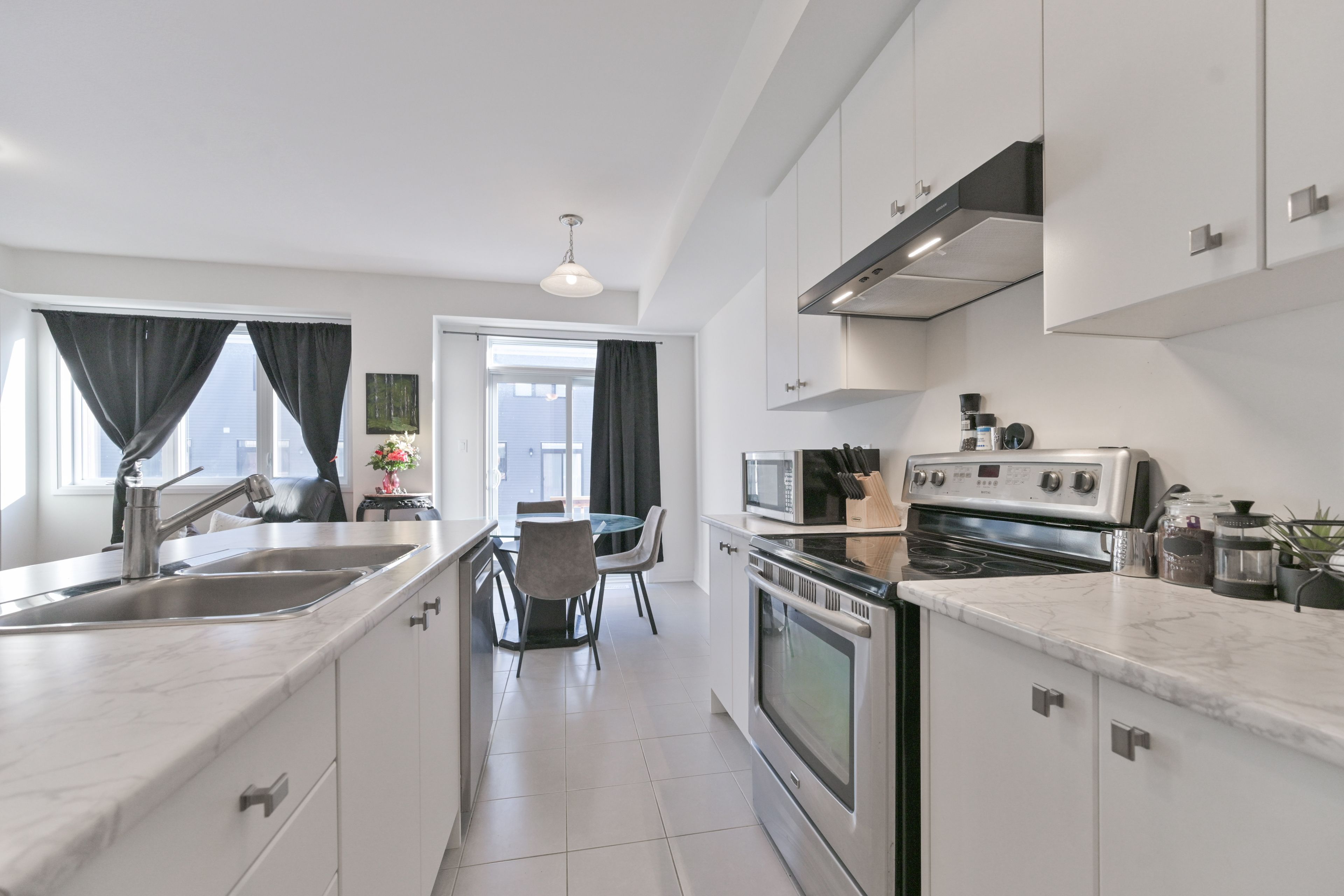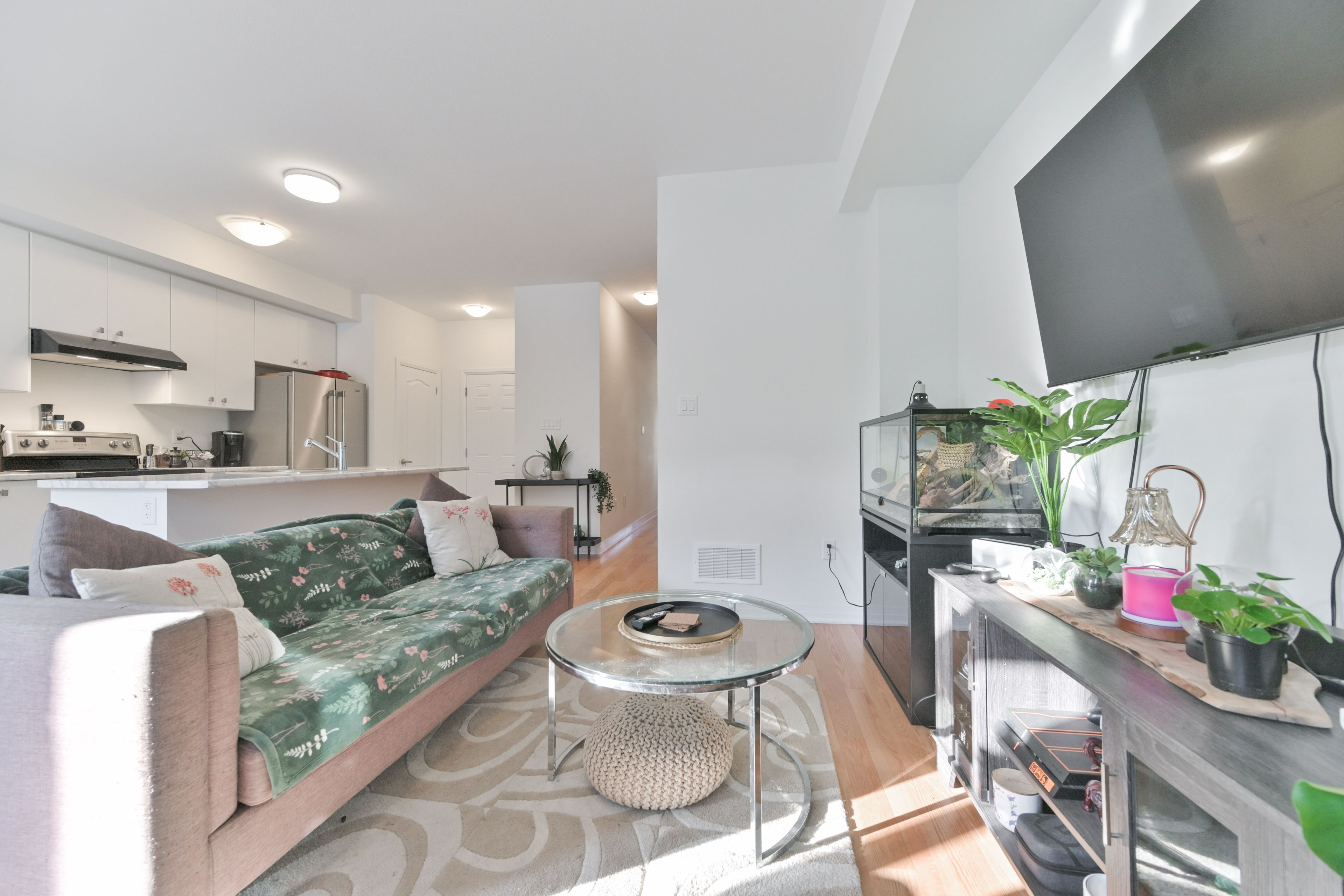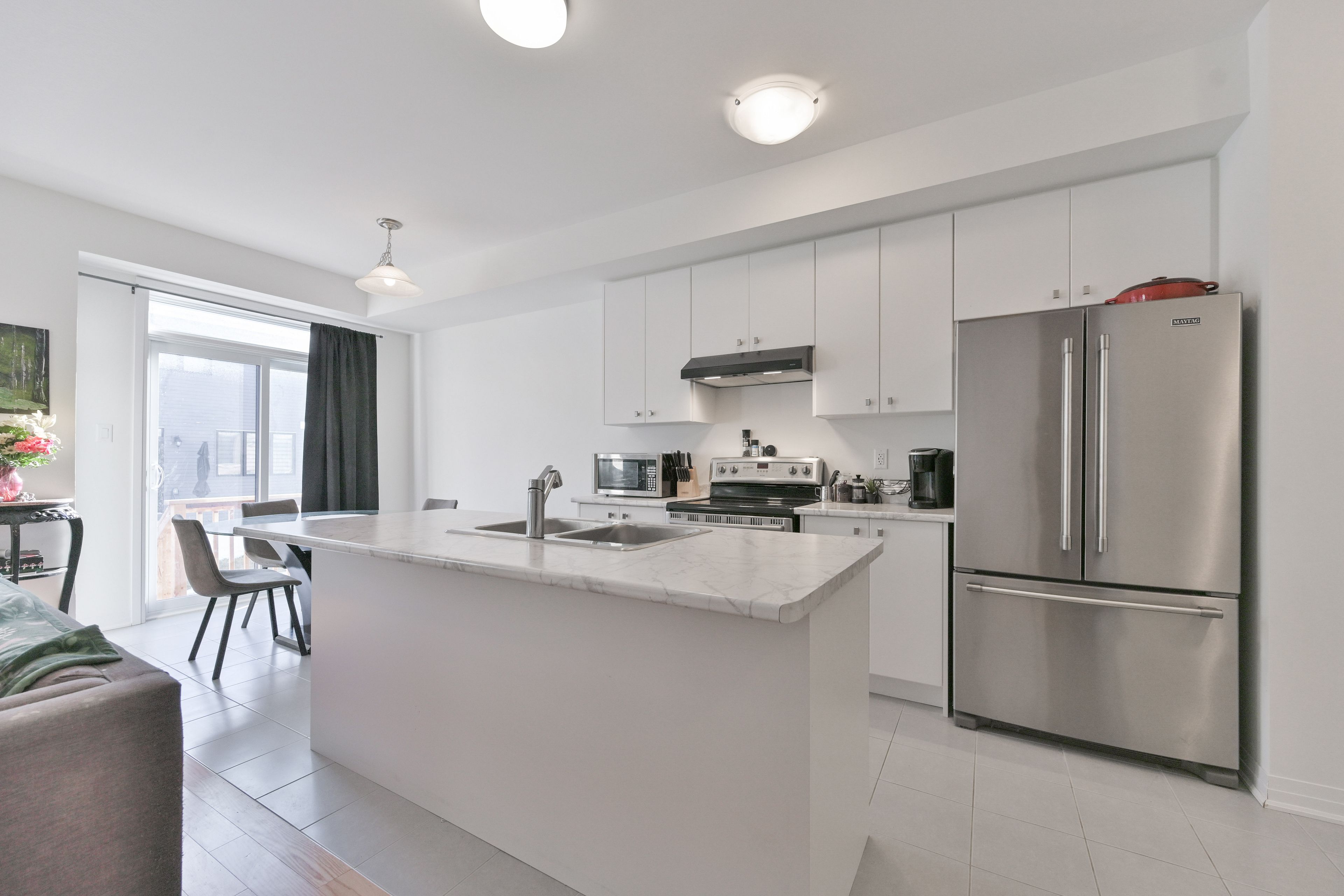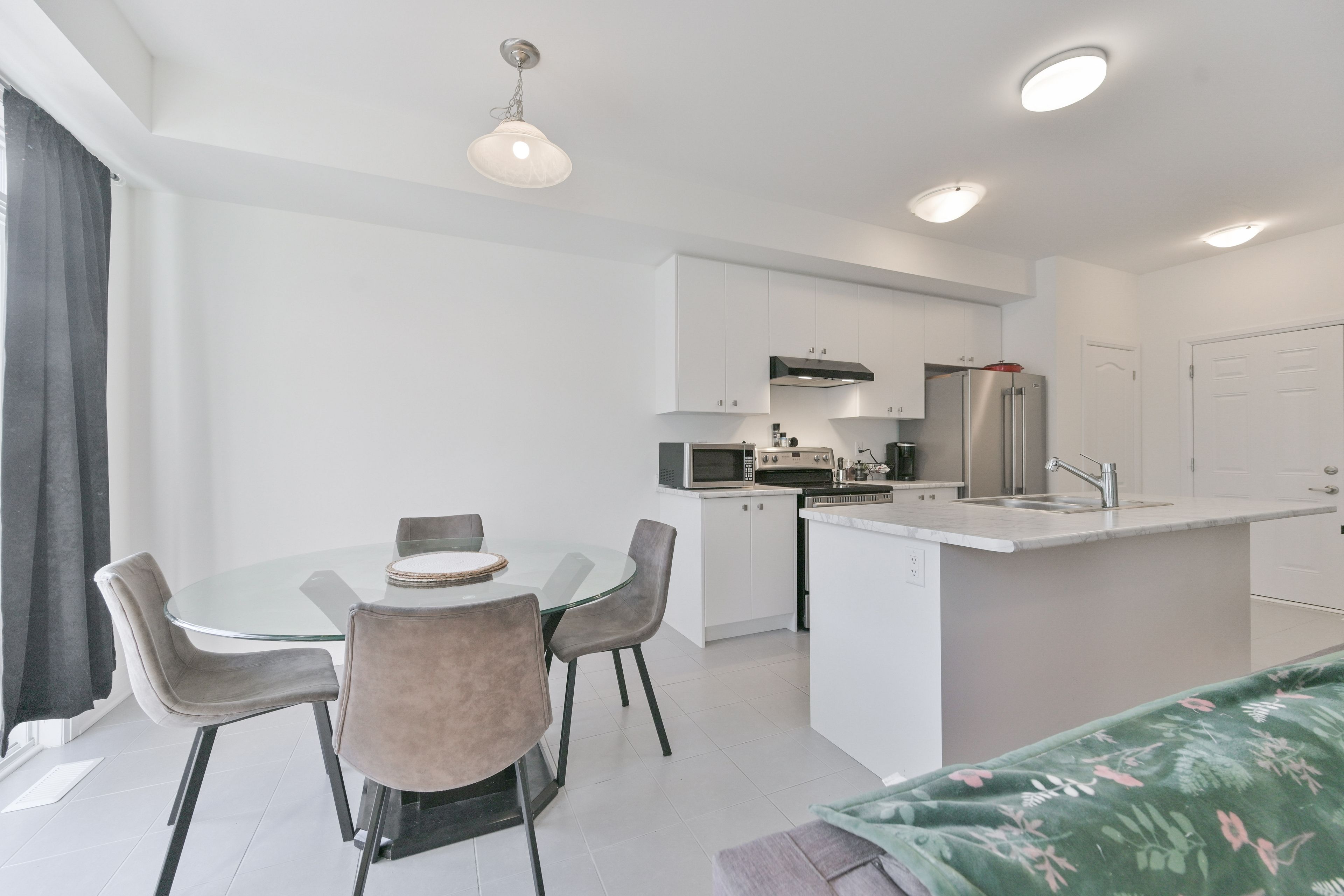 • Open-concept design with modern kitchen and stainless steel appliances.