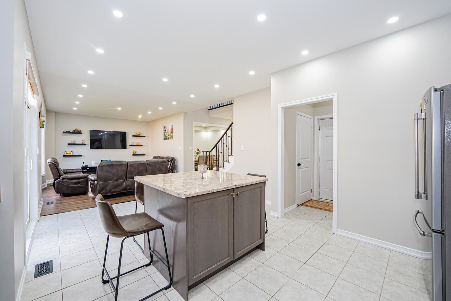 • Gourmet kitchen with stainless steel appliances and central island.