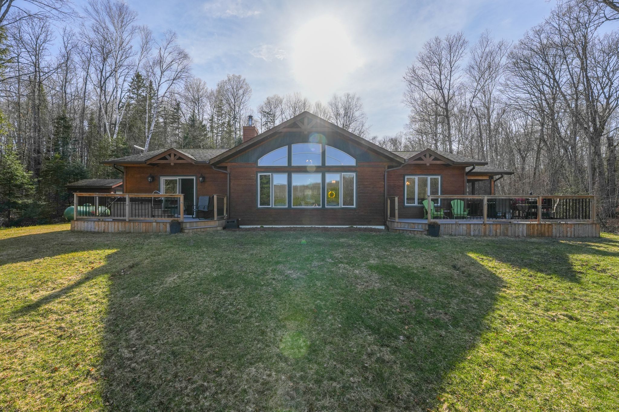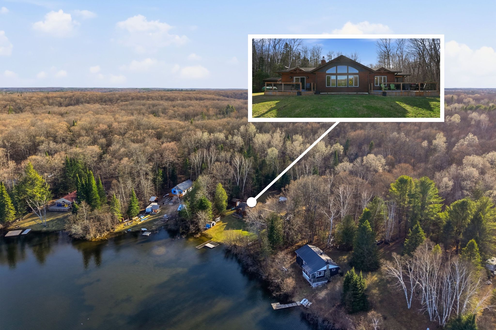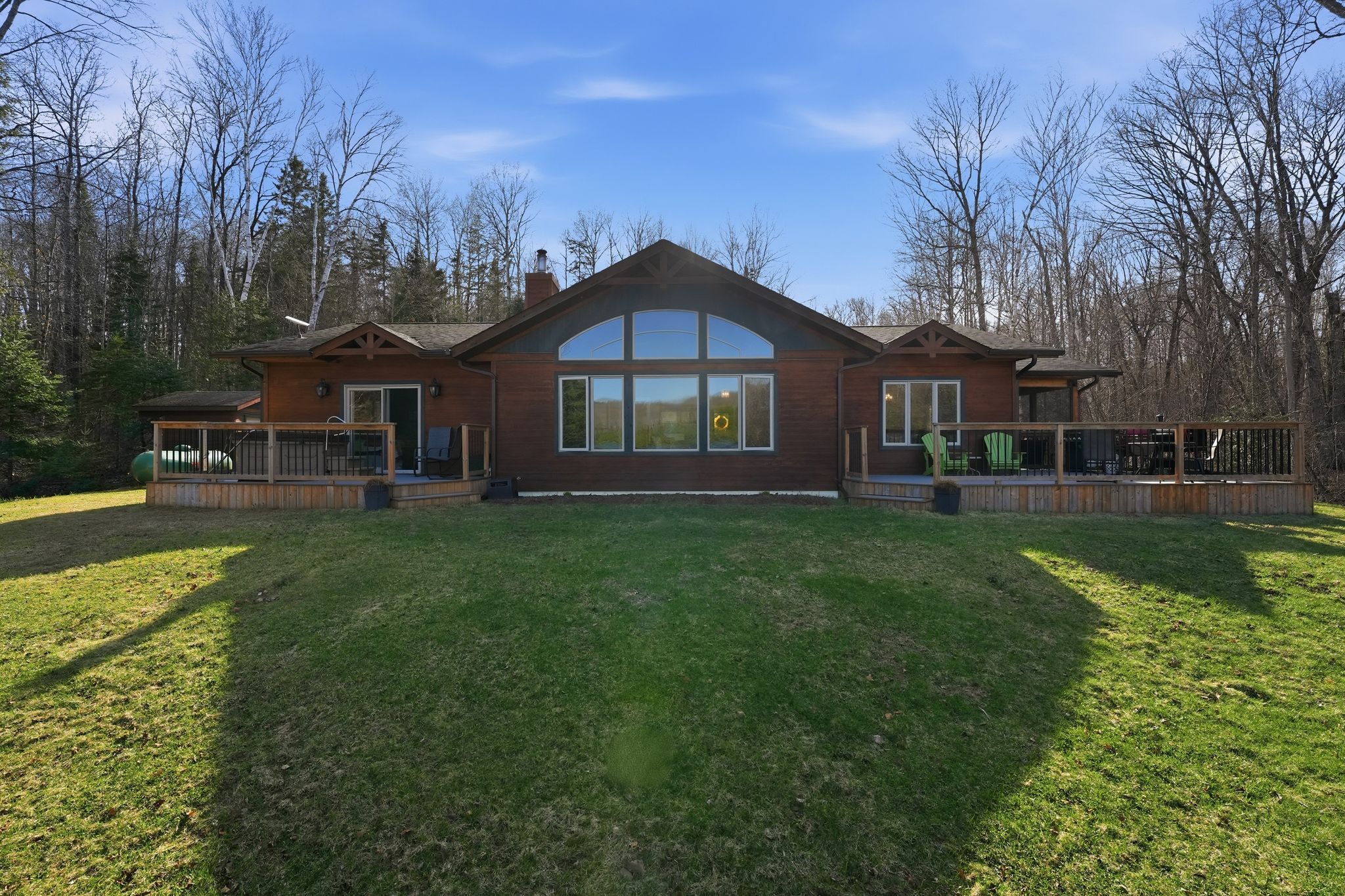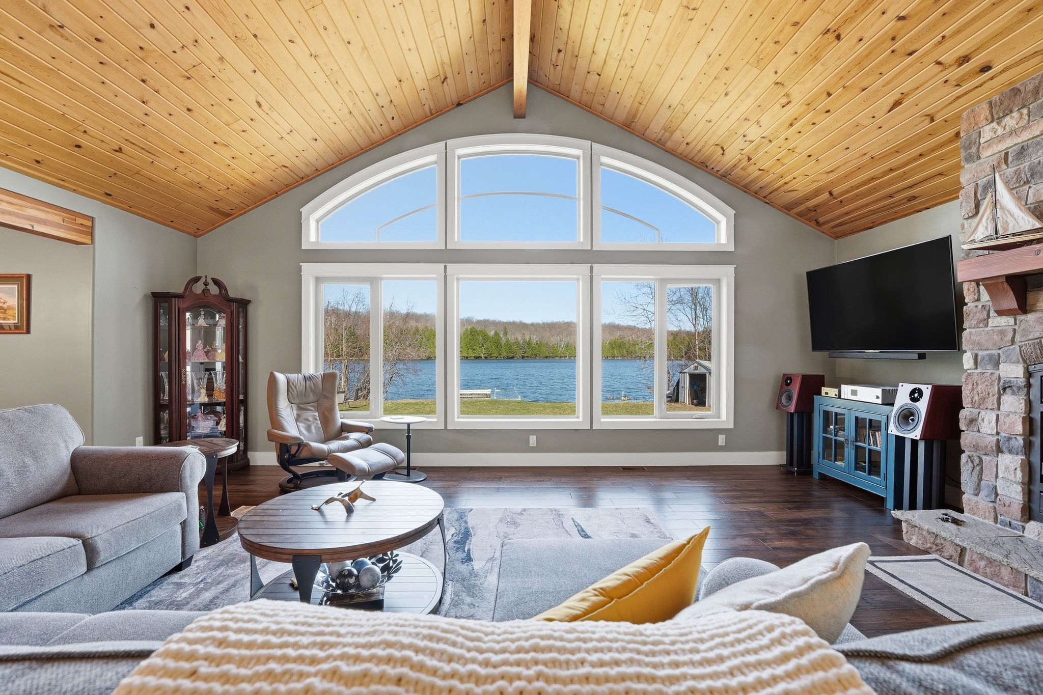 Welcome to your private lakeside waterfront retreat on beautiful vader lake-this custom-built linwood home offers the perfect lend of architectural charm, comfort, and cottage country living. Step inside and be captivated by the soaring cathedral ceilings and open-concept design, creating a bright and airy space filled with natural light from the abundance of windows throughout. The spacious living room is anchored by a stunning stone fireplace, making it the perfect place to gather and unwind. The thoughtfully designed main floor features a large primary bedroom complete with a walk-in closet and a 4-piece ensuite with patio doors leading directly to the deck and hot tub-your own private escape. And additional bedroom and 3-piece bathroom on the main level offer convenience for family and guests. The kitchen is both stylish and functional, showcasing granite countertops, professional grade appliances, quality finishes, and seamless flow into the dining and living areas. Engineered hardwood flooring and main floor laundry add to the home's everyday comfort. Enjoy the outdoors from the screened-in muskoka-style porch, ideal for relaxing bug-free summer evenings, or step outside and take in the peaceful surroundings. Enjoy the maintenance free composite decks & l-shaped decks & swim raft. Adding even more value is the charming bunkie with hydro, perfect for guests, extra sleeping space or a cozy retreat.