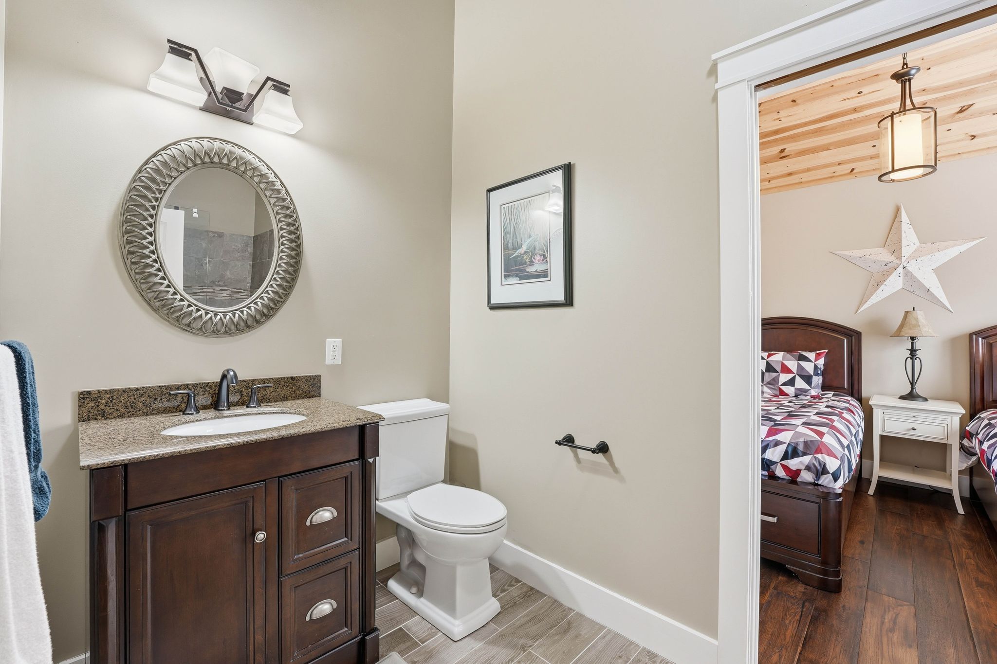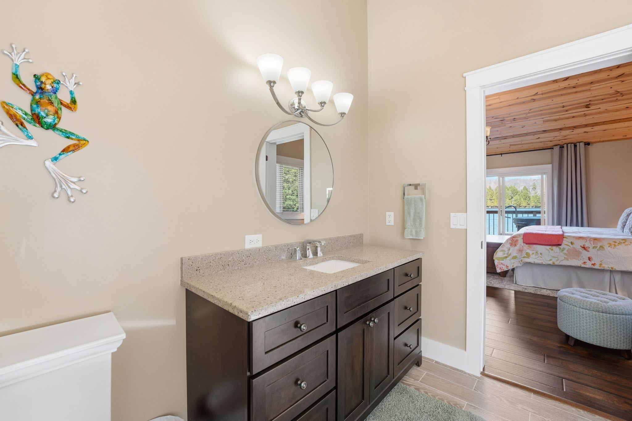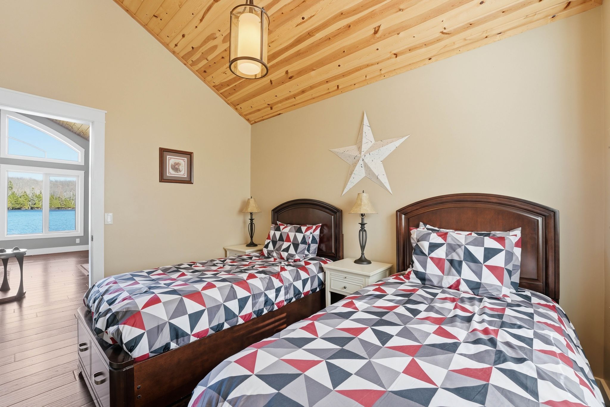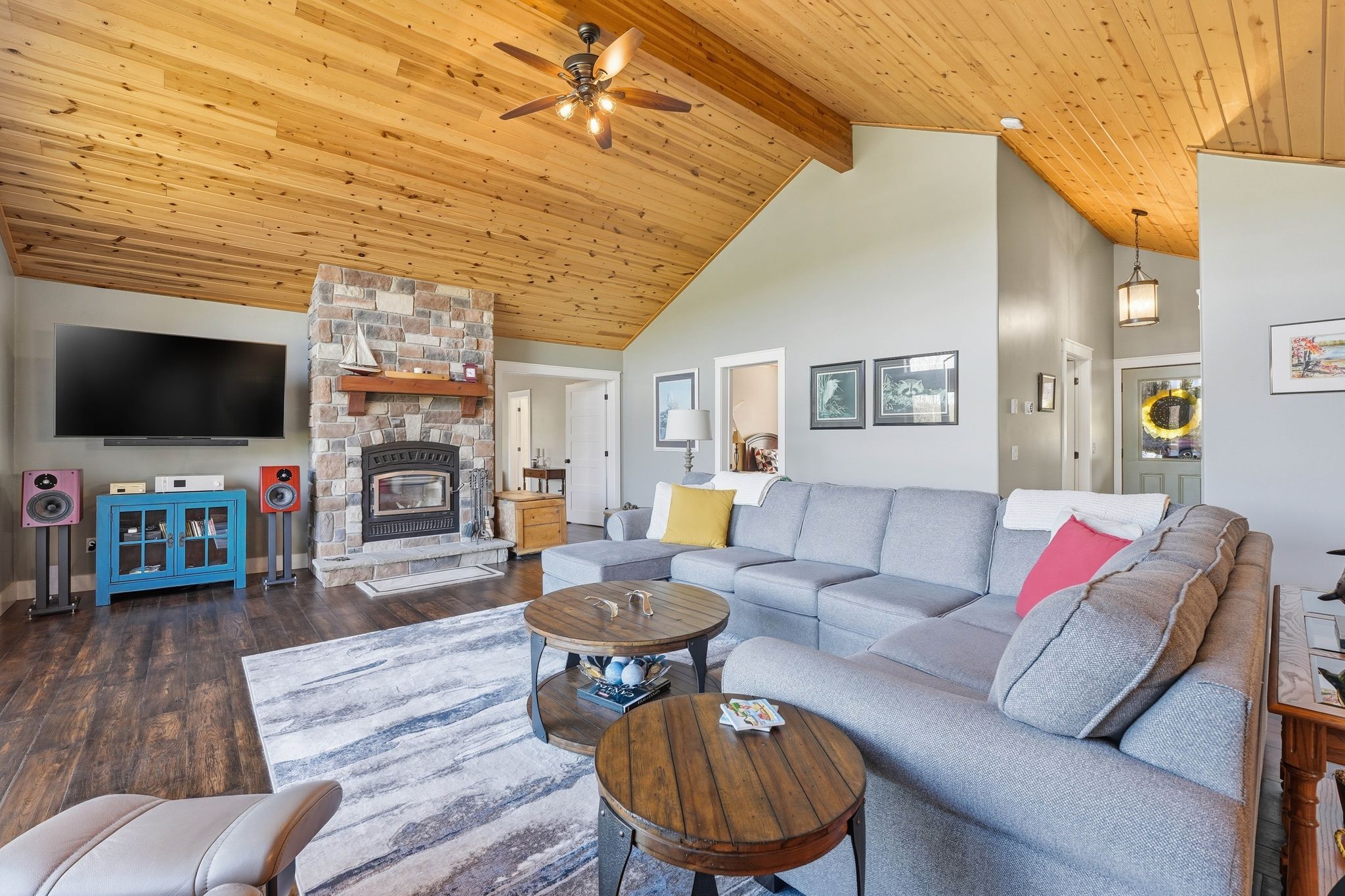 Welcome to your private lakeside waterfront retreat on beautiful vader lake-this custom-built linwood home offers the perfect lend of architectural charm, comfort, and cottage country living. Step inside and be captivated by the soaring cathedral ceilings and open-concept design, creating a bright and airy space filled with natural light from the abundance of windows throughout. The spacious living room is anchored by a stunning stone fireplace, making it the perfect place to gather and unwind. The thoughtfully designed main floor features a large primary bedroom complete with a walk-in closet and a 4-piece ensuite with patio doors leading directly to the deck and hot tub-your own private escape. And additional bedroom and 3-piece bathroom on the main level offer convenience for family and guests. The kitchen is both stylish and functional, showcasing granite countertops, professional grade appliances, quality finishes, and seamless flow into the dining and living areas. Engineered hardwood flooring and main floor laundry add to the home's everyday comfort. Enjoy the outdoors from the screened-in muskoka-style porch, ideal for relaxing bug-free summer evenings, or step outside and take in the peaceful surroundings. Enjoy the maintenance free composite decks & l-shaped decks & swim raft. Adding even more value is the charming bunkie with hydro, perfect for guests, extra sleeping space or a cozy retreat.