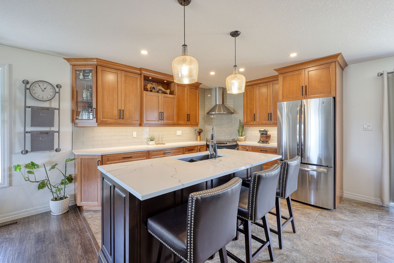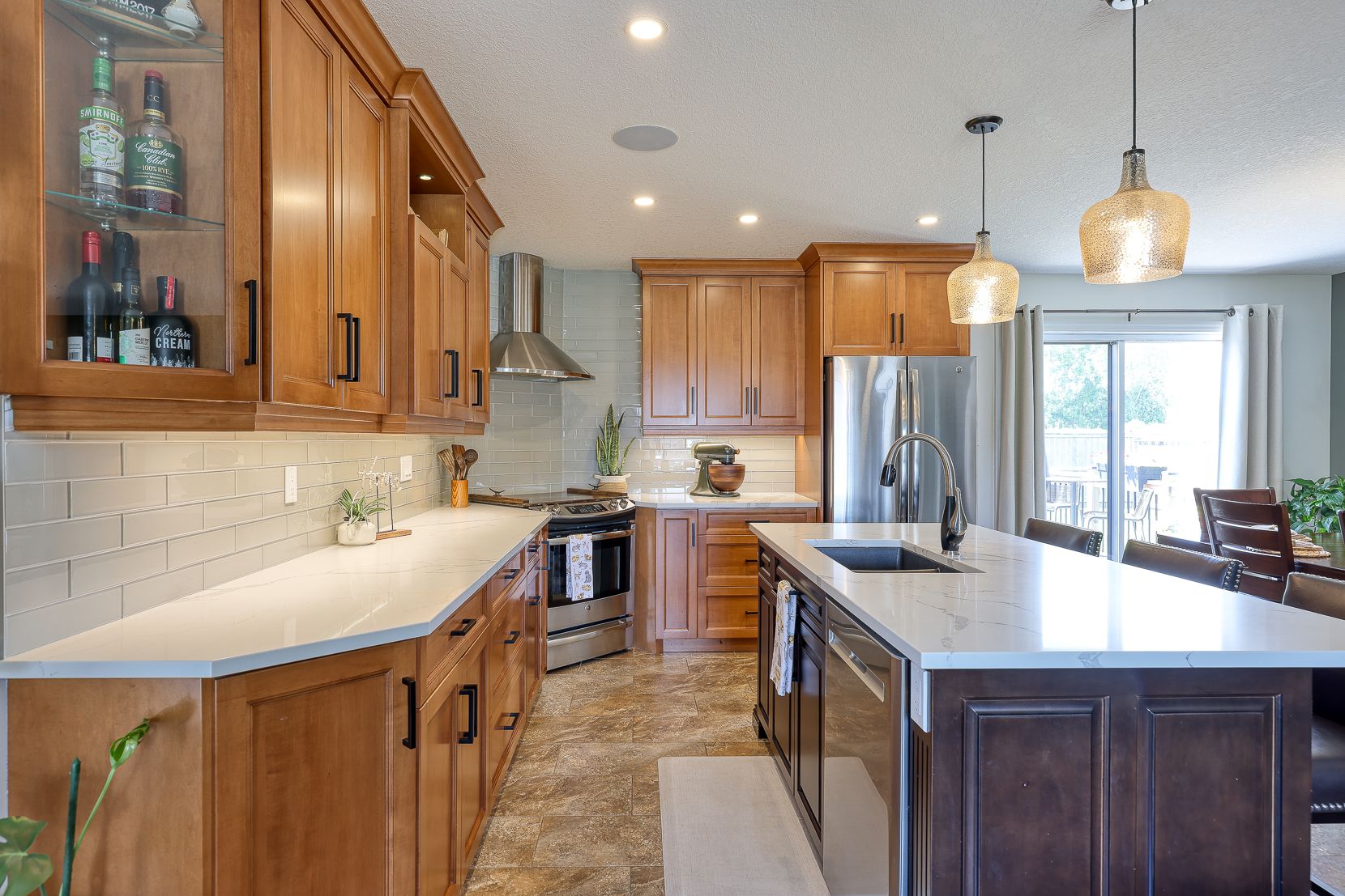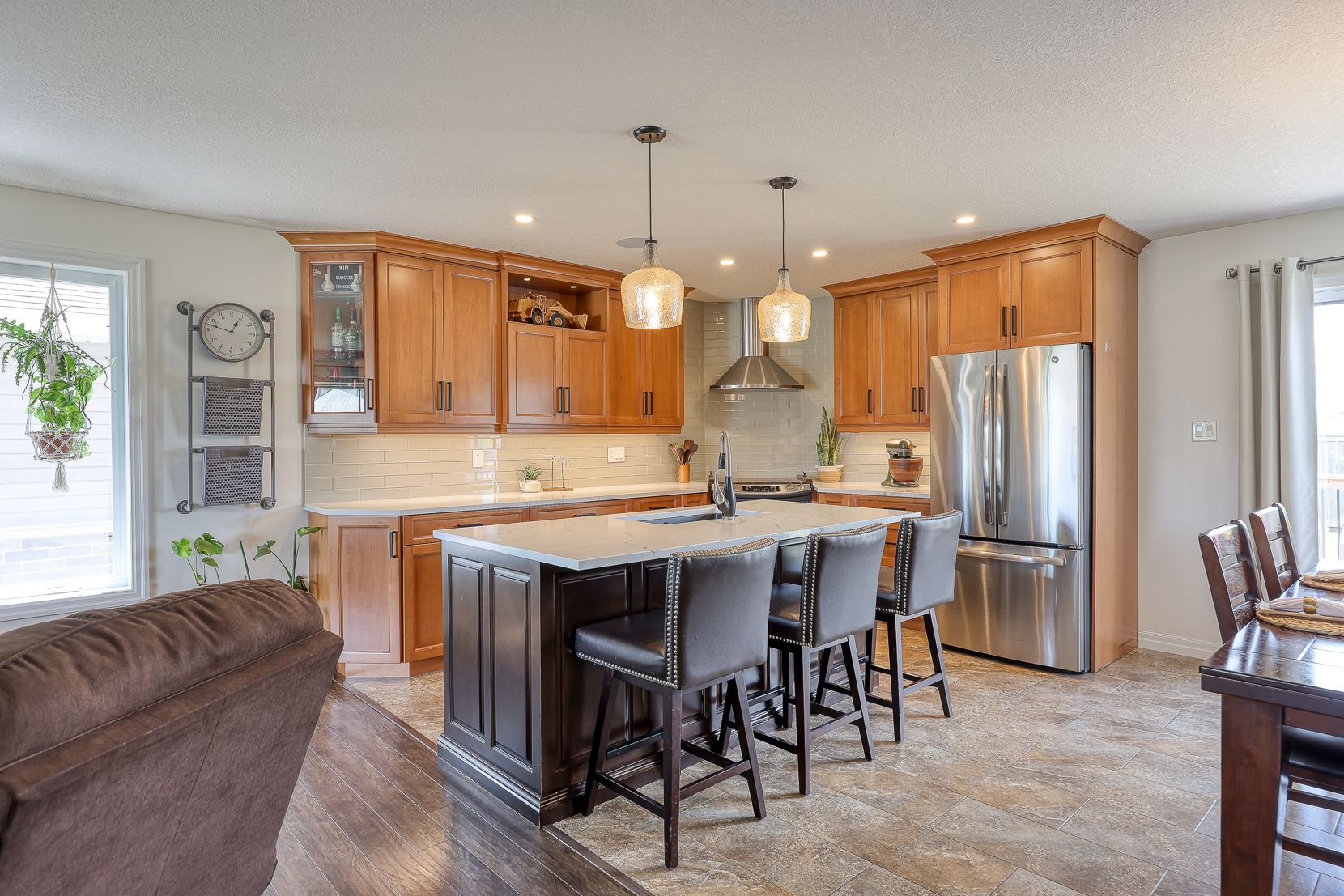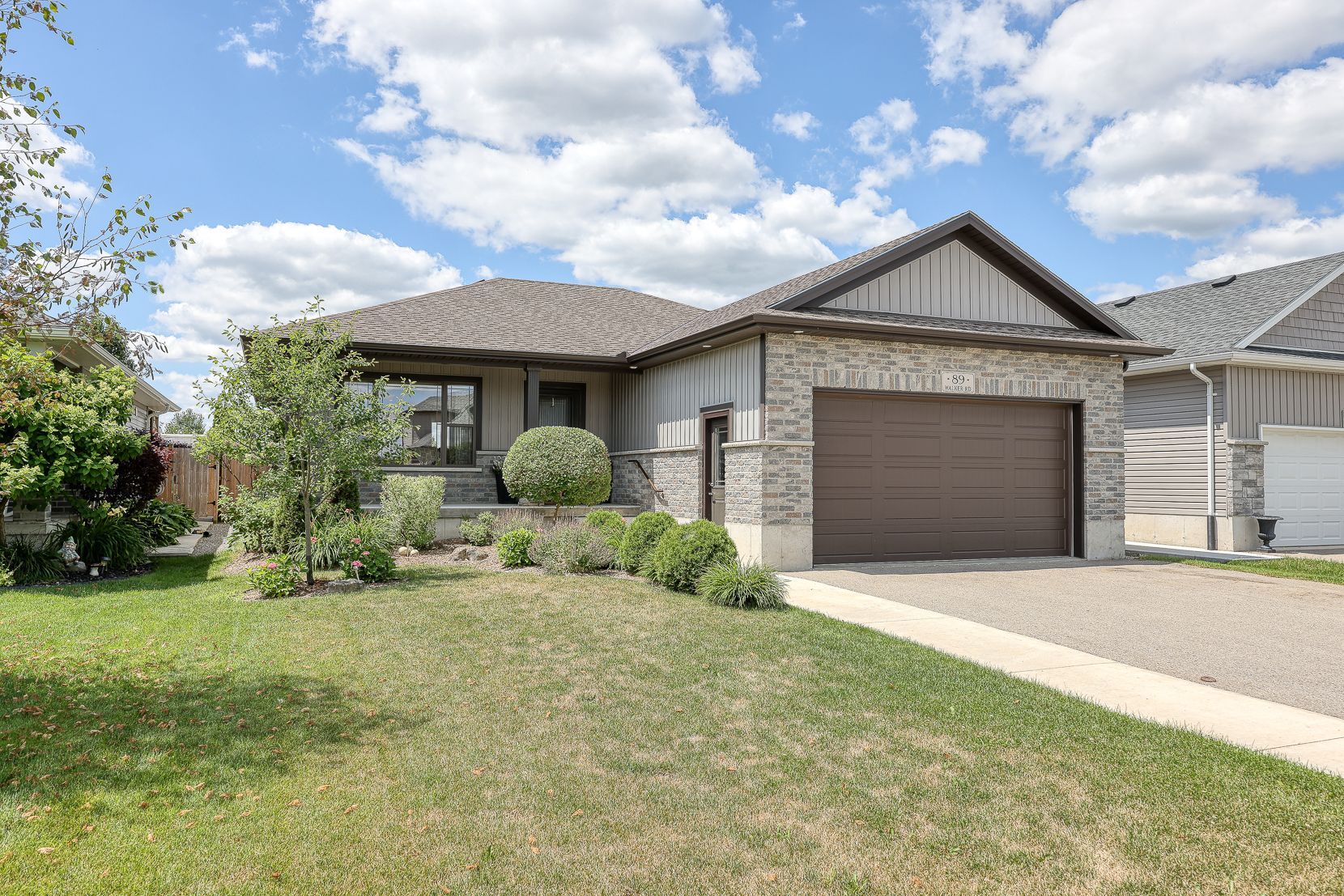 Welcome to 89 walker road! This beautifully maintained brick bungalow is nestled in a picturesque, family-friendly neighborhood and offers over 2,500 sq ft of finished living space perfect for those seeking both comfort and style. Just 9 years young, this home is move-in ready and filled with thoughtful details throughout. Step onto the charming front porch ideal for morning coffee or tea and come inside to a sun-drenched living room with stunning floor-to-ceiling windows and gleaming luxury plank wood flooring. The heart of the home is a custom-designed kitchen featuring rich maple cabinetry, brand new quartz countertops, a sleek glass backsplash, updated lighting, and a large island with breakfast bar. Stainless steel appliances are included, making this kitchen both functional and beautiful. Entertain with ease in the separate dining room, offering ample space for holiday dinners or casual get-togethers. Down the hall, the gorgeous primary bedroom serves as a peaceful retreat with a spacious walk-in closet and a spa-like ensuite, complete with a custom maple vanity, double sinks, and an oversized shower. A second bright and spacious bedroom and a stylish laundry/mud room w/ access to heated garage complete the main floor. The lower level is a showstopper- bright, expansive, and freshly updated with new modern plank flooring, trim, paint, and a brand new 3-piece bathroom (professionally finished!). Cozy up in the large family room with a beautiful gas fireplace framed by a stone façade, and enjoy the extra space for a pool table, playroom, or home gym. Two additional generously sized bedrooms with large windows and plenty of closet space round out this level. Outside, you'll find a fully fenced backyard, perfect for summer barbecues on the huge deck. A fantastic new oversized shed adds even more value and storage. Meticulously cared for, warm, and full of character, this home is truly a must-see!