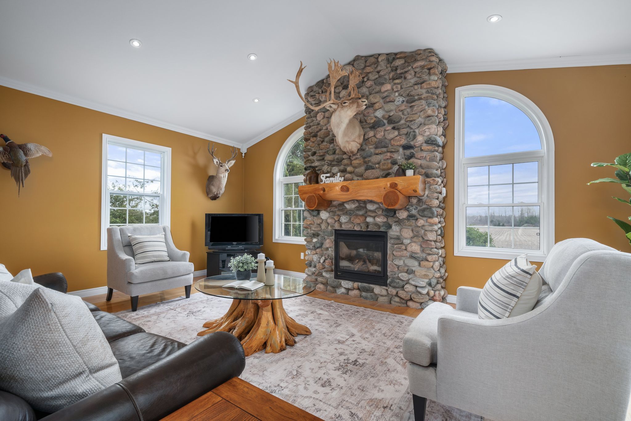 This two-storey brick farmhouse is the country retreat you have been searching for, for your family. Located on a hard top road close to the quaint village of woodville between lindsay & beaverton this 93-acre reproduction farm house (2001) features a stunning 30 x 20 great room, 4 spacious bedrooms, 2 full baths, and a main floor office. Other features of the home include a wrap around porch, open concept kitchen/ dining room , two walk outs to a private deck, and main floor laundry. Partially finished basement with a walk-up to a private park like setting with perennial gardens and open farm fields . The property also includes a 29' x 70' commercial shop with a 24' x 40' portable addition, heated by both a pellet stove and a new propane furnace (2025). This high-visibility location is ideal for a family business, with the current successful operation having thrived here for many years. 50 acres of fertile, high producing otonabee loam and approximately 38 acres of mixed bush. Solar panels provide passive income of approx $11,000 annually for the remainder of the contract. Just over an hours drive from the g. T. A. For an easy commute!