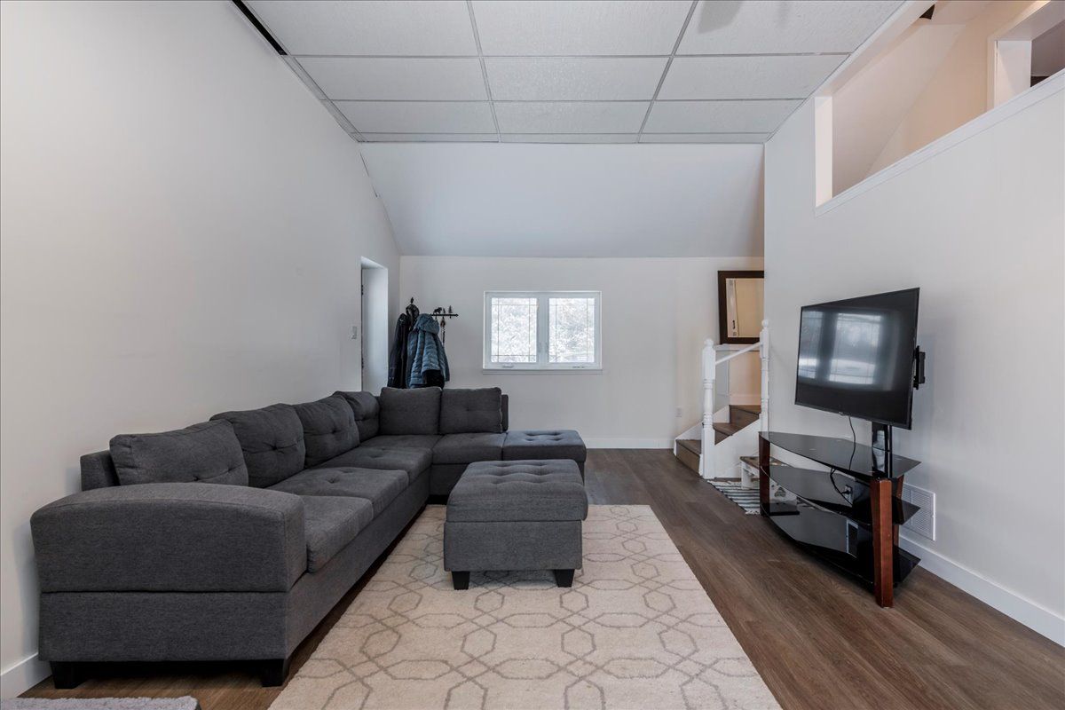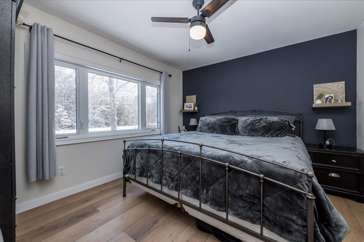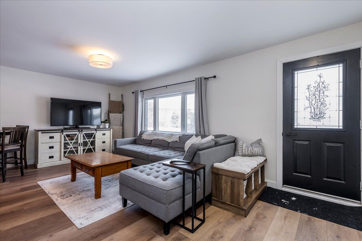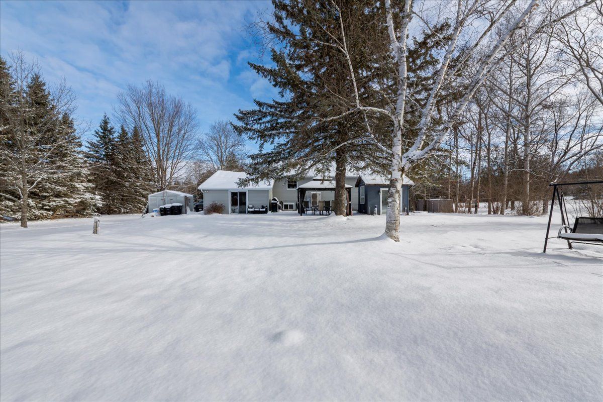 This charming bungalow sits on just over three-quarters of an acre at the edge of angus and has been fully renovated with modern comfort and style in mind. Recent upgrades include a new heat pump, ac, and furnace installed in 2021 at a value of $20,000, as well as new siding, fascia, soffit, and eaves completed in 2025 and the roof is approximately eight years old. The home features new flooring throughout, a brand-new kitchen with quartz countertops and a subway-tile backsplash, and stainless-steel appliances including a propane stove. The open-concept main floor offers two spacious living areas filled with natural light, complemented by updated lighting, doors, and trim. The mostly finished basement provides additional living space with a dedicated man cave and a third bedroom. Outside, the property includes two sheds both with power, one with a newly installed roof, a gas barbeque line so you will never need to get propane. This beautifully updated home blends modern finishes with a generous lot, offering comfort, style, and room to grow.